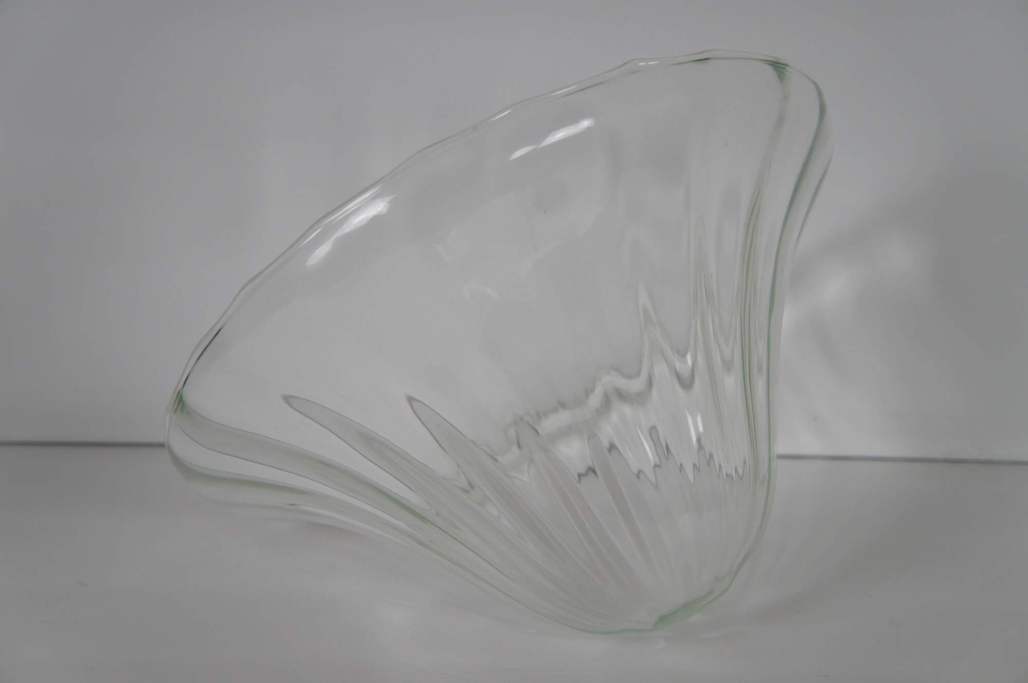Hand crafted glass centerpiece bowl gently rippling texture, standing on a trio of silver painted metal acanthus leaves on a silver and black pedestal base.