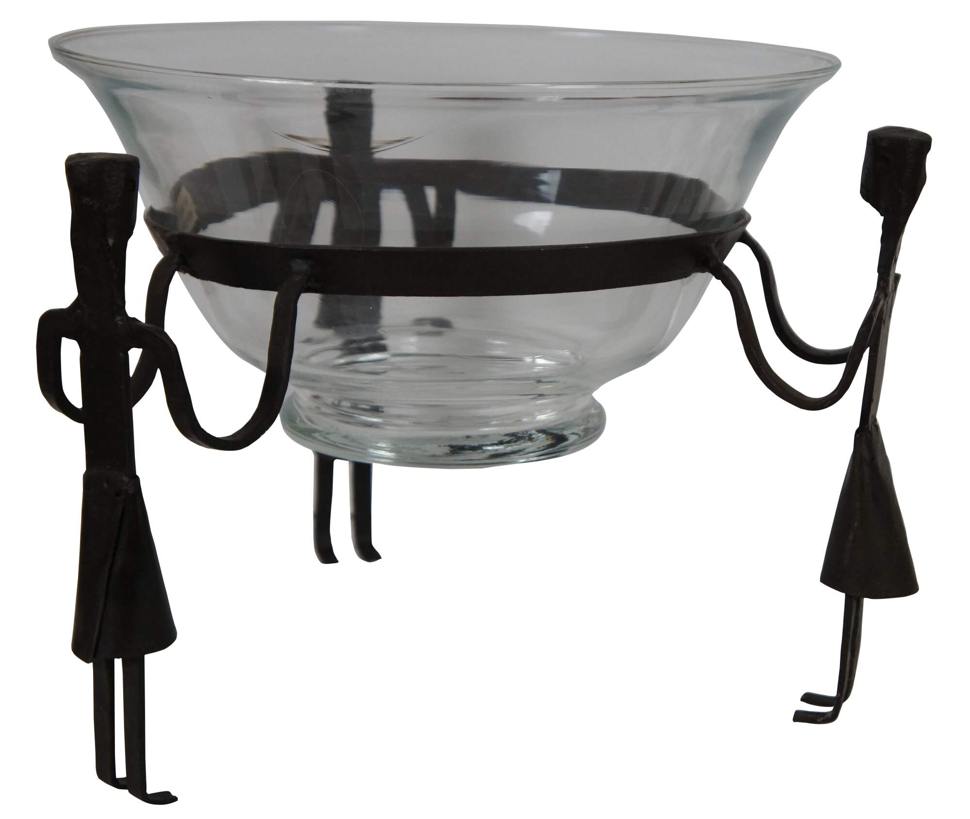 Glass bowl centerpiece on a wrought iron stand held by three semi-abstract figures. Handcrafted in Portugal for Great City Traders. Great for use as a centerpiece, candy or nut dish on a buffet or dining table.