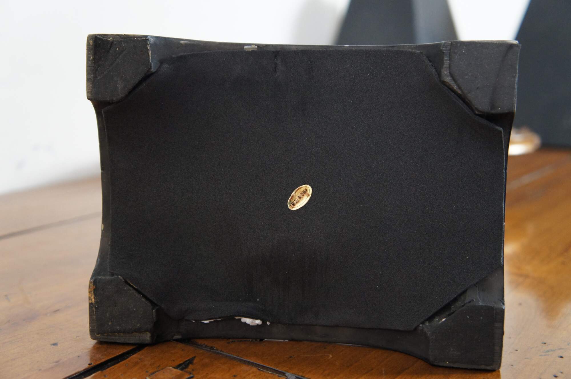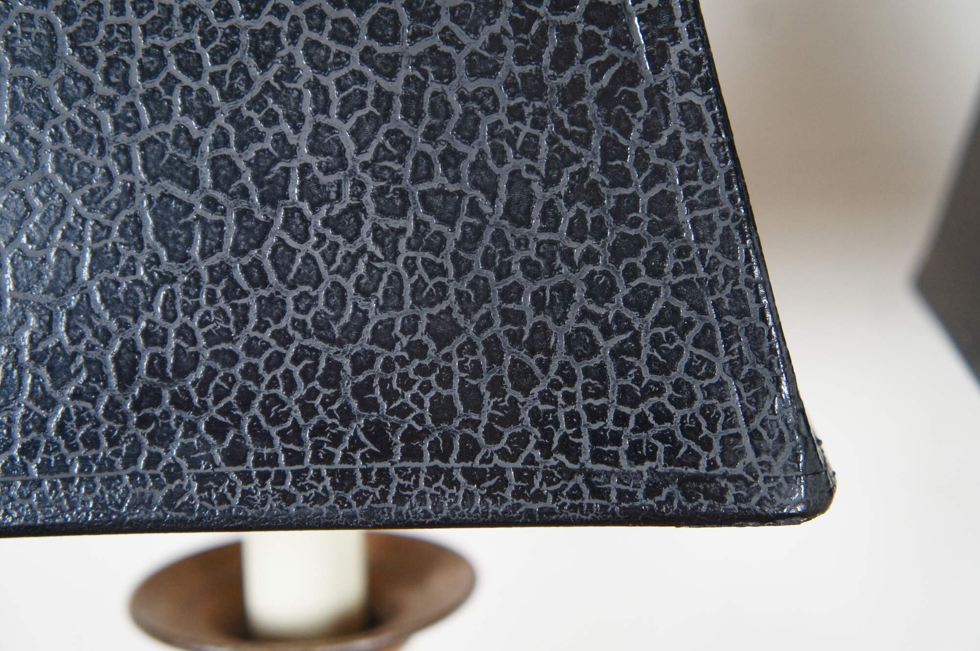 Vintage Uttermost black and gold French style candelabra table lamp with two candle or candlestick lights and double black crackle finish shades.