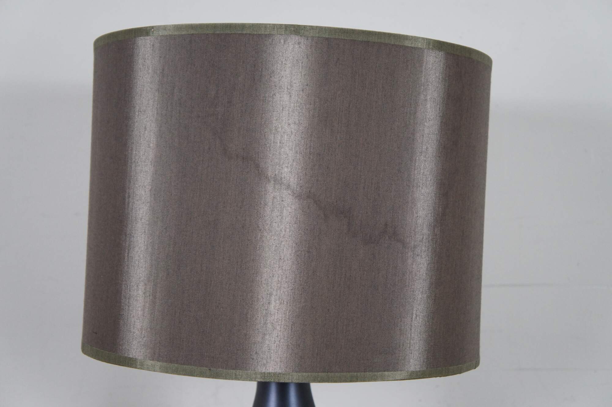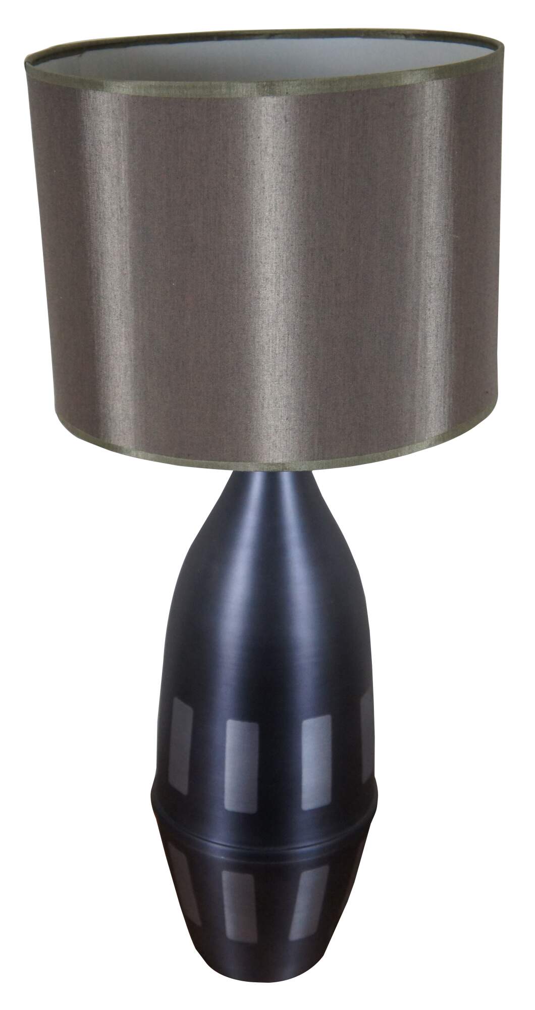 Vintage Babette Holland spun metal Juggler table lamp in graphite gray with geometric accents and an olive brown shade. The Juggler table lamp gets its name from its shape, which is similar to the pins juggled by a jester or clown. Style TL-32.