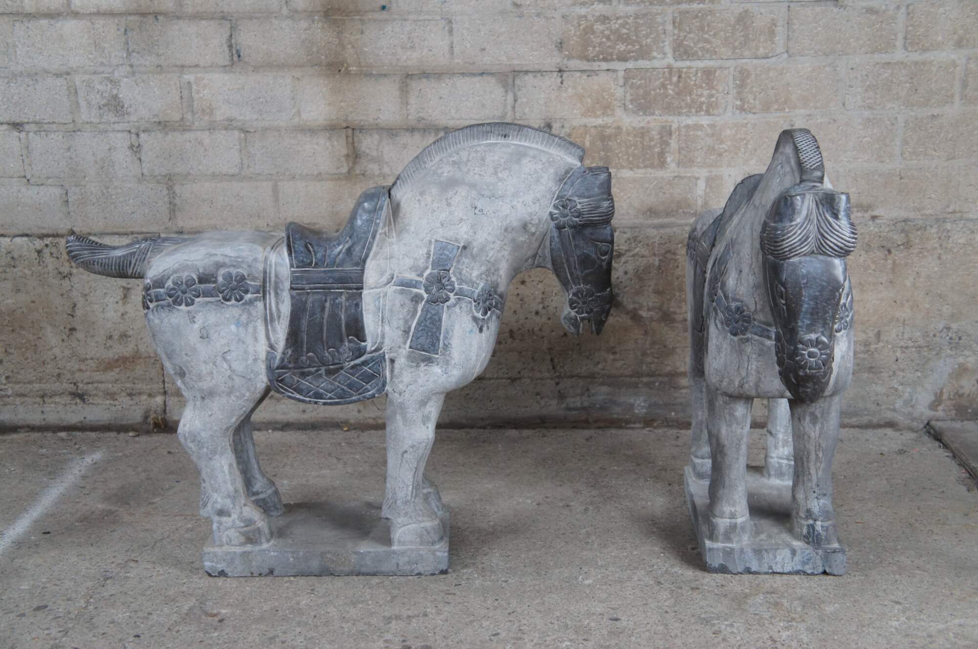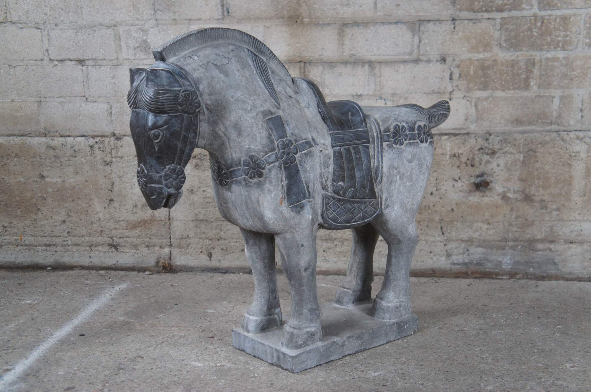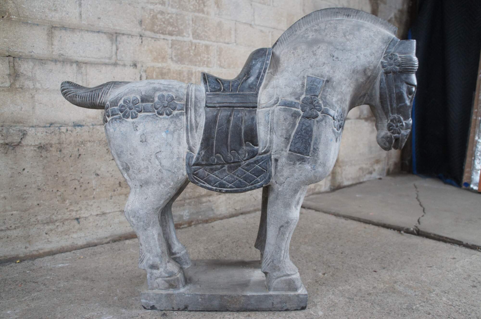 In Chinese culture, the horse is the embodiment of strength, elegance, and perseverance. This imperial palace horse sculpture depicts a noble steed standing with its head raised. This specific pose was very common in horse sculptures crafted during the Tang Dynasty. Crafted from solid stone with intricate detail, this replica reflects the great respect the Chinese people have for the horse. It is a perfect decor piece for indoor or outdoor use. Each horse weighs 222.5 lbs