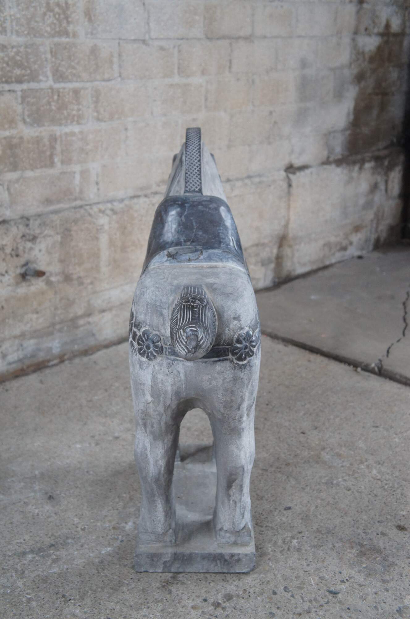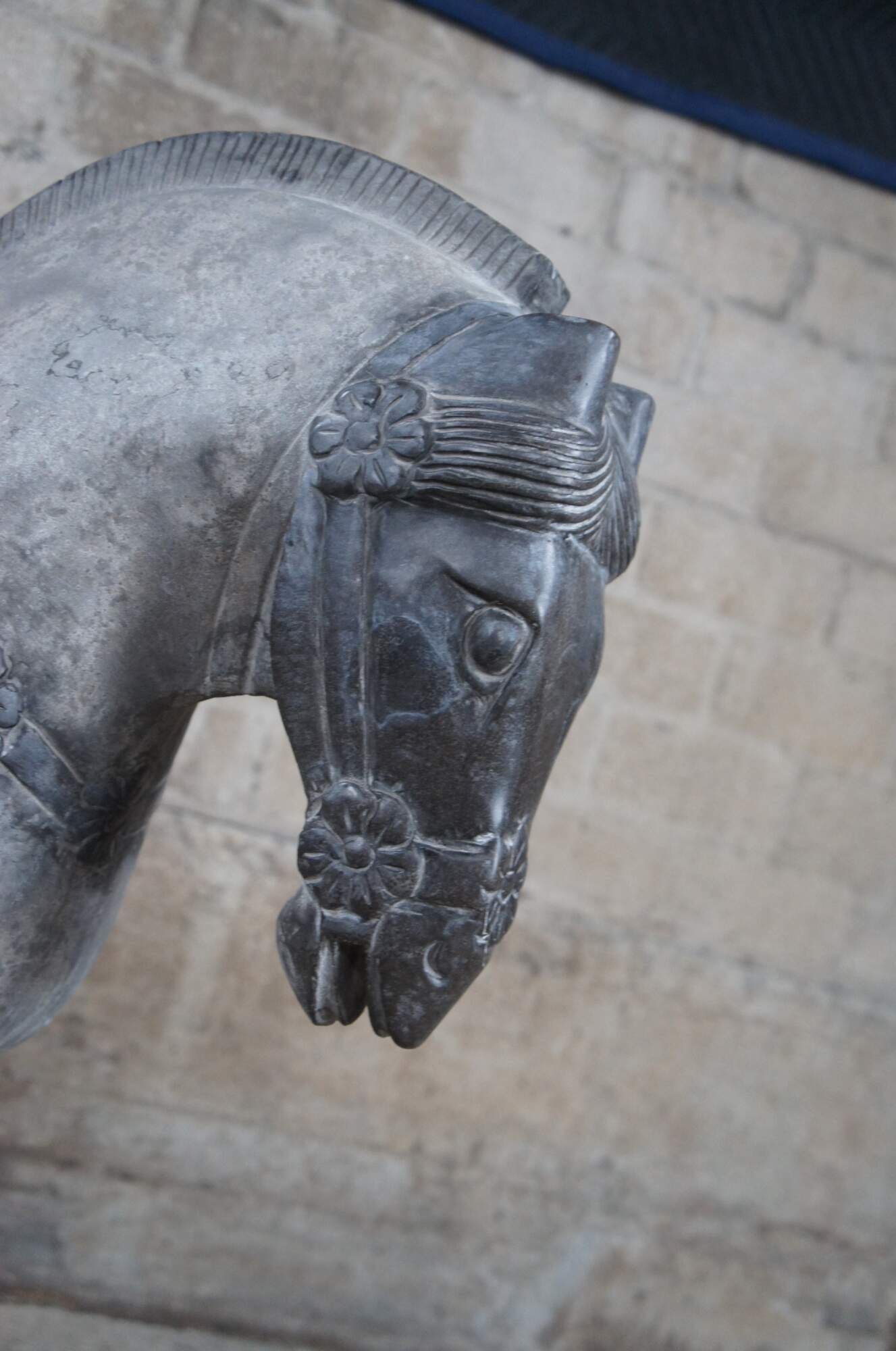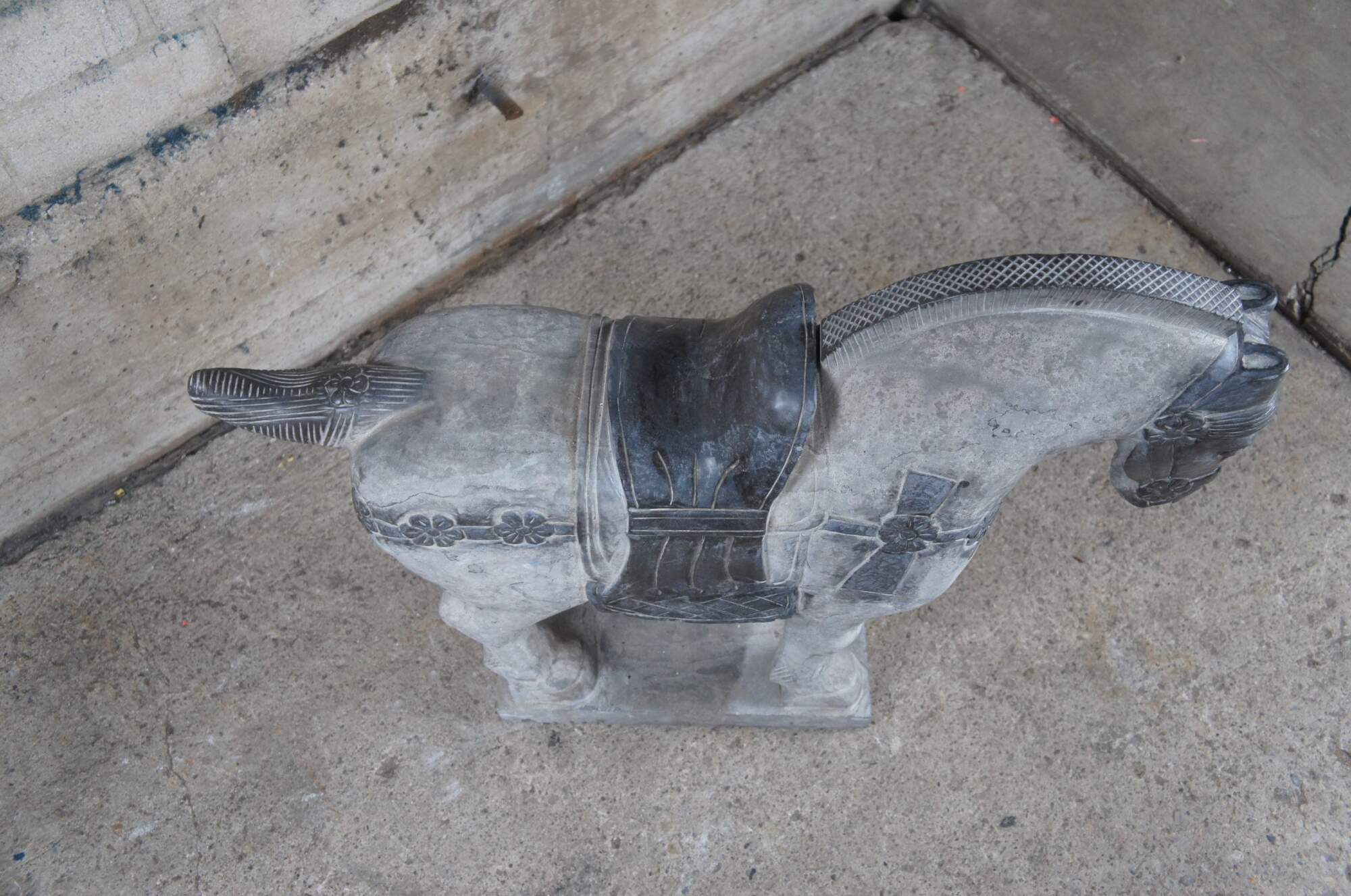 In Chinese culture, the horse is the embodiment of strength, elegance, and perseverance. This imperial palace horse sculpture depicts a noble steed standing with its head raised. This specific pose was very common in horse sculptures crafted during the Tang Dynasty. Crafted from solid stone with intricate detail, this replica reflects the great respect the Chinese people have for the horse. It is a perfect decor piece for indoor or outdoor use. Each horse weighs 222.5 lbs