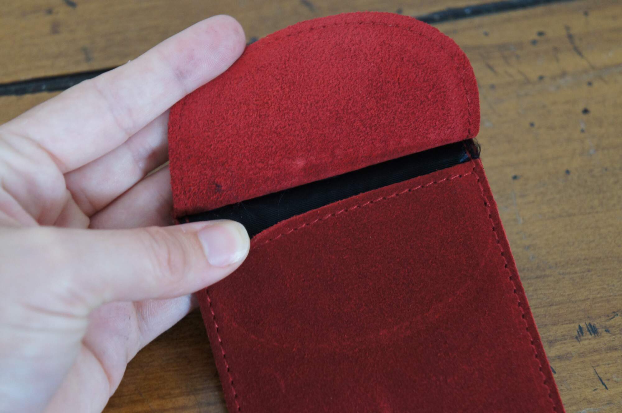 One red and gold embossed leather Cartier sunglasses box with white satin interior and red suede leather Cartier International Service glasses sleeve.
