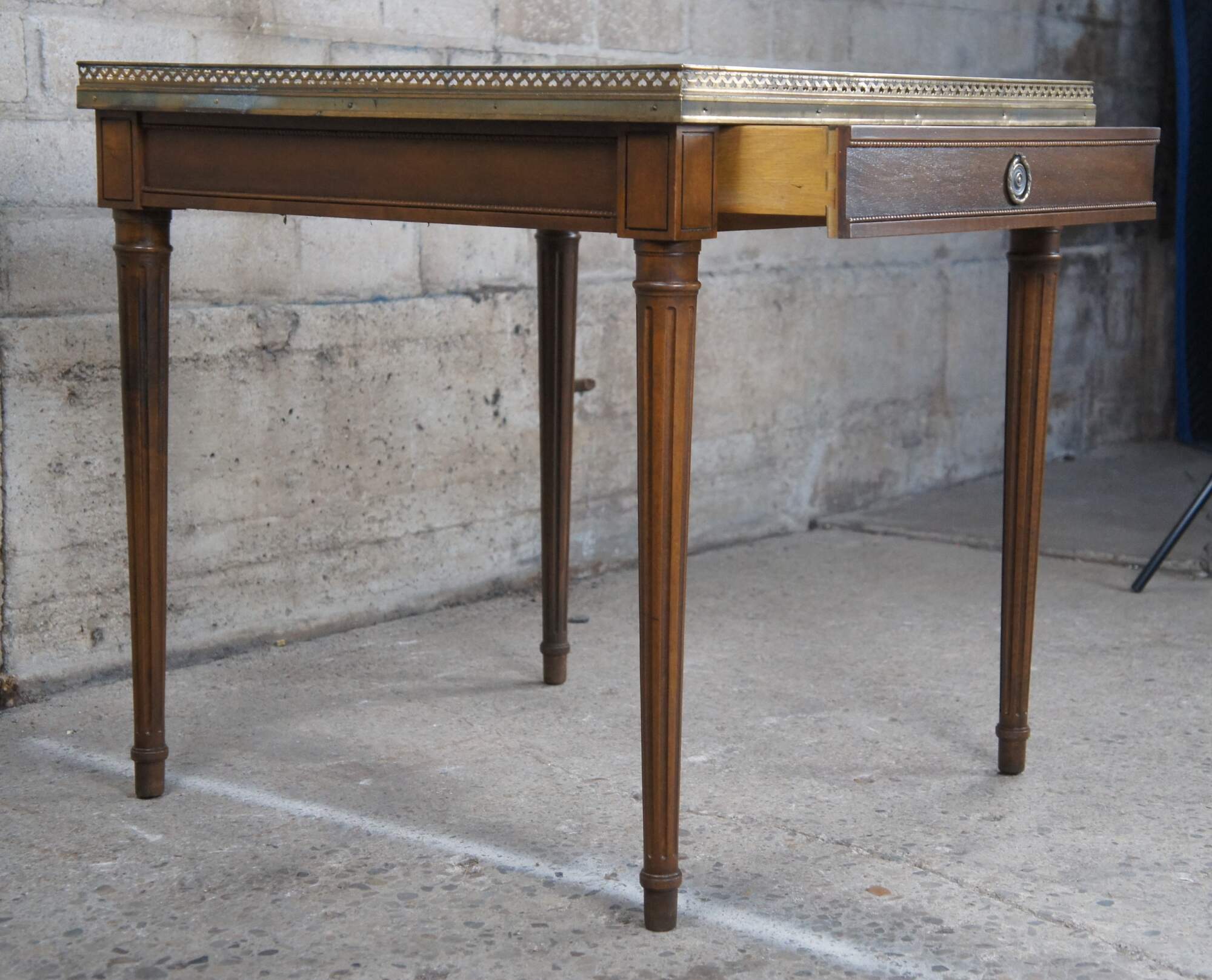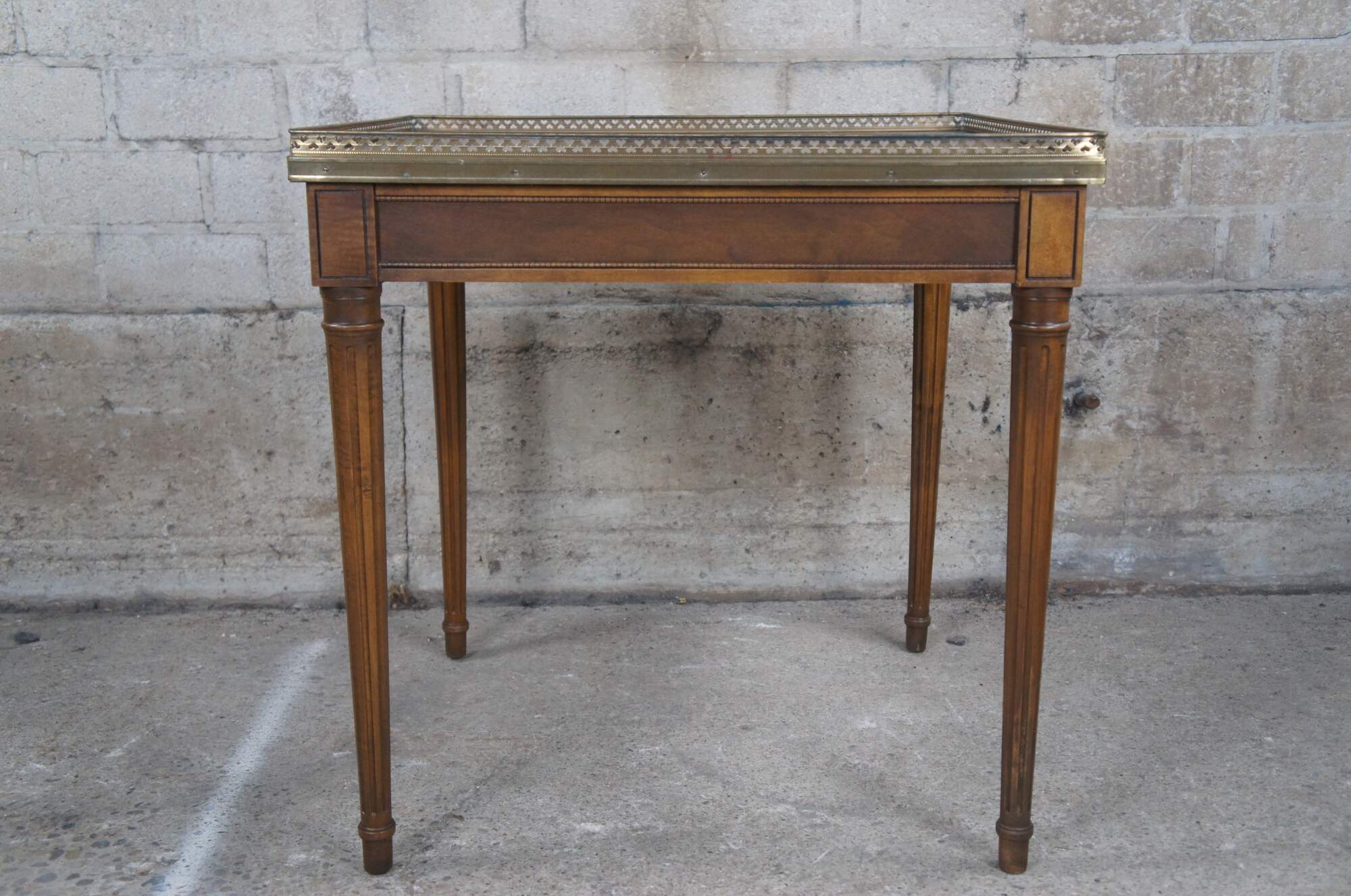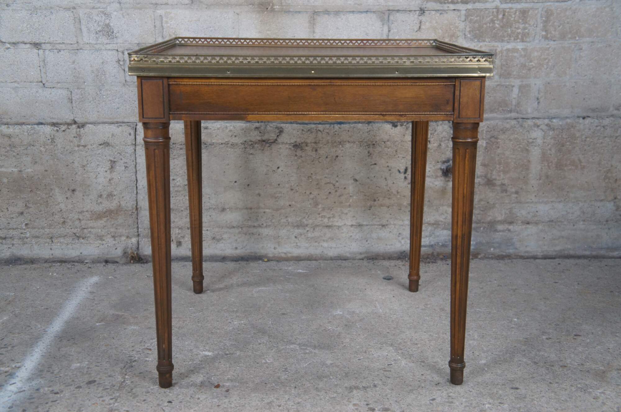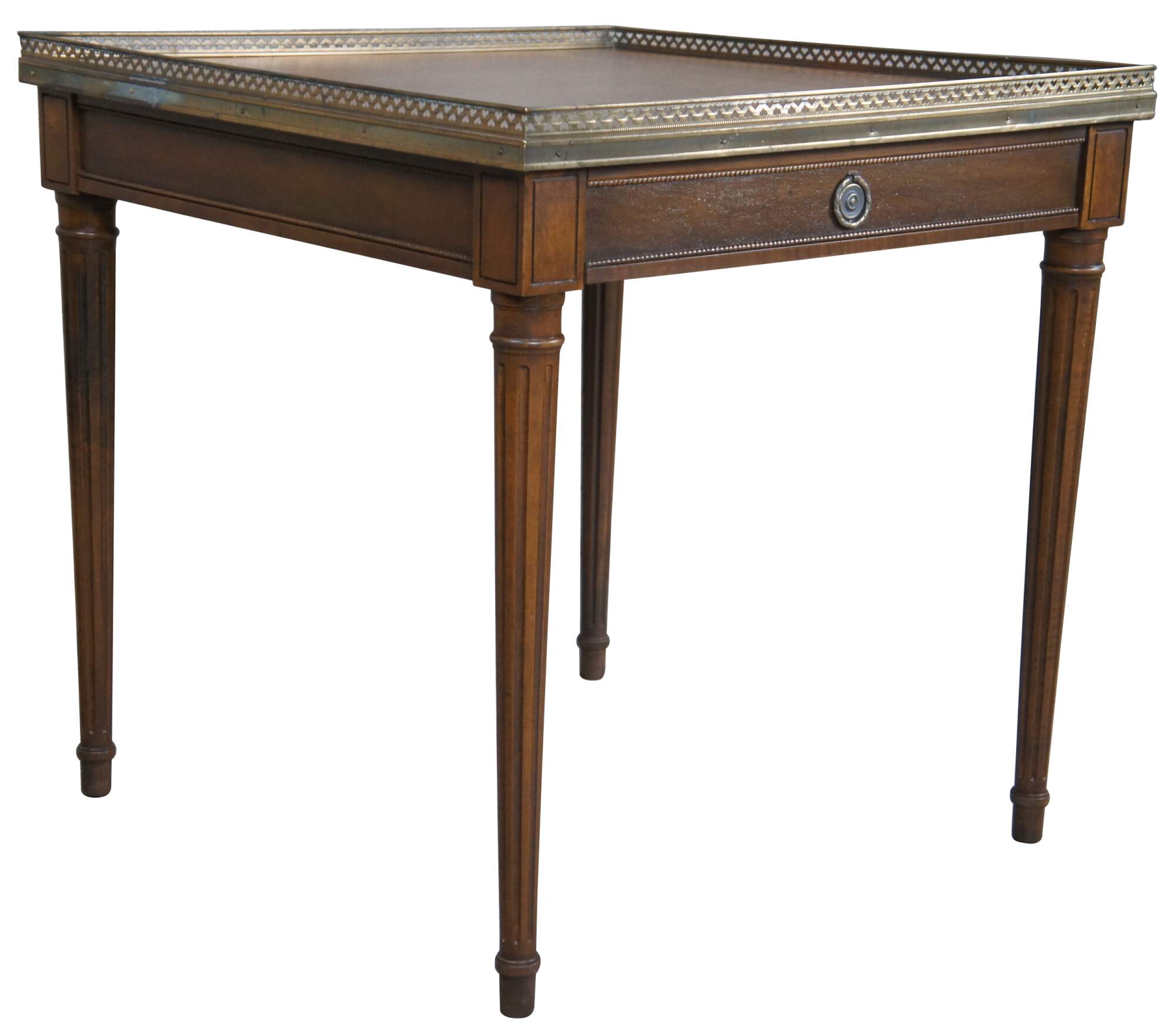 Vintage Baker Furniture French Louis XVI style side table, circa last quarter 20th century. Made from walnut with crotch veneered top inset around a pierced brass gallery. Large central drawer is dovetailed with brass knocker style drawer pull. The table is supported by fluted and tapered legs.