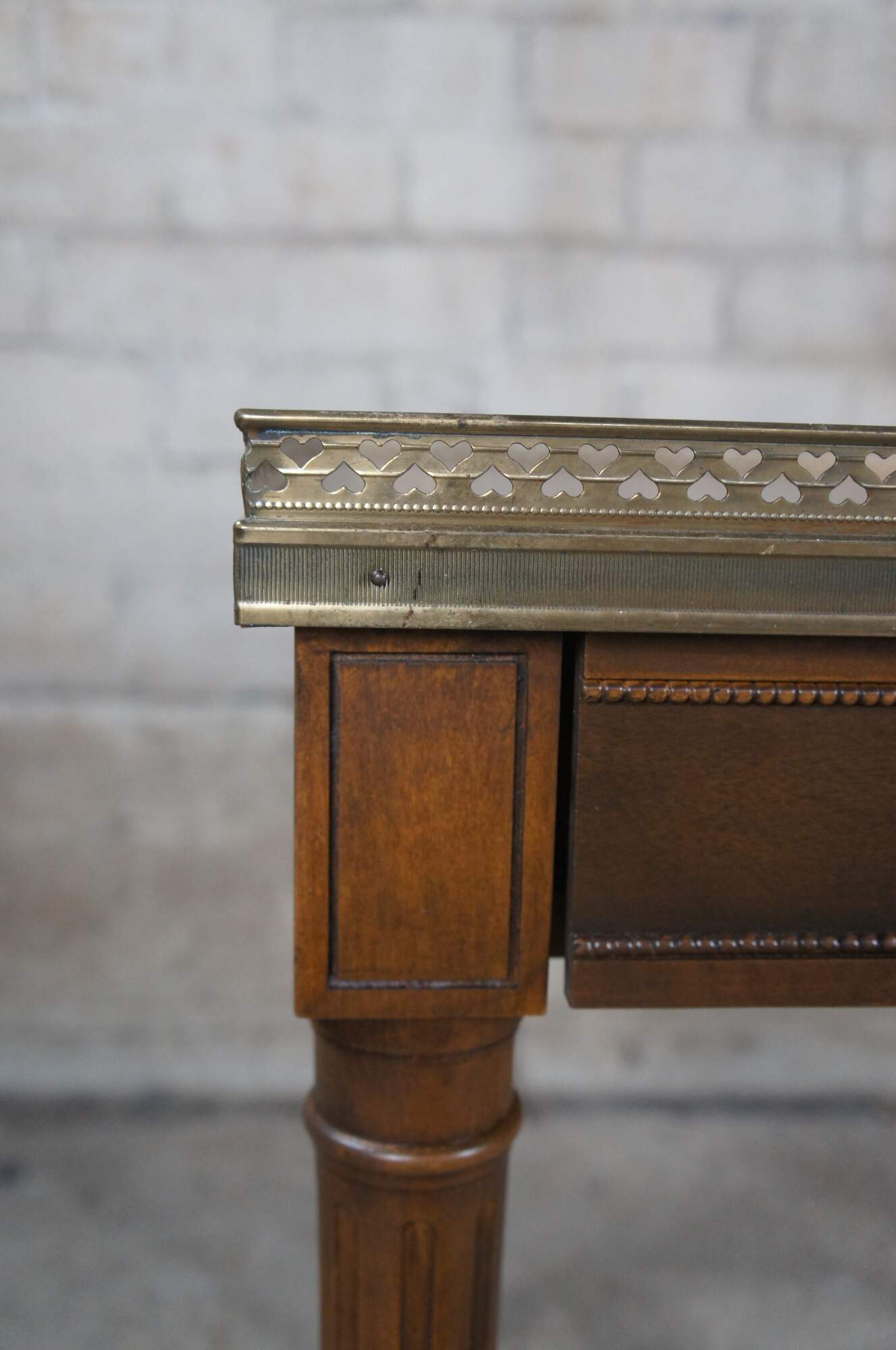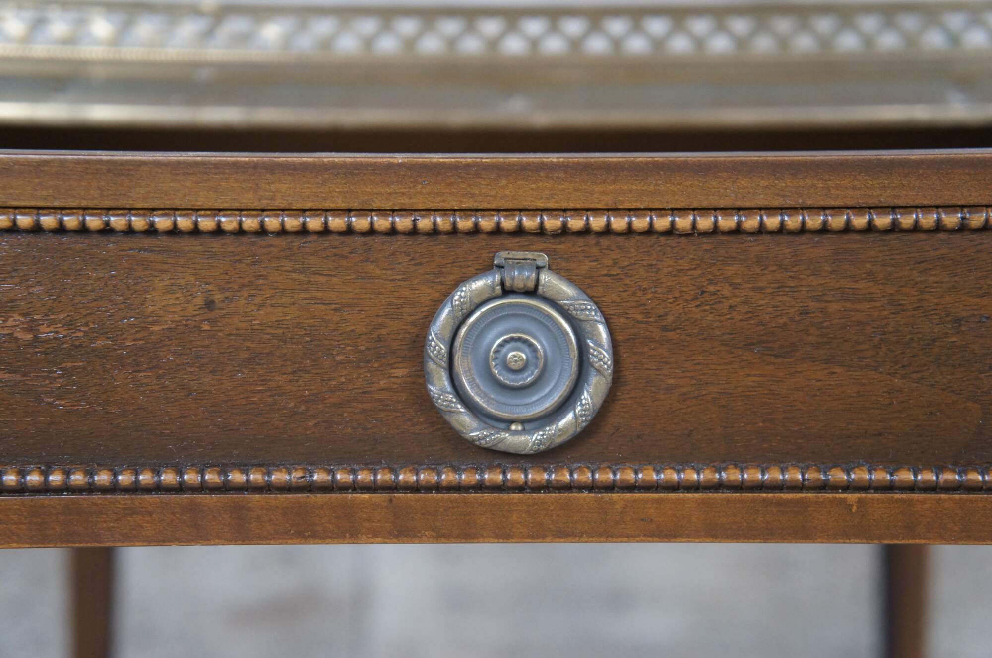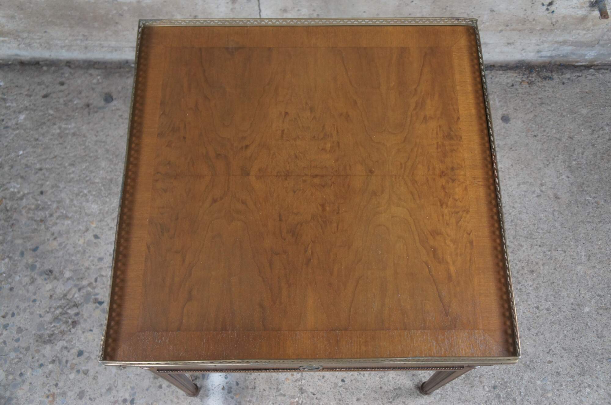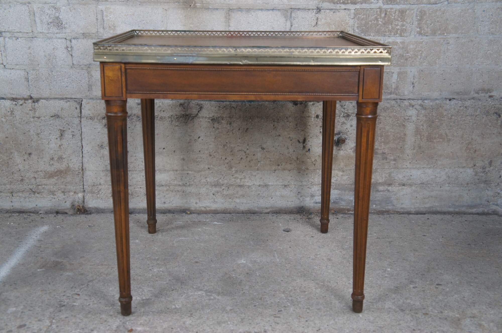 Vintage Baker Furniture French Louis XVI style side table, circa last quarter 20th century. Made from walnut with crotch veneered top inset around a pierced brass gallery. Large central drawer is dovetailed with brass knocker style drawer pull. The table is supported by fluted and tapered legs.