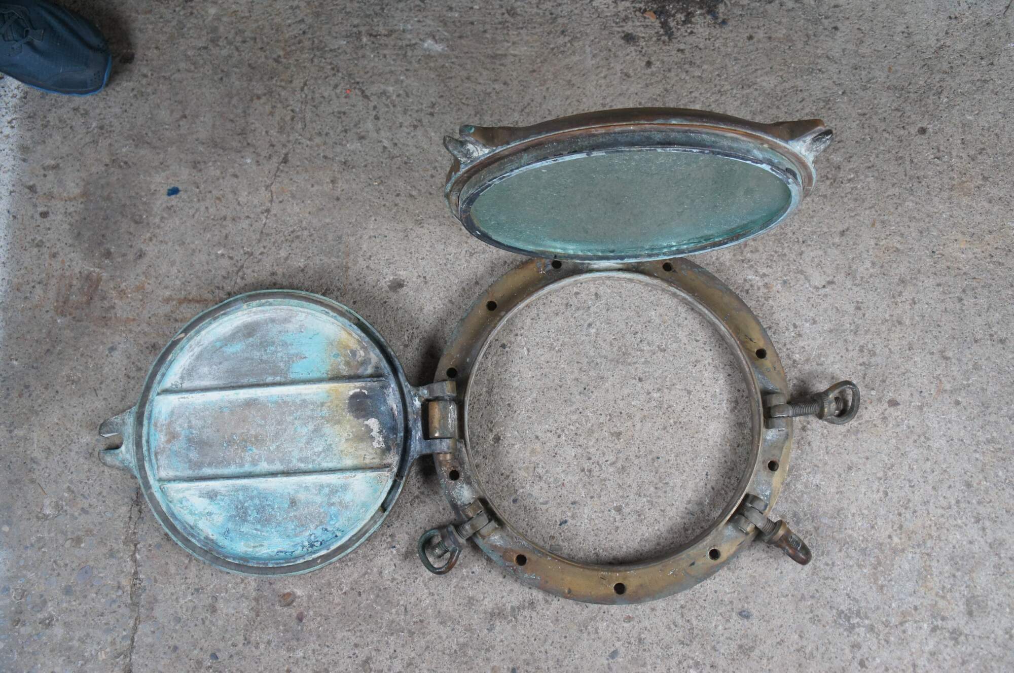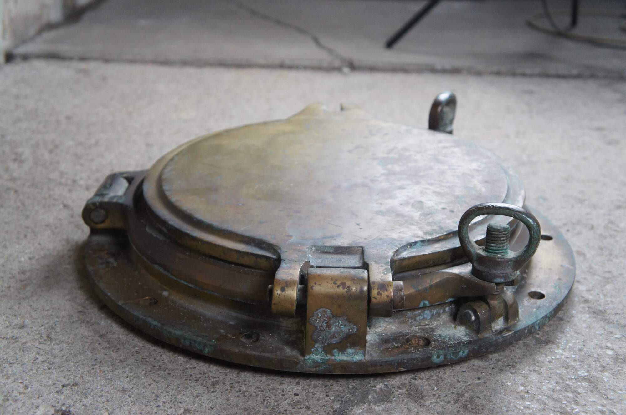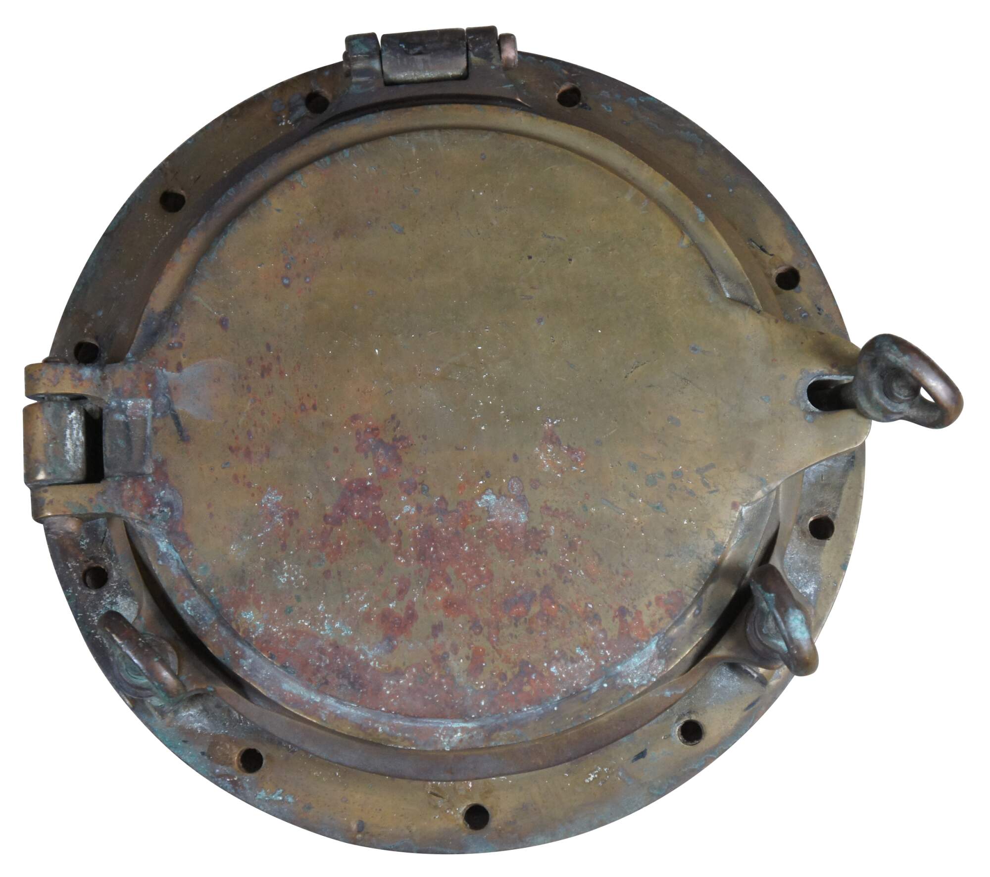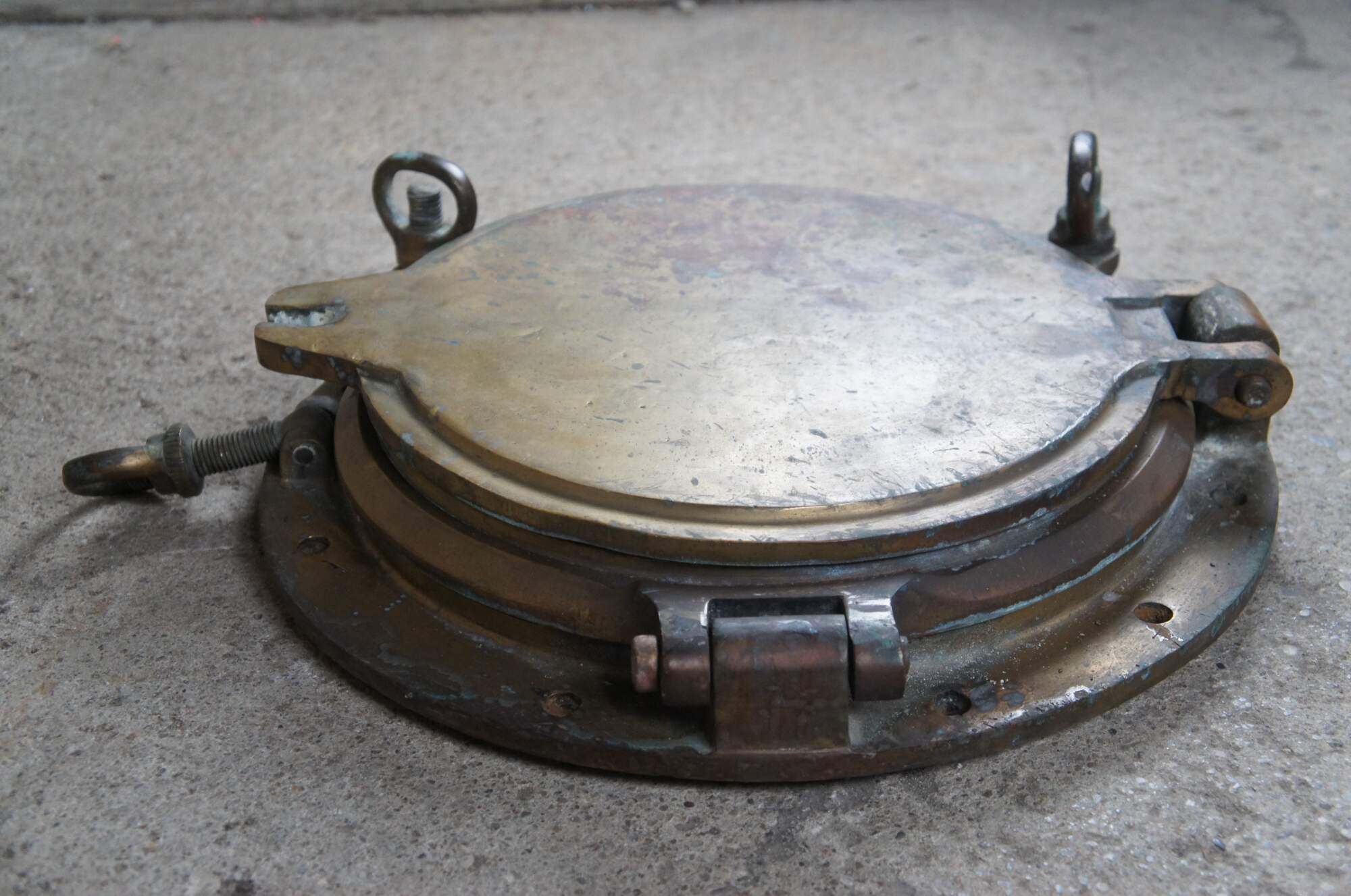 Extremely unique original antique heavy solid brass maritime Ship's Porthole or Hatch. A rare find with storm door, swing plate and barking plate. Its very unusual to find a complete porthole with swing plate. They are most often found as just a barking plate or window with storm door. The majority are rather simple and made from aluminum or nickel plated rather than heavy brass like this unique specimen. The vast majority of portholes on the market today are modern or reproduction's. This aged beauty is complete with original green glass and 3 dogs. Marked Wojidkows Sweden. High quality construction and hefty weight, 65 lbs