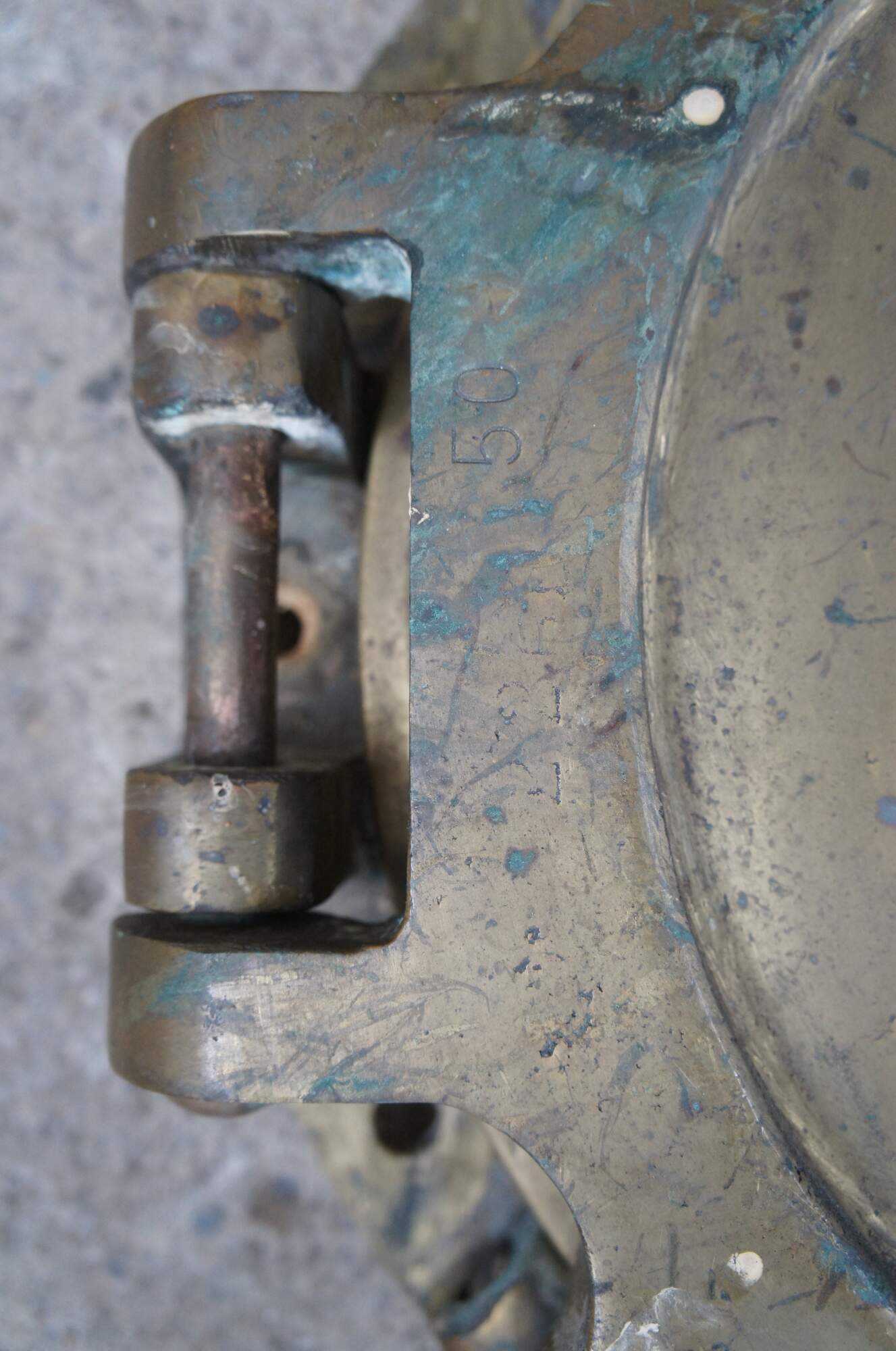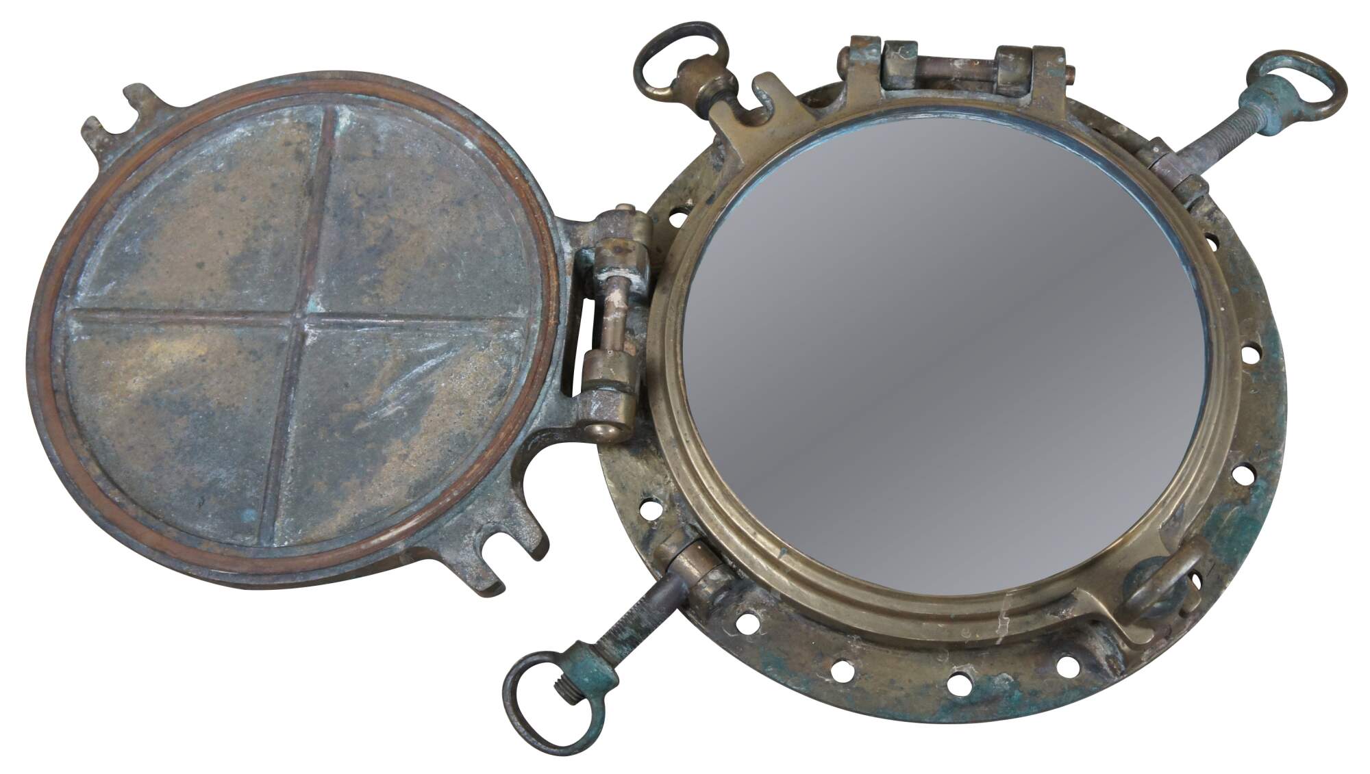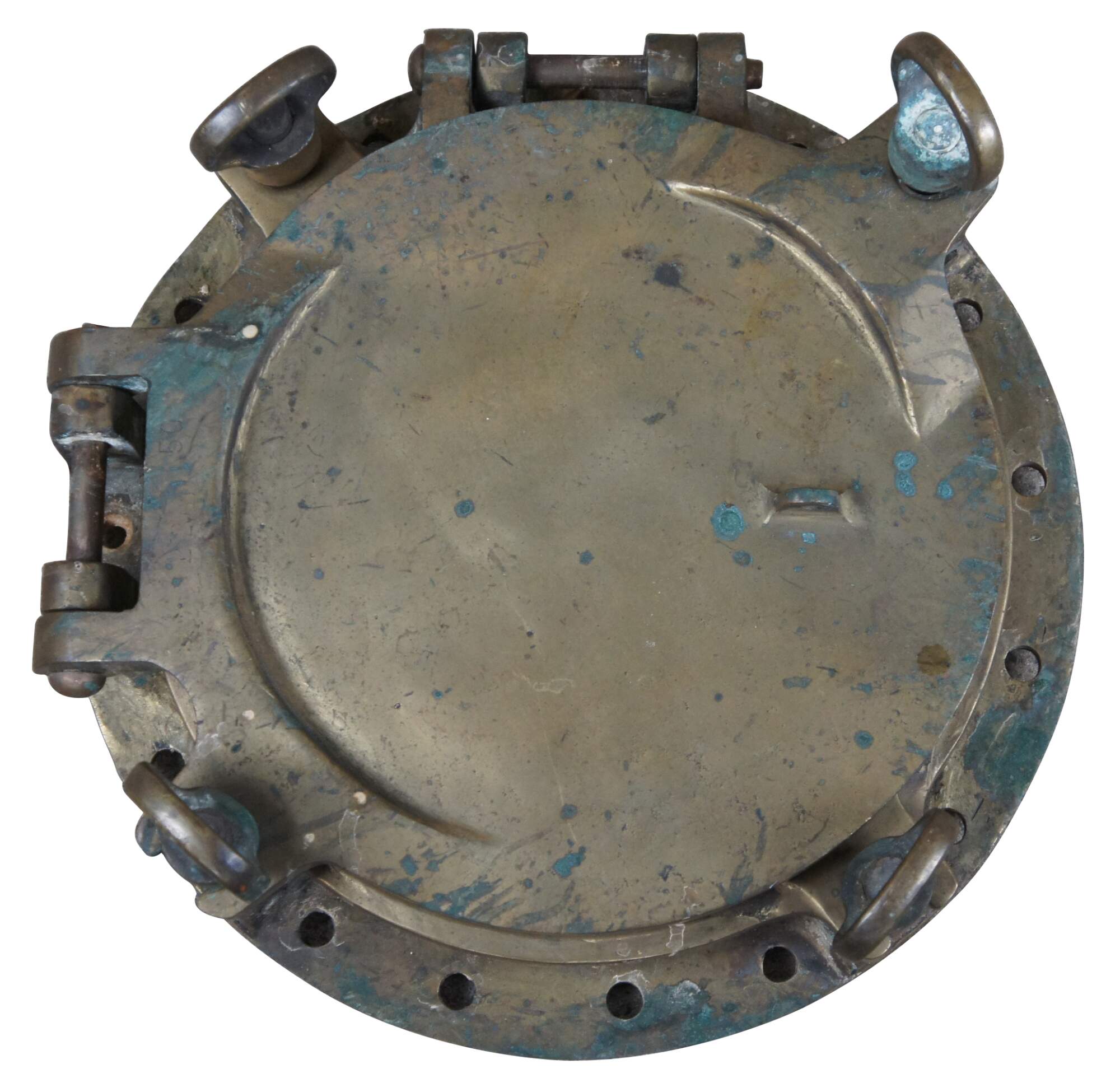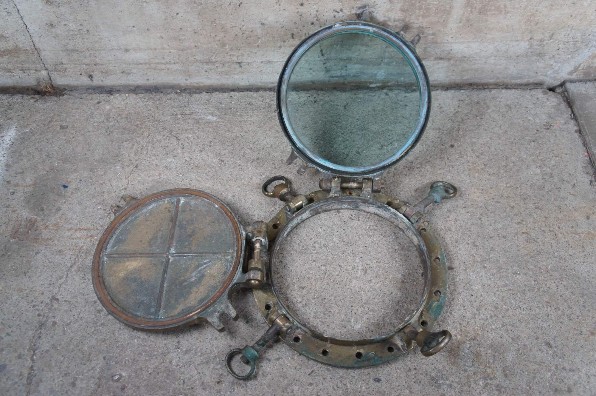 Extremely unique original antique heavy solid brass maritime Ship's Porthole or Hatch. A rare find with storm door, swing plate and barking plate. Its very unusual to find a complete porthole with swing plate. They are most often found as just a barking plate or window with storm door. The majority are rather simple and made from aluminum or nickel plated rather than heavy brass like this unique specimen. The vast majority of portholes on the market today are modern or reproduction's. This aged beauty is complete with original green glass and 4 dogs. High quality construction and hefty weight, 103 lbs. Marked 2260,50