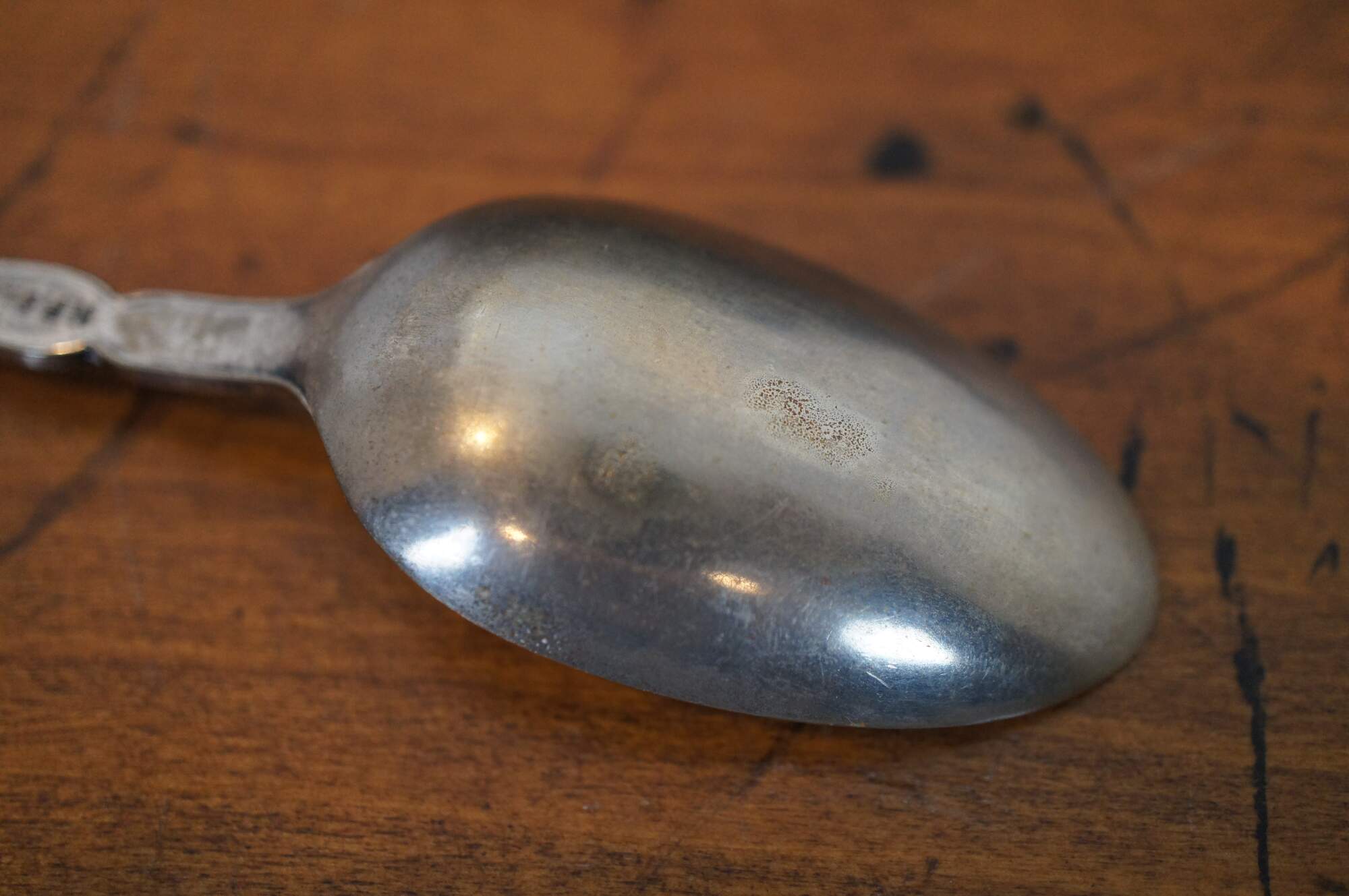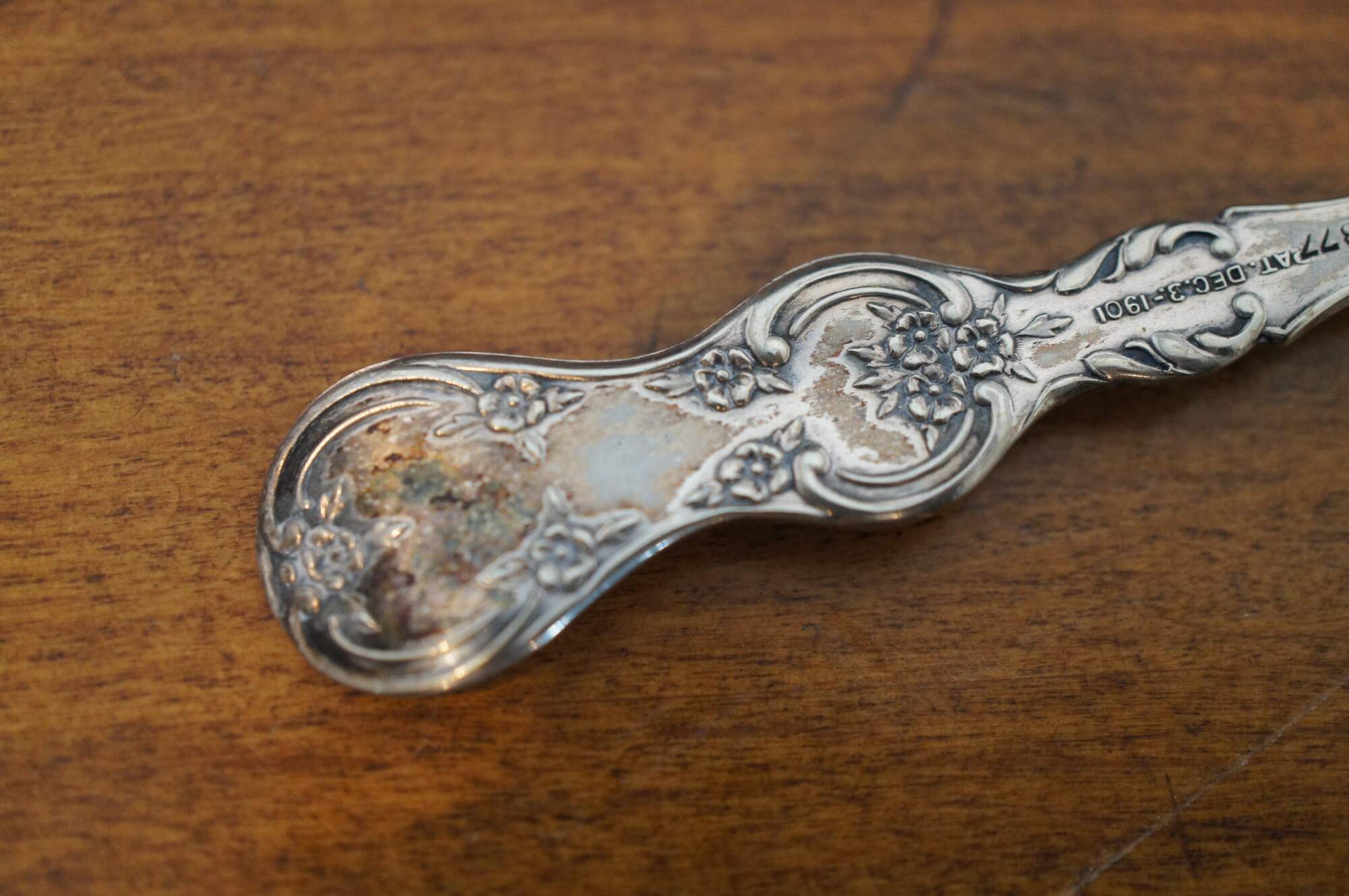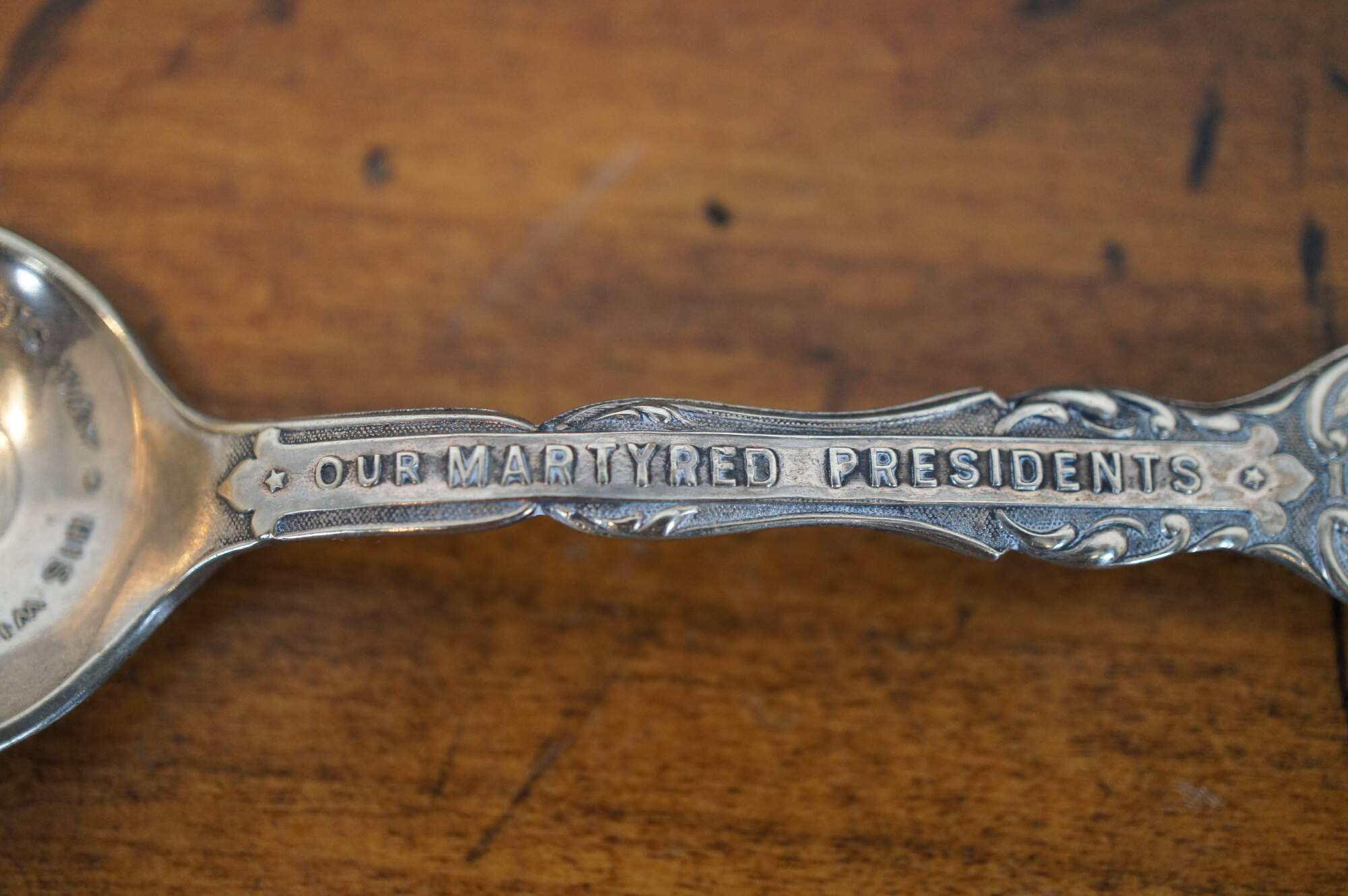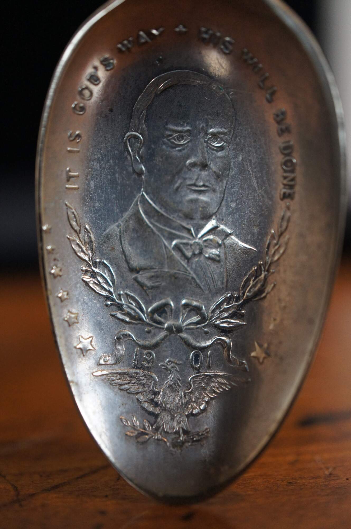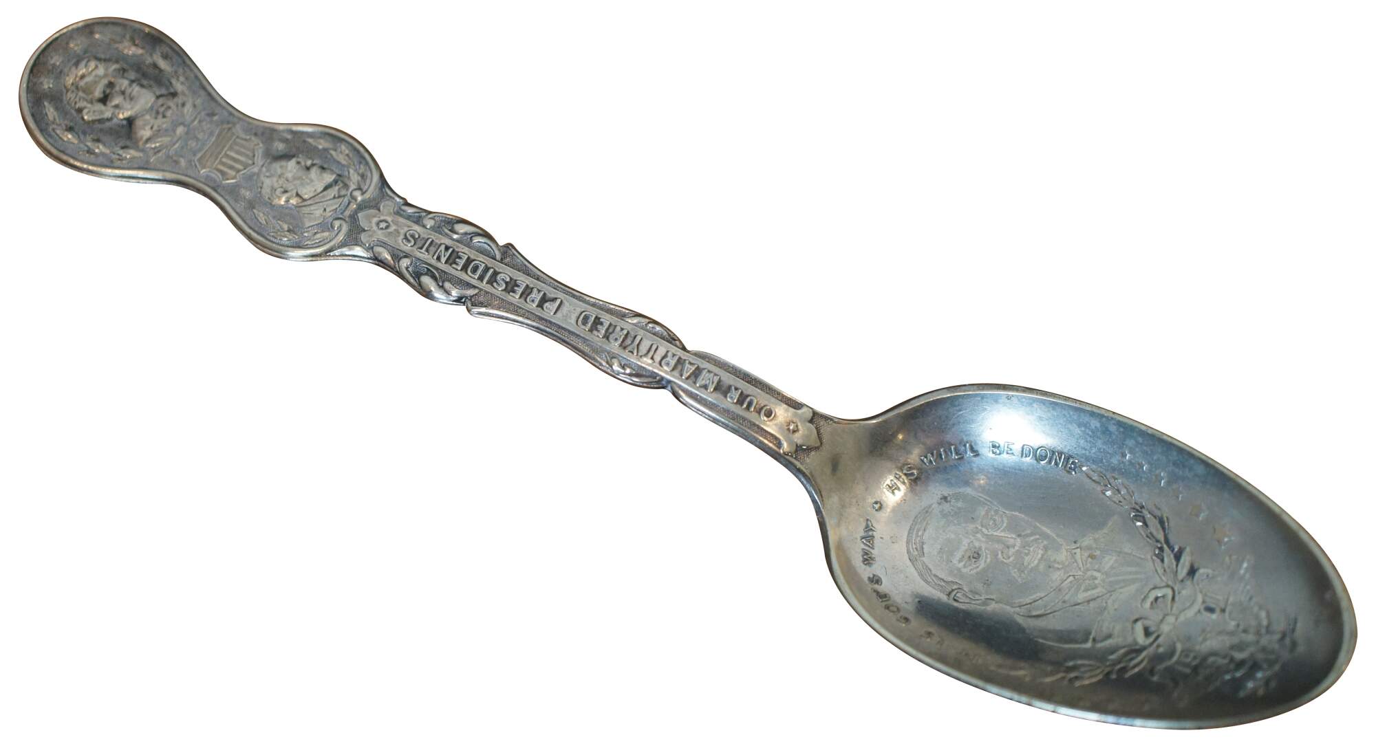 Antique sterling silver souvenir spoon manufactured by N.F. (Niagara Falls) Silver Company. Design patented December 3, 1901 to commemorate the assassination of President William McKinley on September 14th of that year. McKinley’s portrait sits in the bowl of the spoon framed in the words “It Is God’s Way – His Will Be Done” and a laurel wreath, above 1901 and an American eagle. The top of the spoon shows the two other predidents assassinated before McKinley, Abraham Lincoln (1865) and James A. Garfield (1881), separated by a Union shield of stars and stripes. A plaque design on the handle titles the spoon “Our Martyred Presidents.” Reverse of the handle sports the makers mark and a floral flatware pattern.