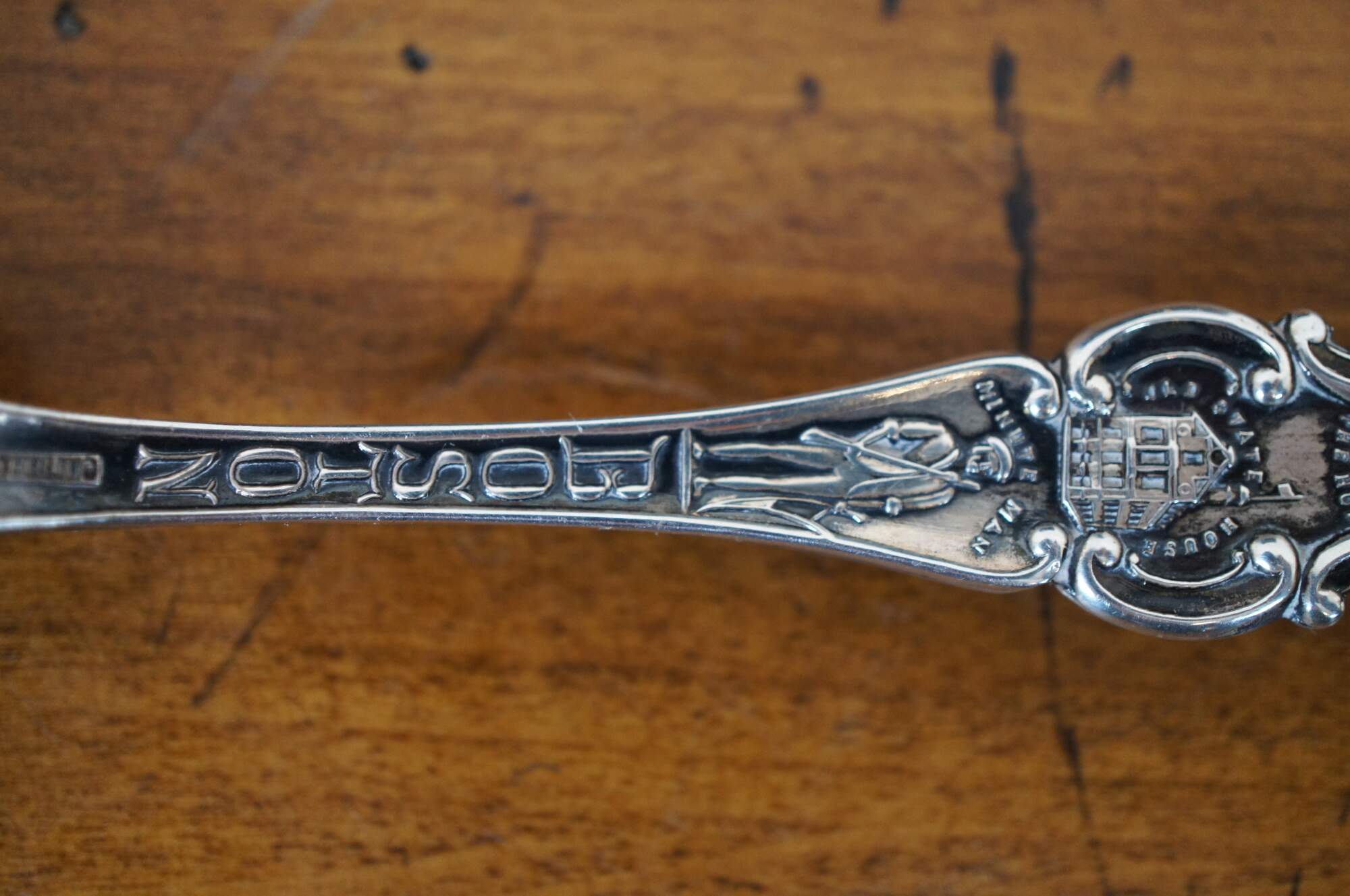 Antique Alvin sterling silver souveni spoon of Boston, Massachusetts. The bowl features a view of the skyline from the river filled with boats. The handle shows Paul Revere’s ride, a pot of baked beans, and the Washington Elm, as well as the word Cambridge and the Bunker Hill monument, all surrounded by foliate swirls. The reverse of the handle displays Faneuil Hall, the Public Library, Old South Church, a Revolutionary war Minute Man, and the word Boston again.