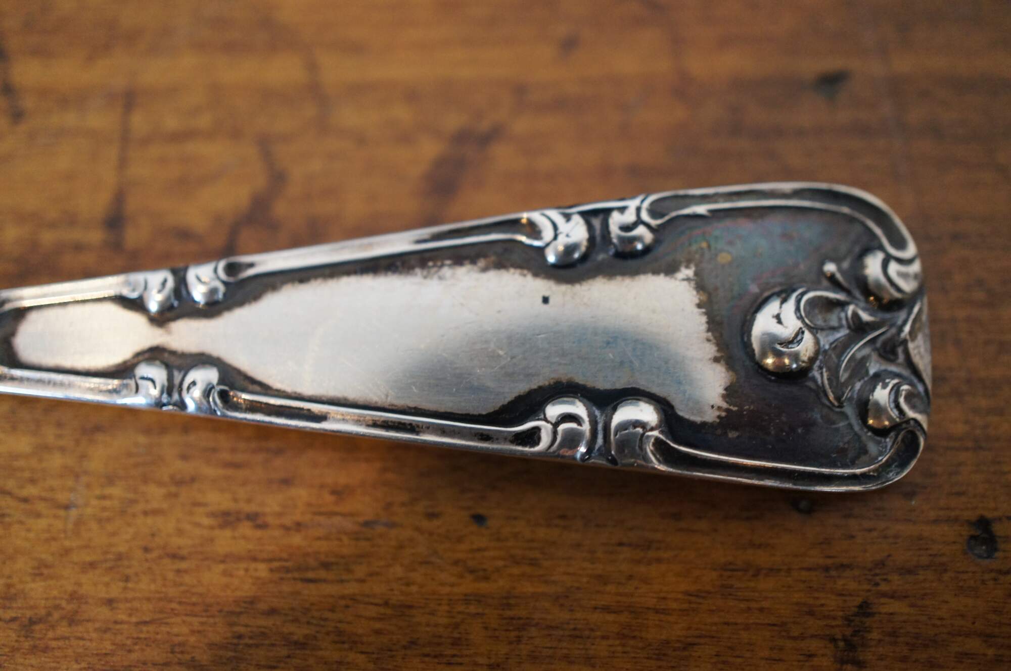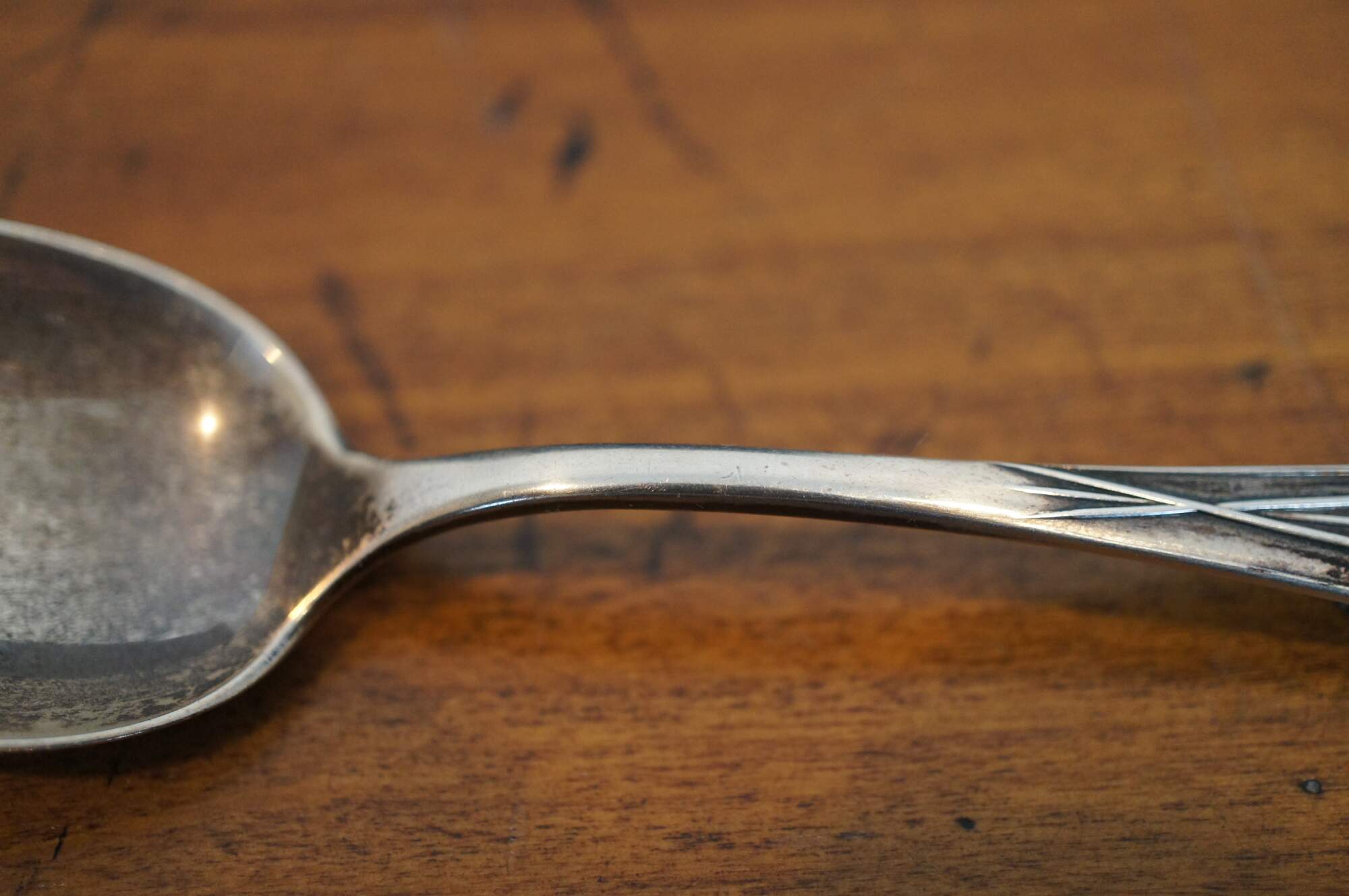 Antique late 19th century Durgin sterling silver Salem Witch souvenir spoon, sold by Daniel Low & Company. This spoon sports a simple squared off handle decorated with the word Salem flnanked by three pins and a witch holding a broomstick. “On a trip to Europe in 1890, Daniel’s son Seth Low (1867-1939) noticed tourists purchasing souvenir spoons from various cities they had visited. On his return home, Seth commissioned a simple design for a sterling silver spoon with the image of a witch, three “witch pins,” and the word “Salem.” This spoon is considered the first “official” souvenir of the “Witchcraft delusion” sold in the city. According to contemporary historian George B. James in 1891, Salem was becoming a popular destination for those curious about the Witch Trials of 1692. He explained that the three witch pins on the spoon were the same as those “preserved at the Court House in Salem.” These straight pins were said to be evidence presented during the trials, used to inflict harm by the accused witches during the city’s period of hysteria.”