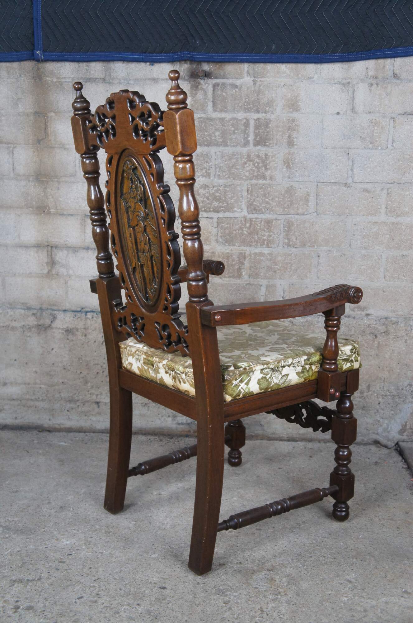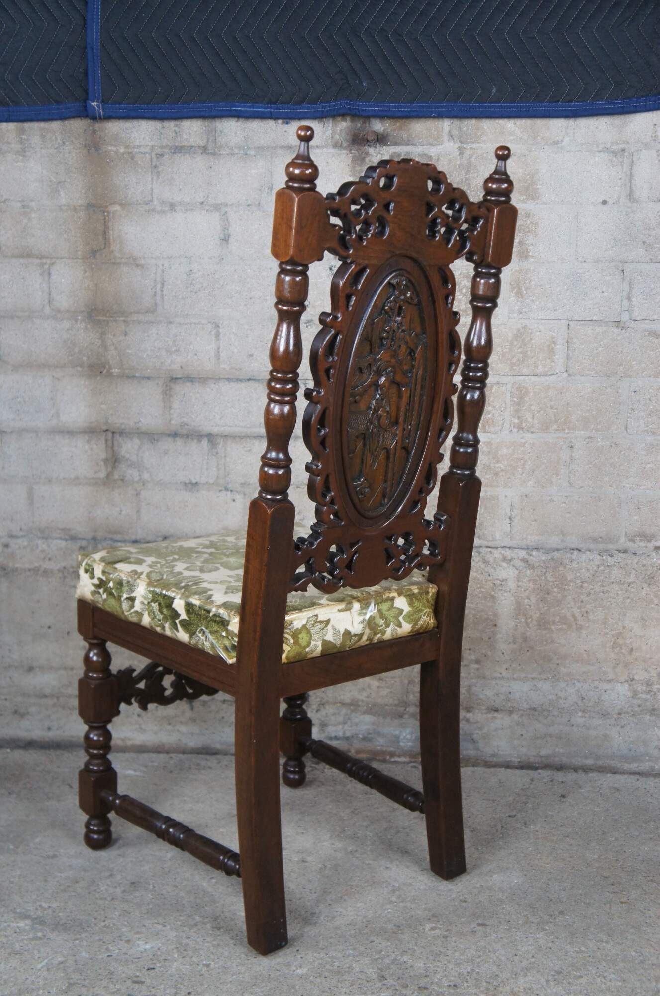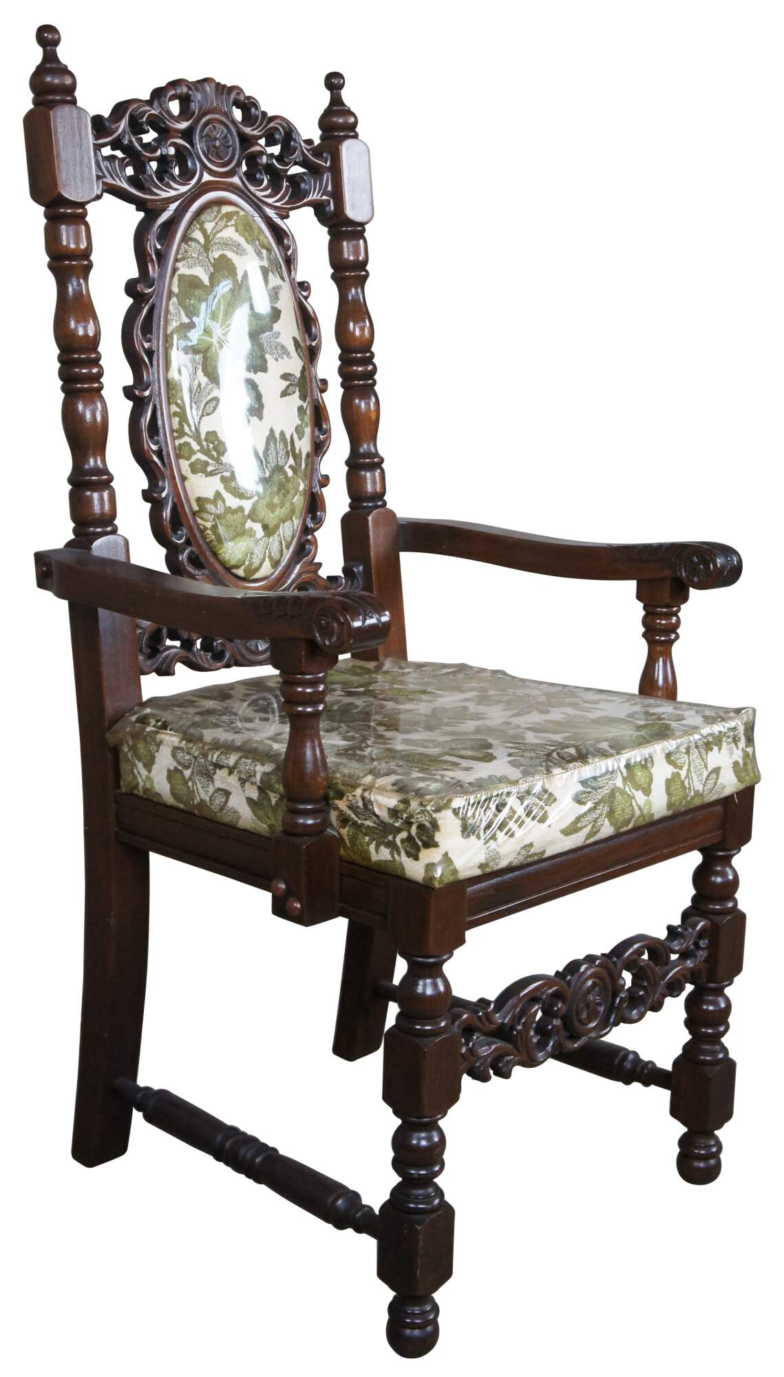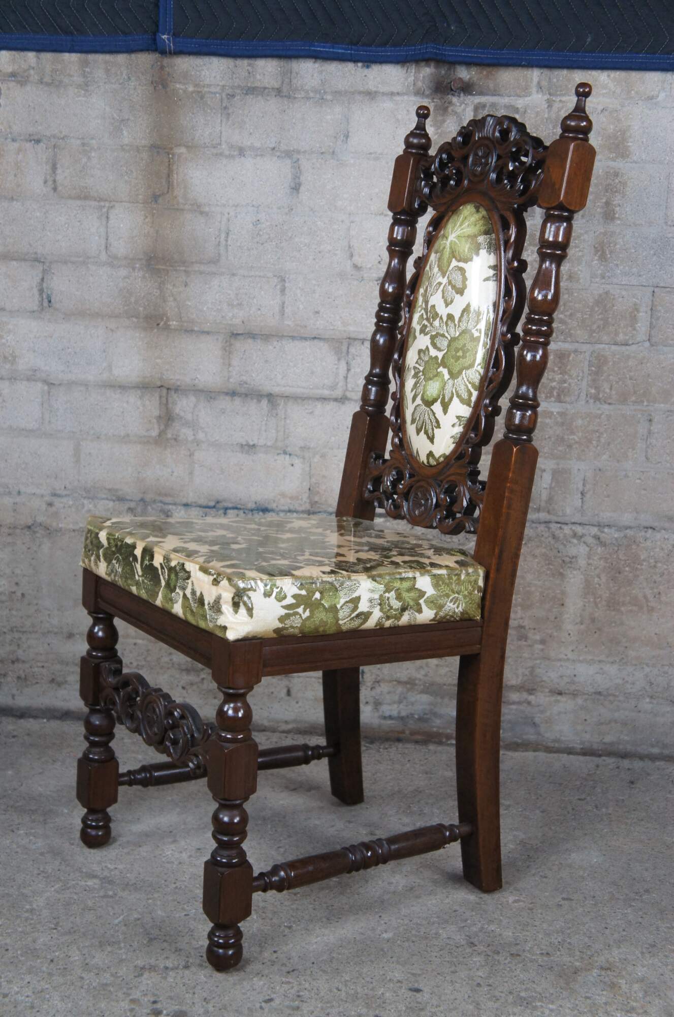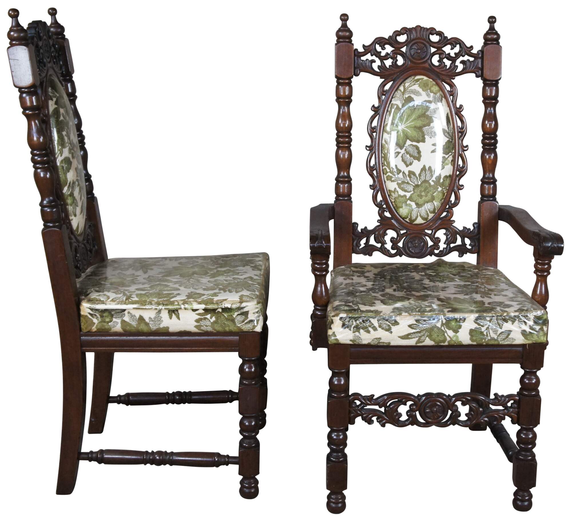 An impressive set of 8 Charles II or Carolean style dining chairs made in Okinawa Japan, circa 1970s. Hand crafted from oak with an oval upholstered back centered between turned stiles and surround by beautiful filigree carvings that are matched along the front strecher of each chair. Upholstery is original with a green leafy design. The fabric is still wrapped in the original plastic which could always be removed.