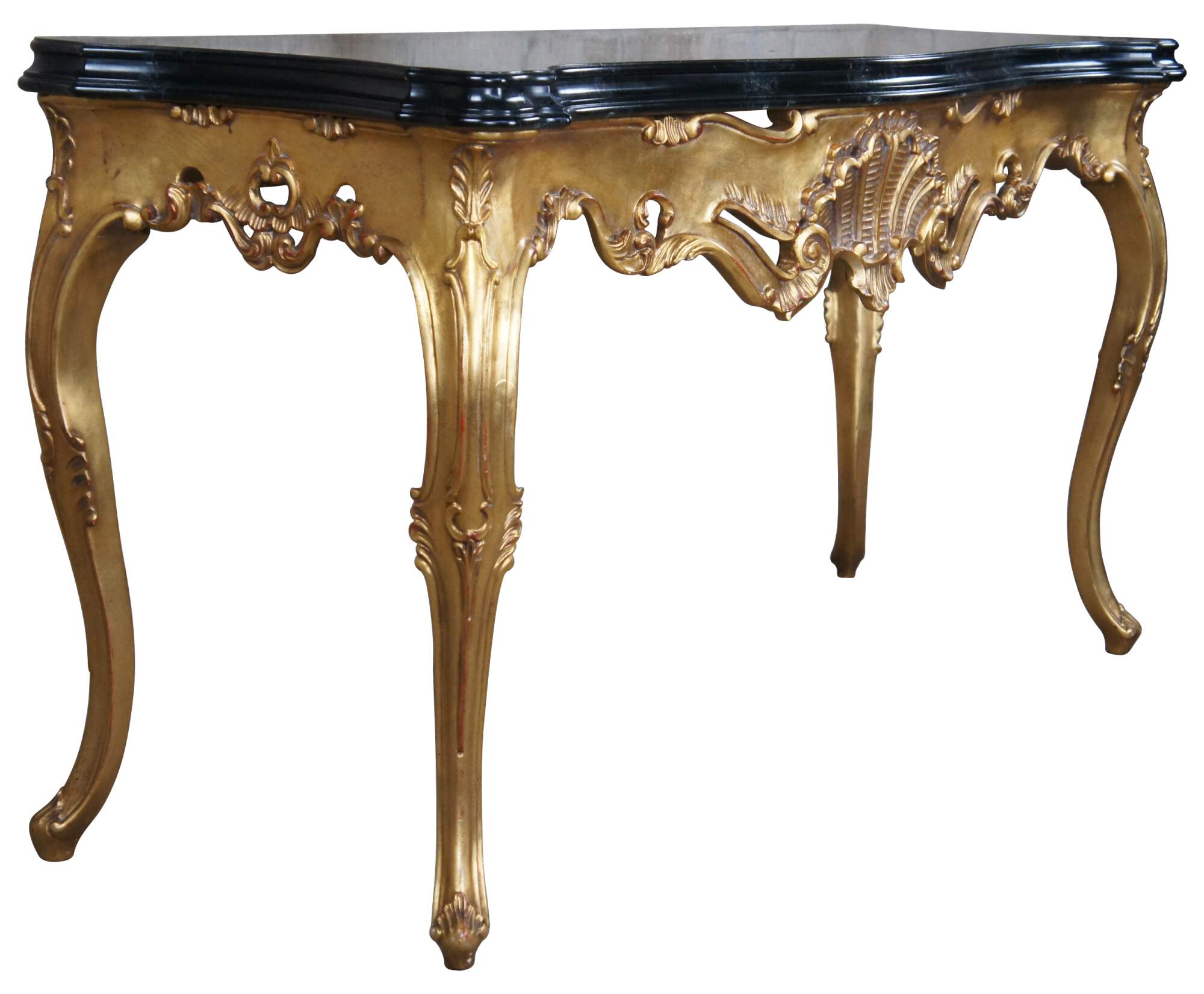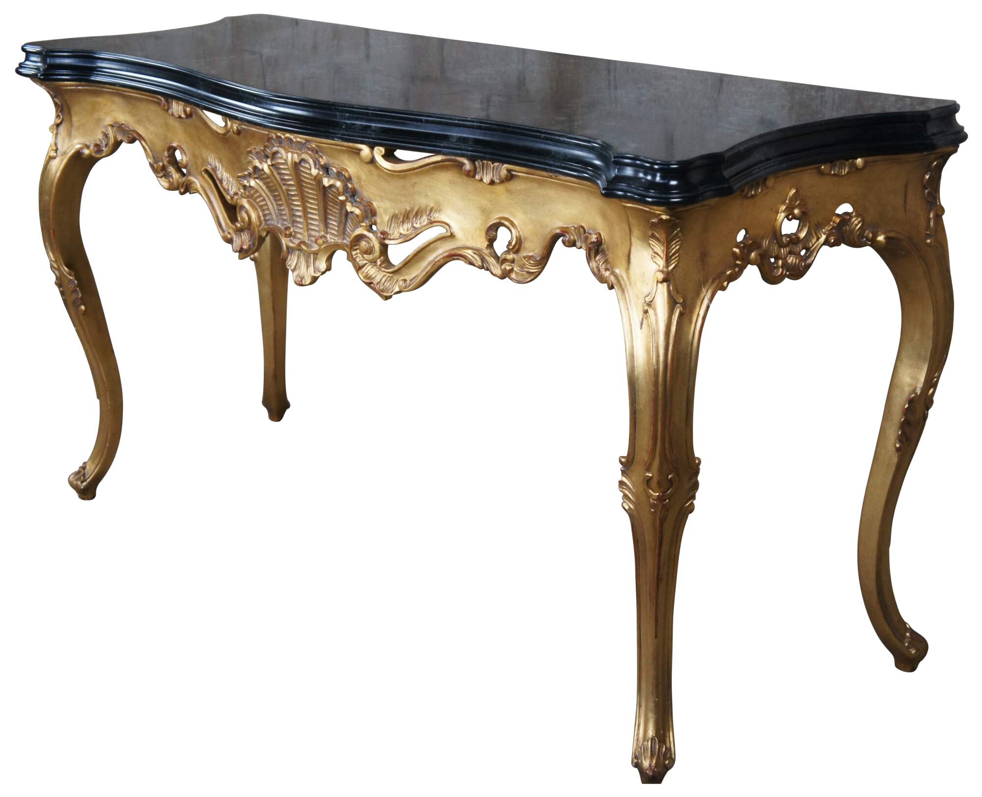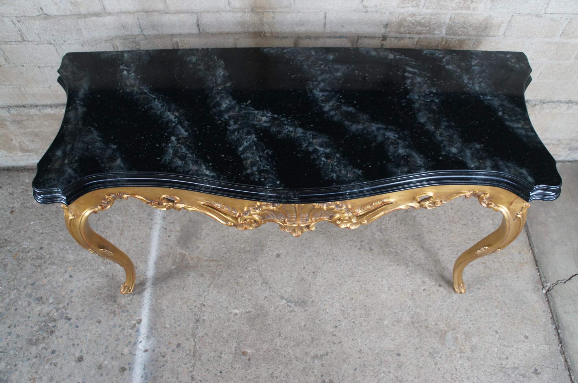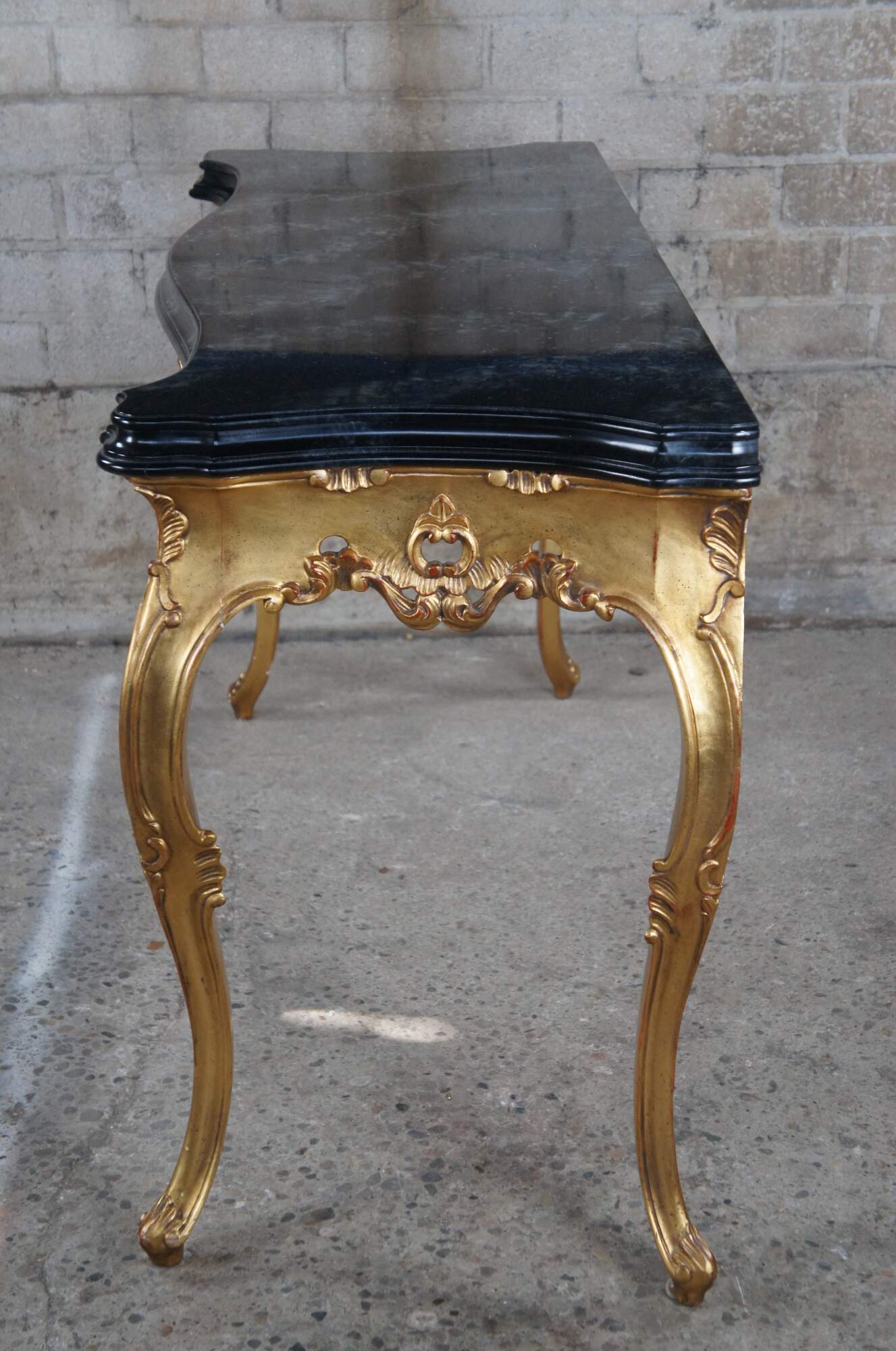 Late 20th century Rococo style console or hall table. Features a serpentine form with faux marble top, a scalloped and pierced giltwood frieze and scalloped legs with acanthus feet. Marked along back side "made in Italy