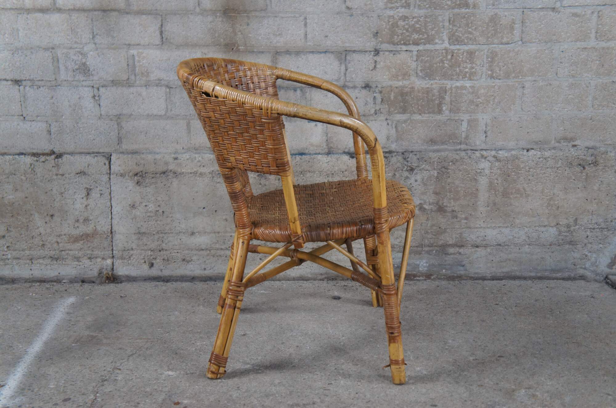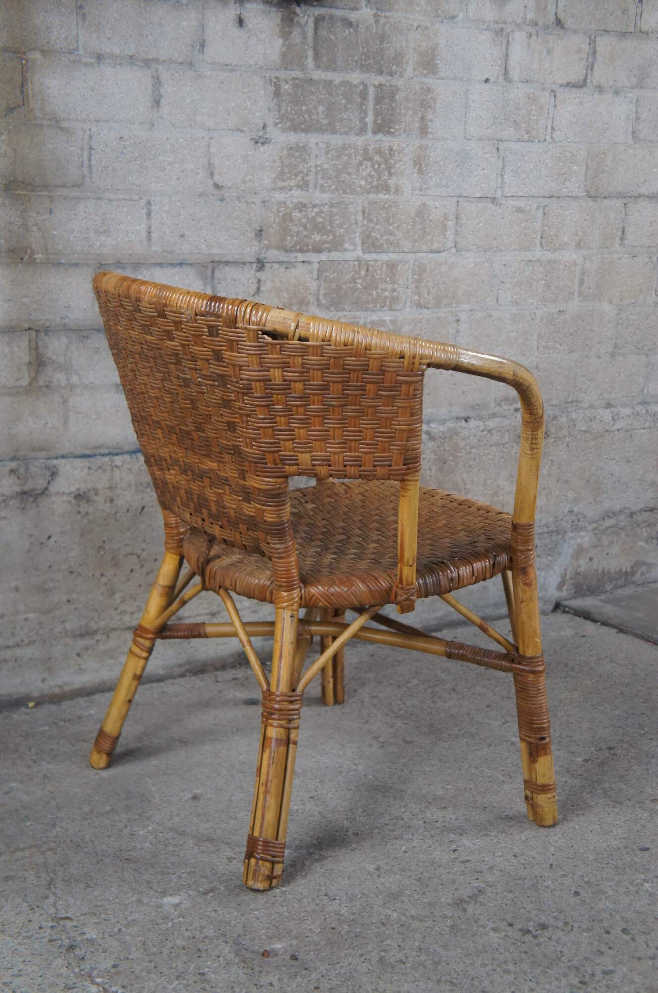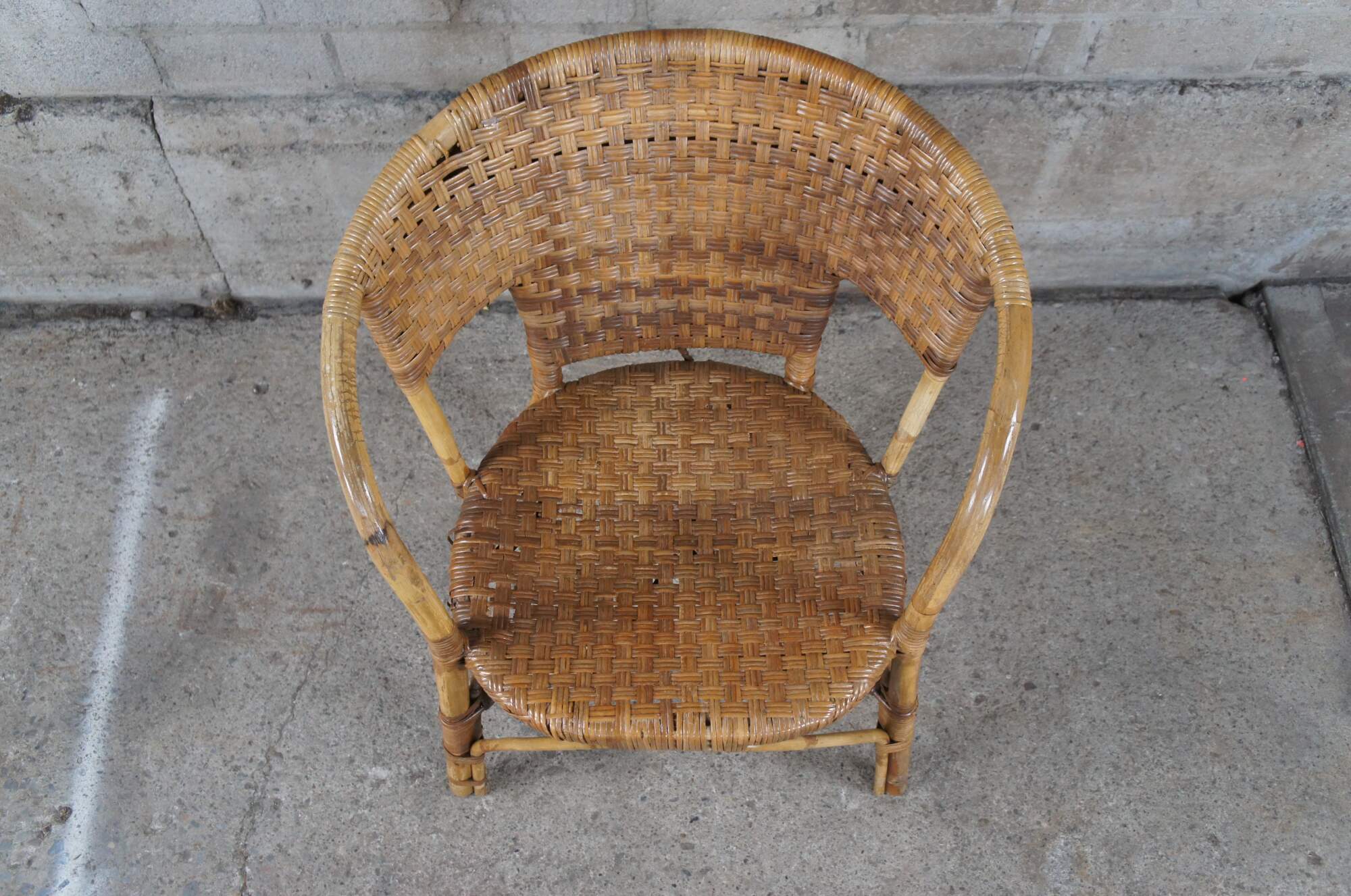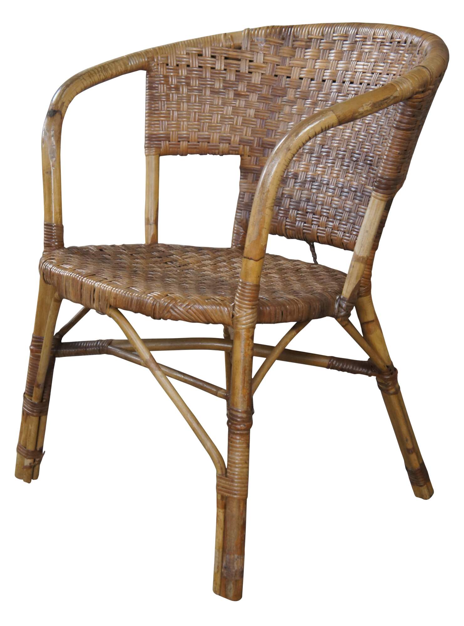 Antique bamboo and woven wicker / rattan armchair featuring rounded bentwood back with geometric woven patterns