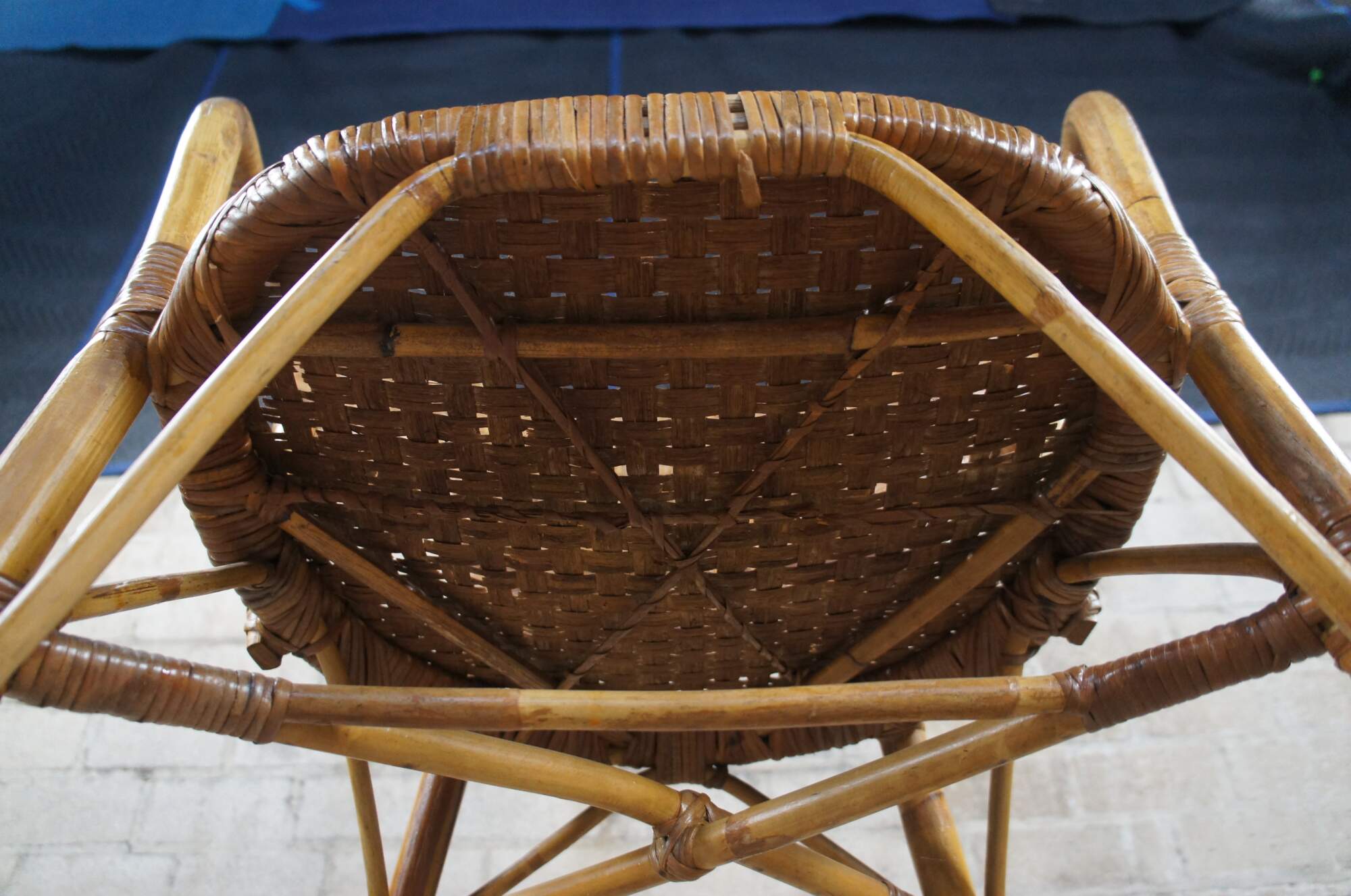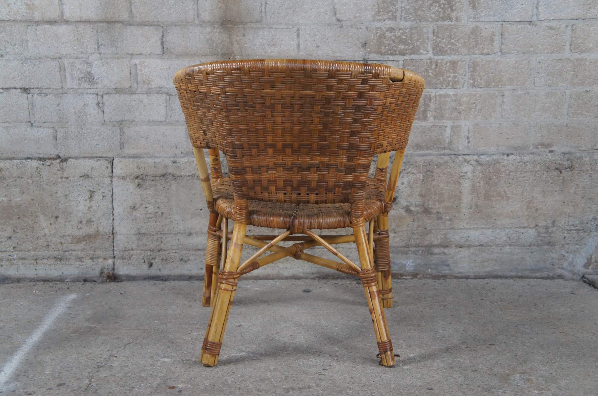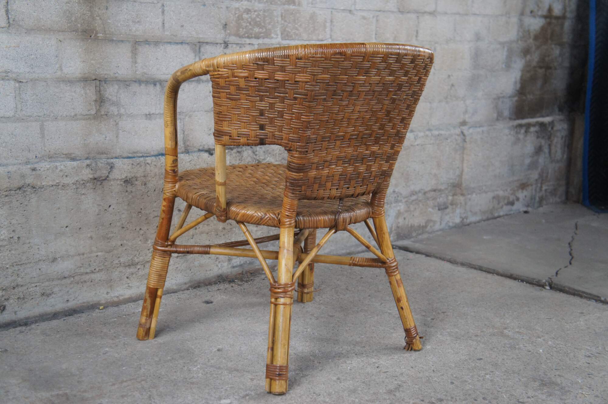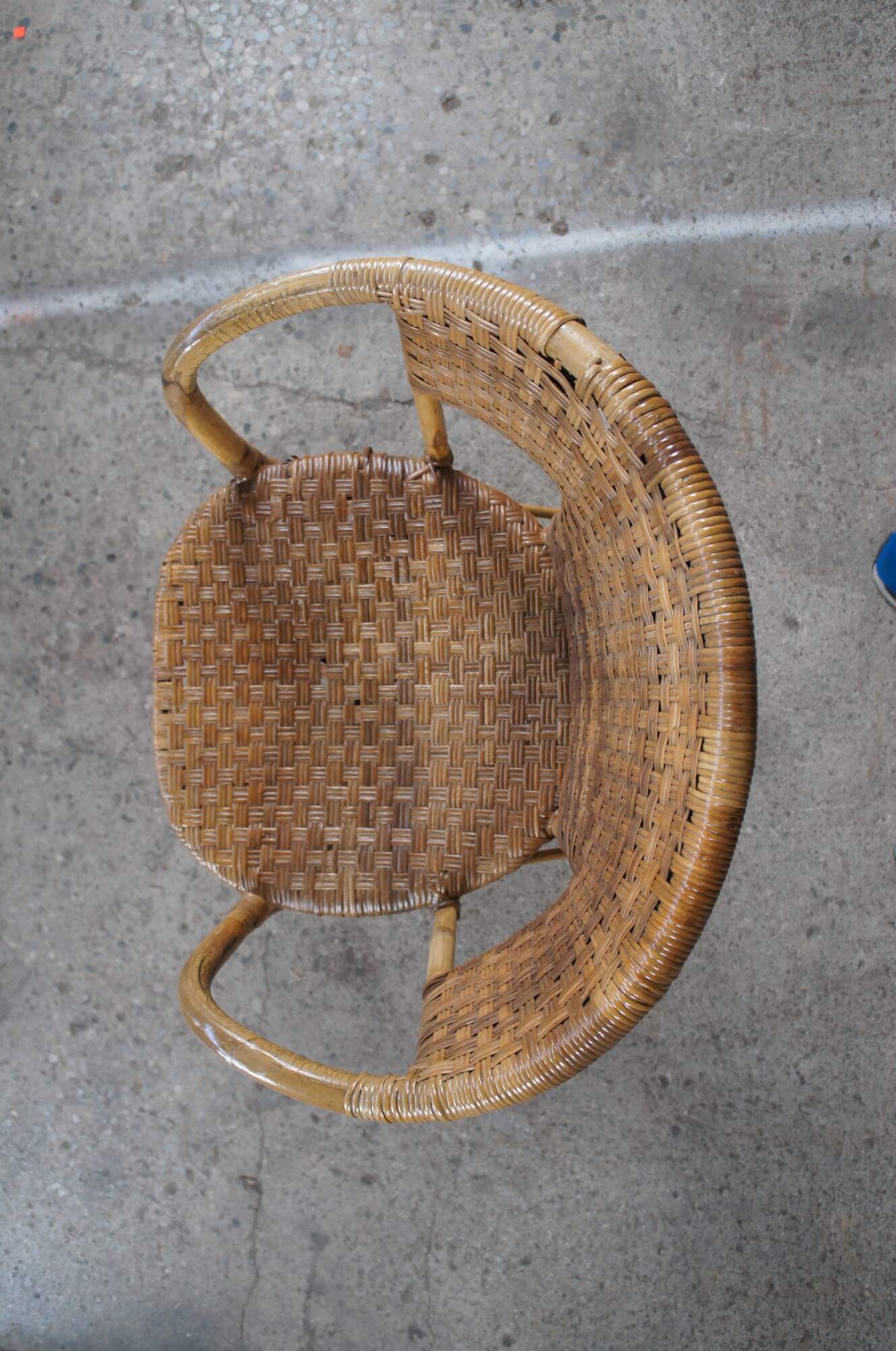 Antique bamboo and woven wicker / rattan armchair featuring rounded bentwood back with geometric woven patterns