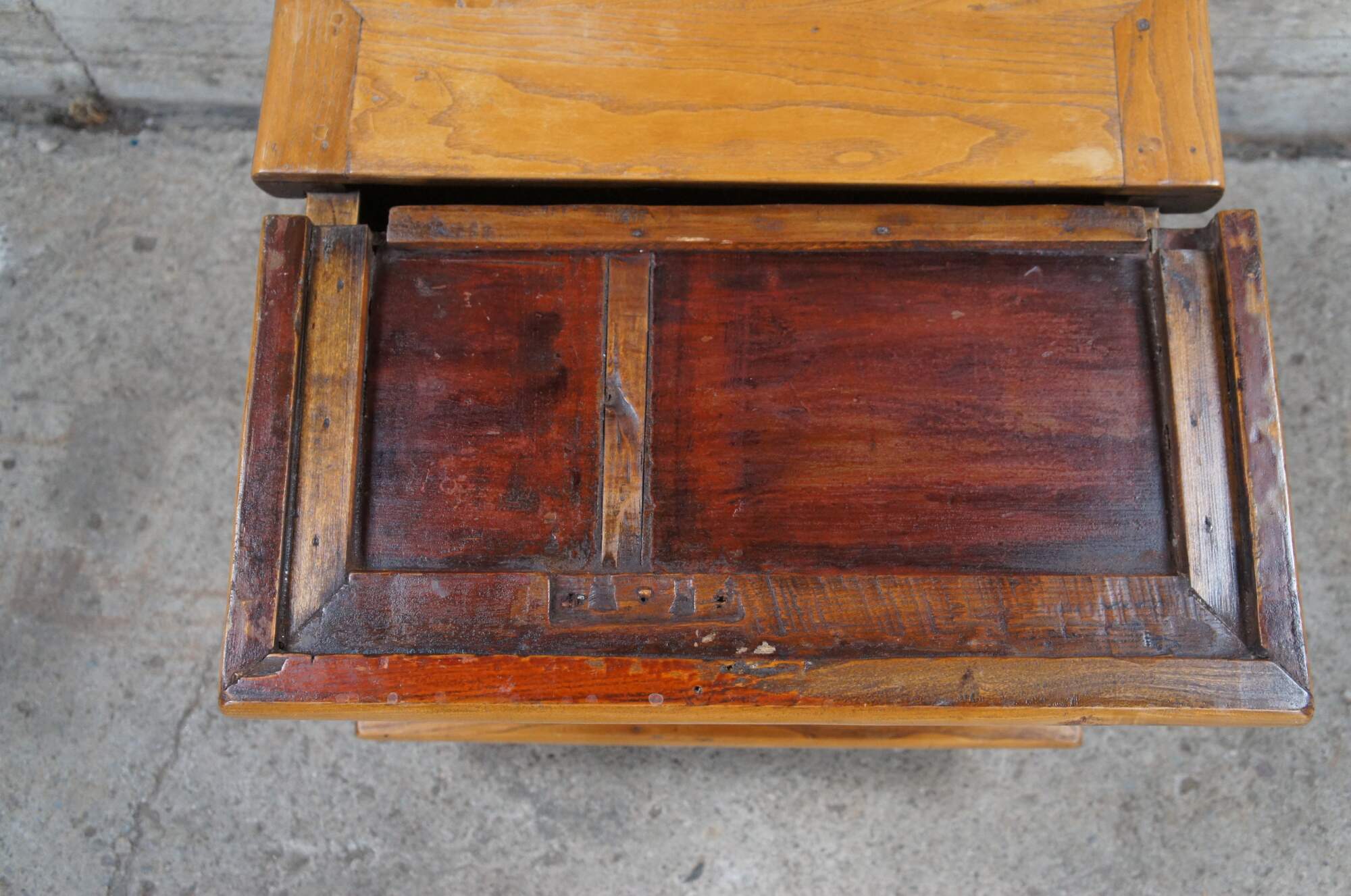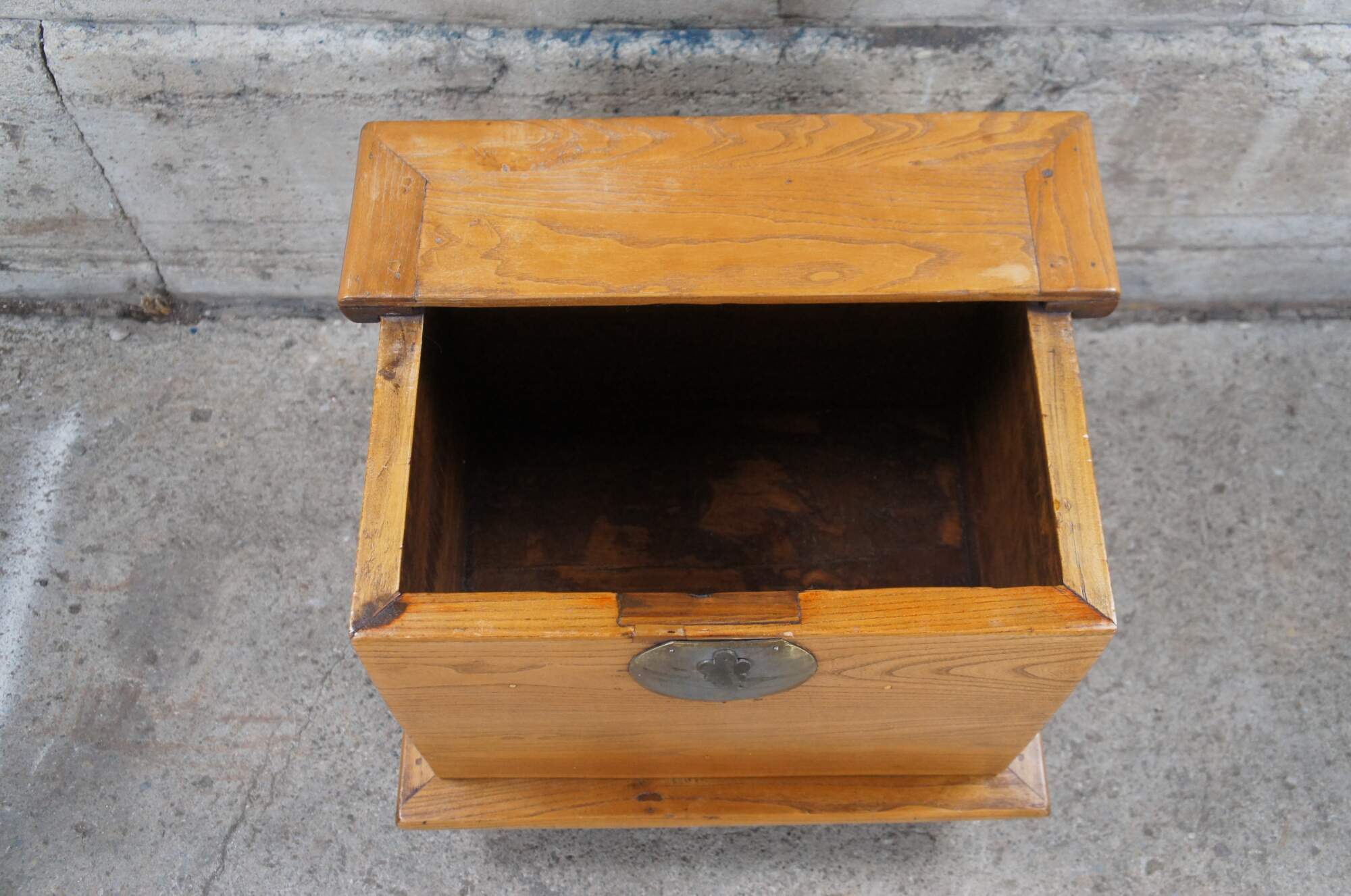 An exquisite pair of early Chinese Qing Dynasty chests on stands from the Shanxi Provenance, Circa 1750s. Made from elm with Ming inspired mortise and tenon bases supporting each lidded trunk. Each chest exhibits beautiful patina with hand dovetailed construction and decorative metal moon hardware. A veratile set that would work well as bedside tables, blanket chests, or side tables.