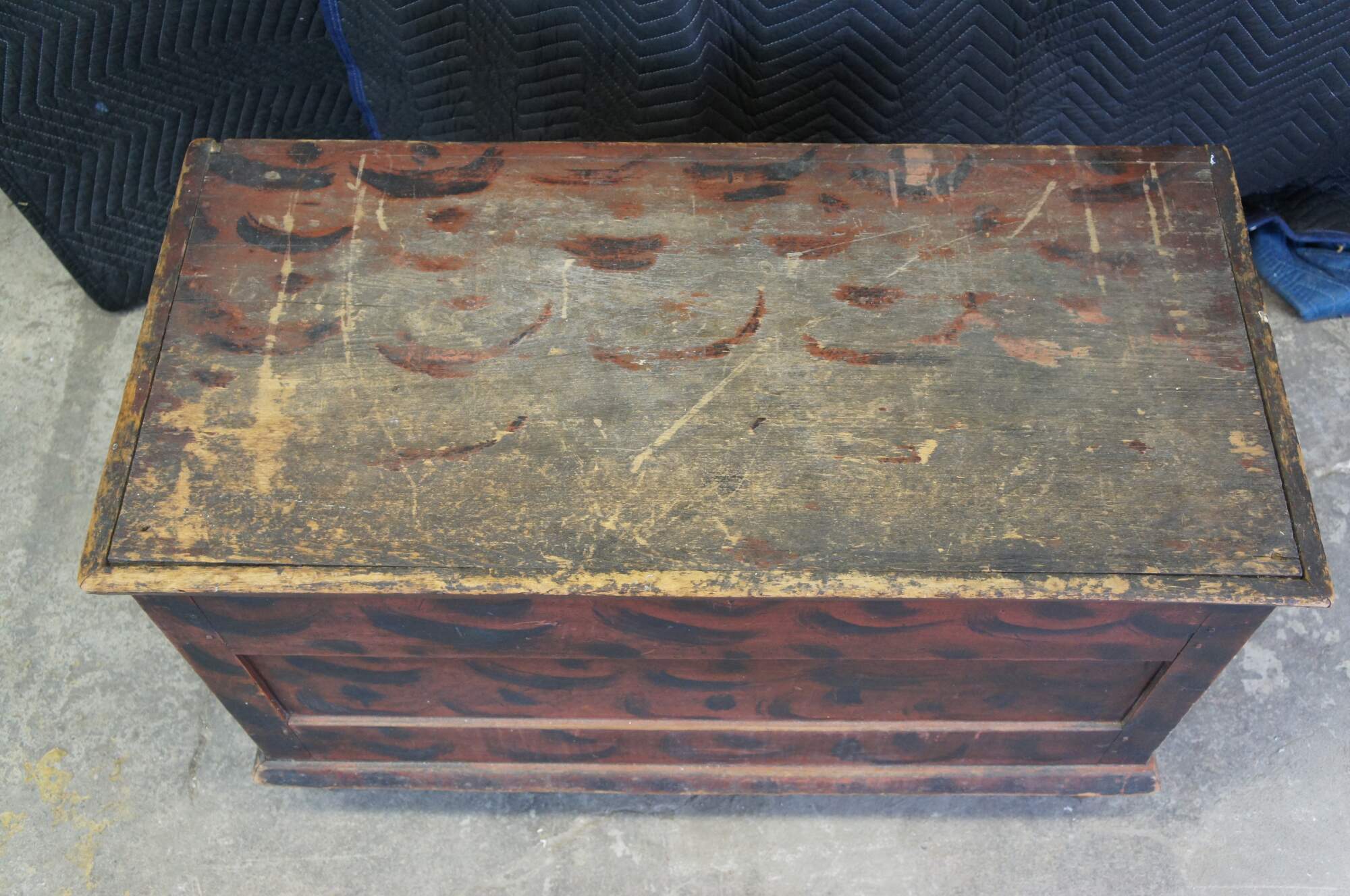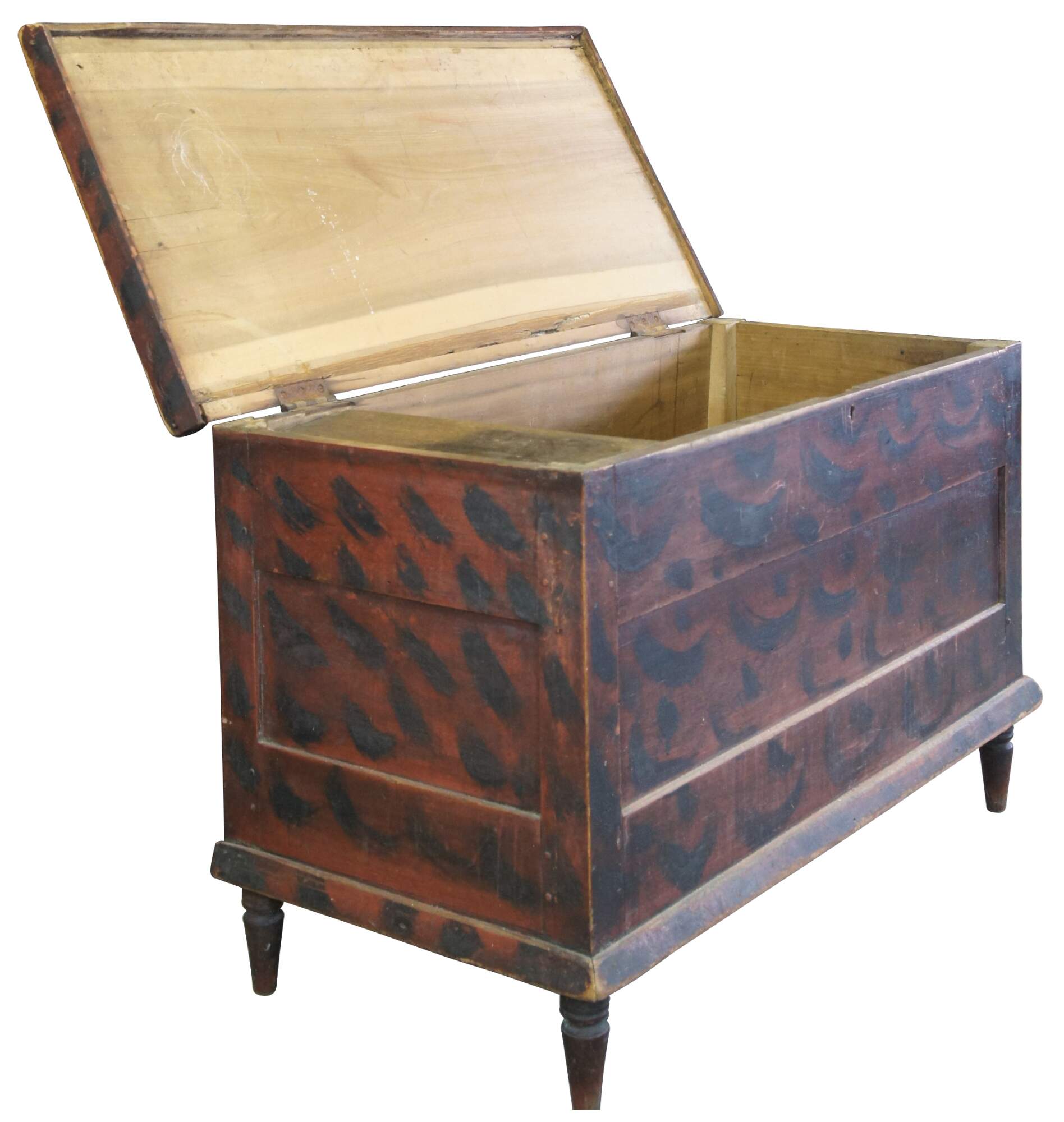 Antique early American folk art Pennsylvania German smoke painted pine blanket chest featuring turned feet and inner compartment. Circa 1st half of 19th century (1820s-1840s). Marked on backside with the initials MJP.