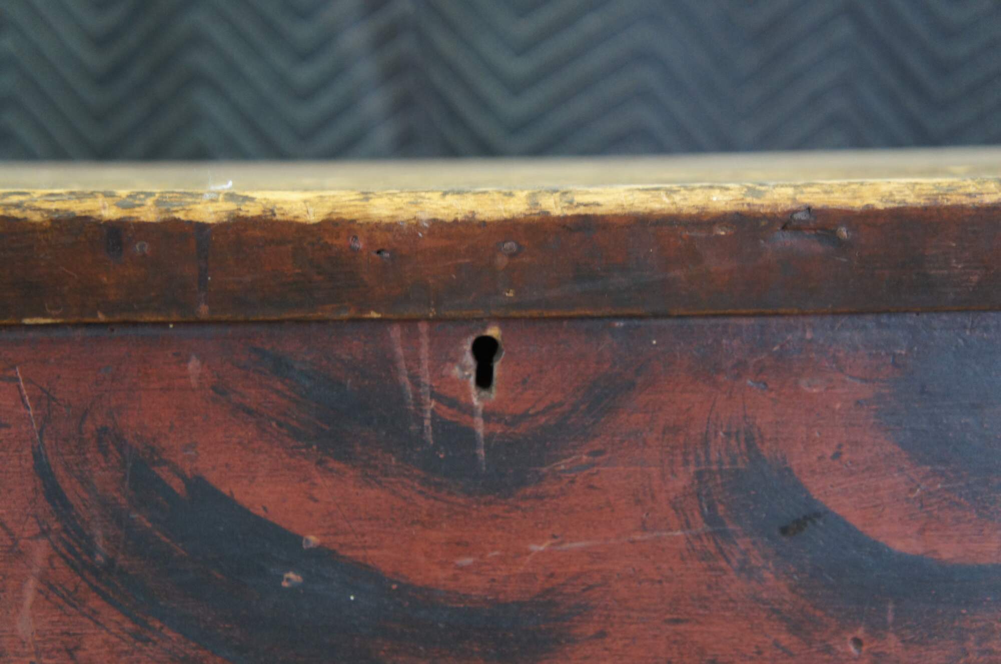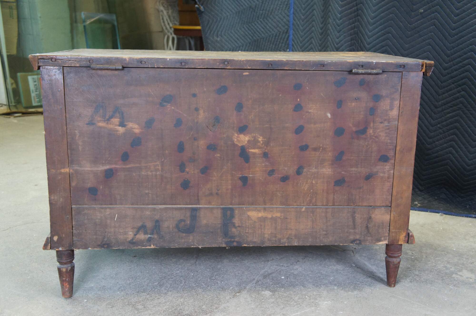 Good antique condition, wear and distressing commensurate with age and use, finish / paint loss, wear, wood loss, splitting, fading. Lid no longer has hinge