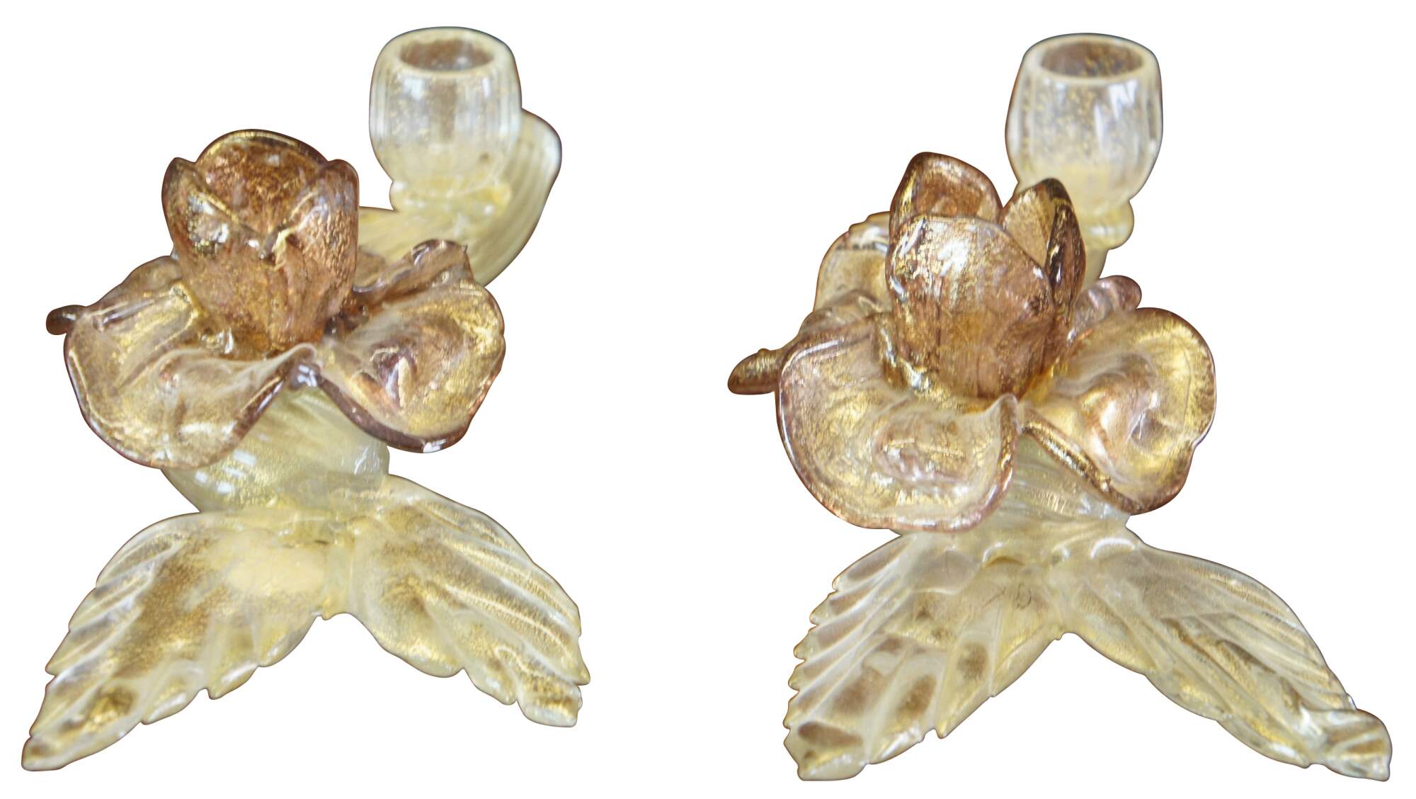 Two mid century Murano art glass double candle holders or candlesticks featuring flowers / floral form and 24k gold flakes. Venezia Italy.