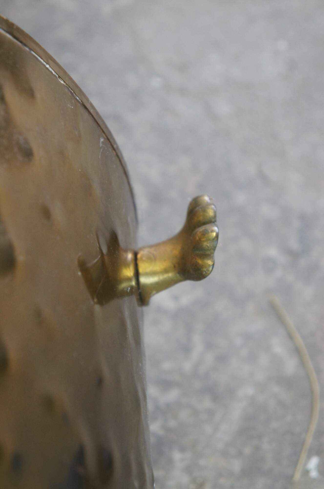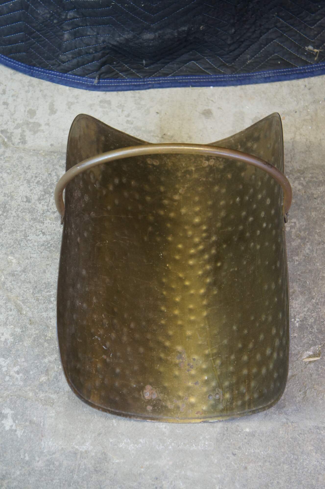 Mid century hammered brass log holder or basket featuring large articulating handle and claw feet.