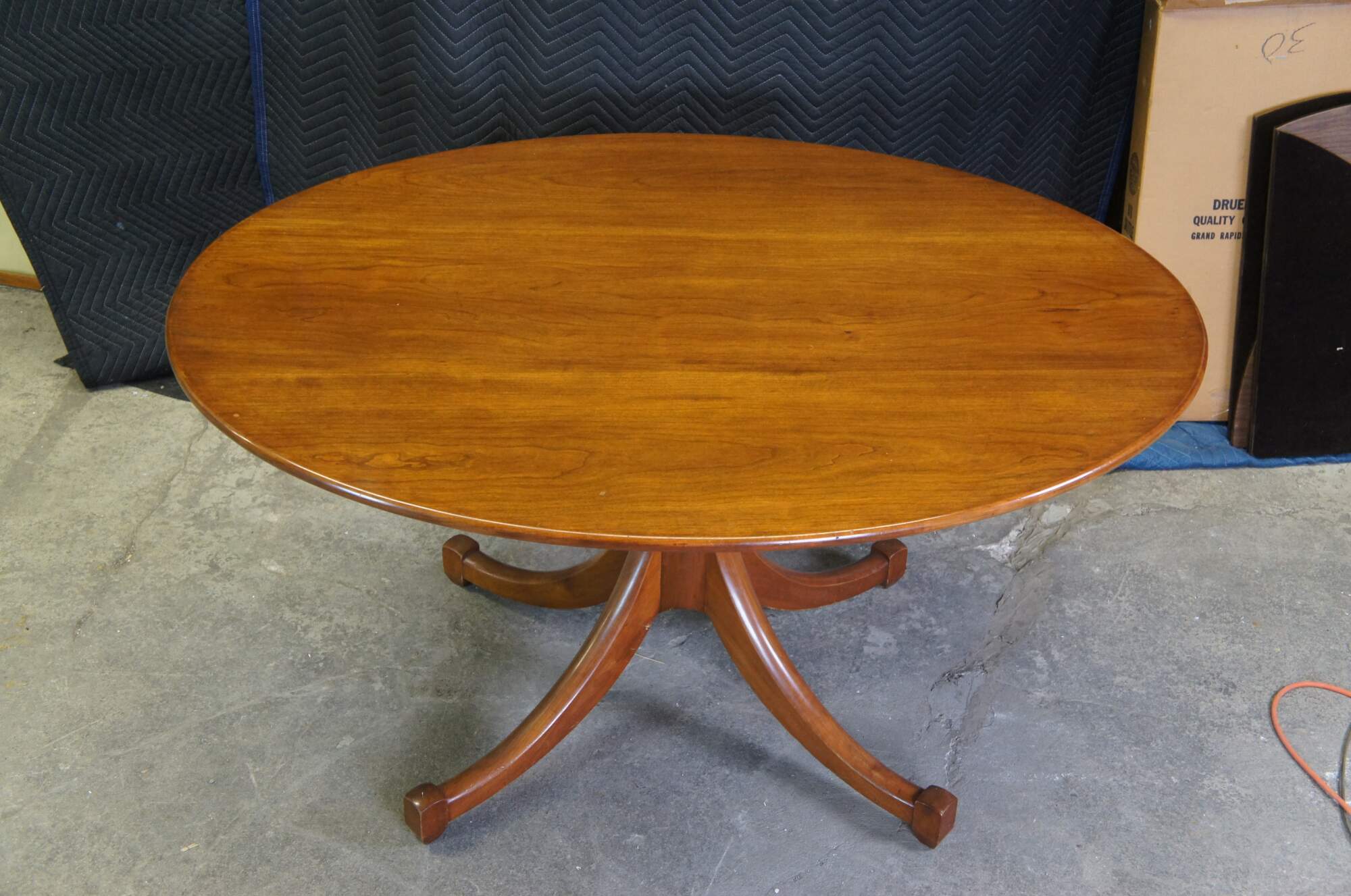 Handmade colonial inspired dining table, circa 1980s. An oval form crafted from solid cherry supported by a pedestal base with turned support leading to saber legs with squared feet.