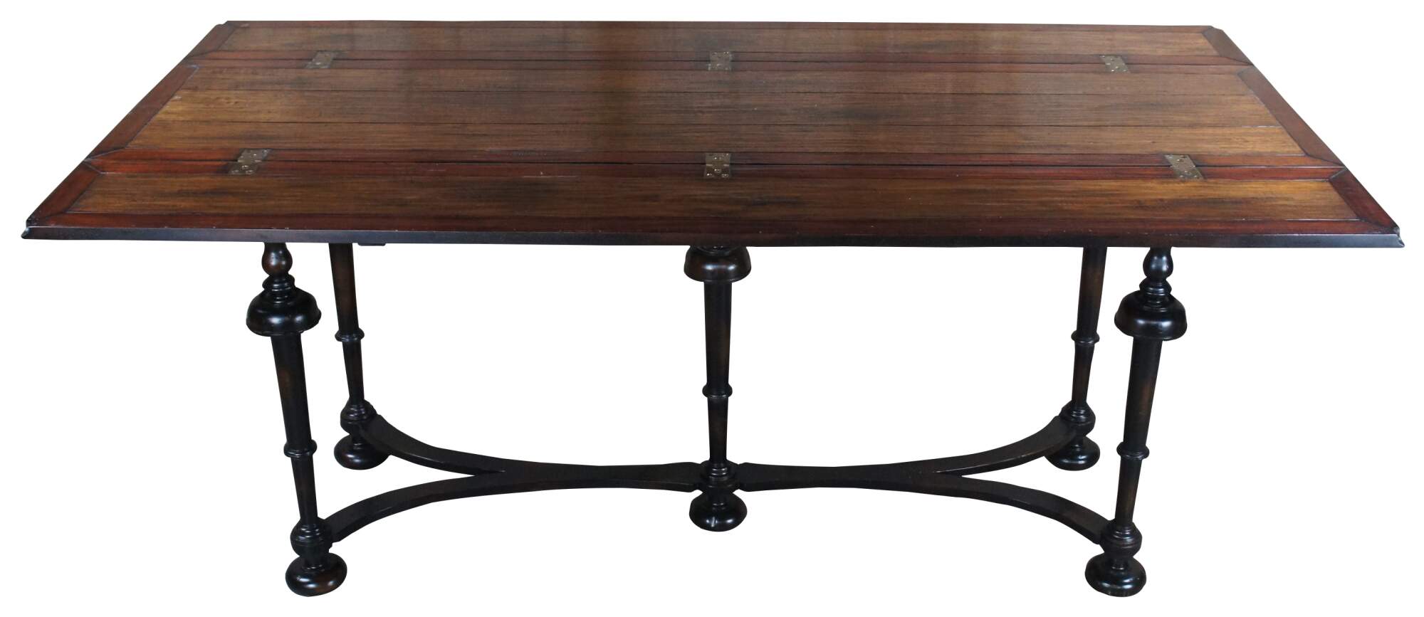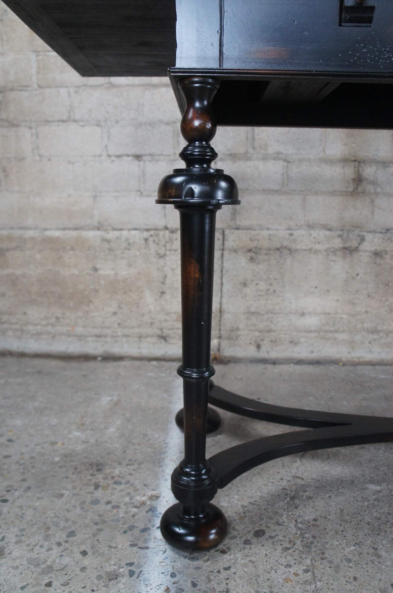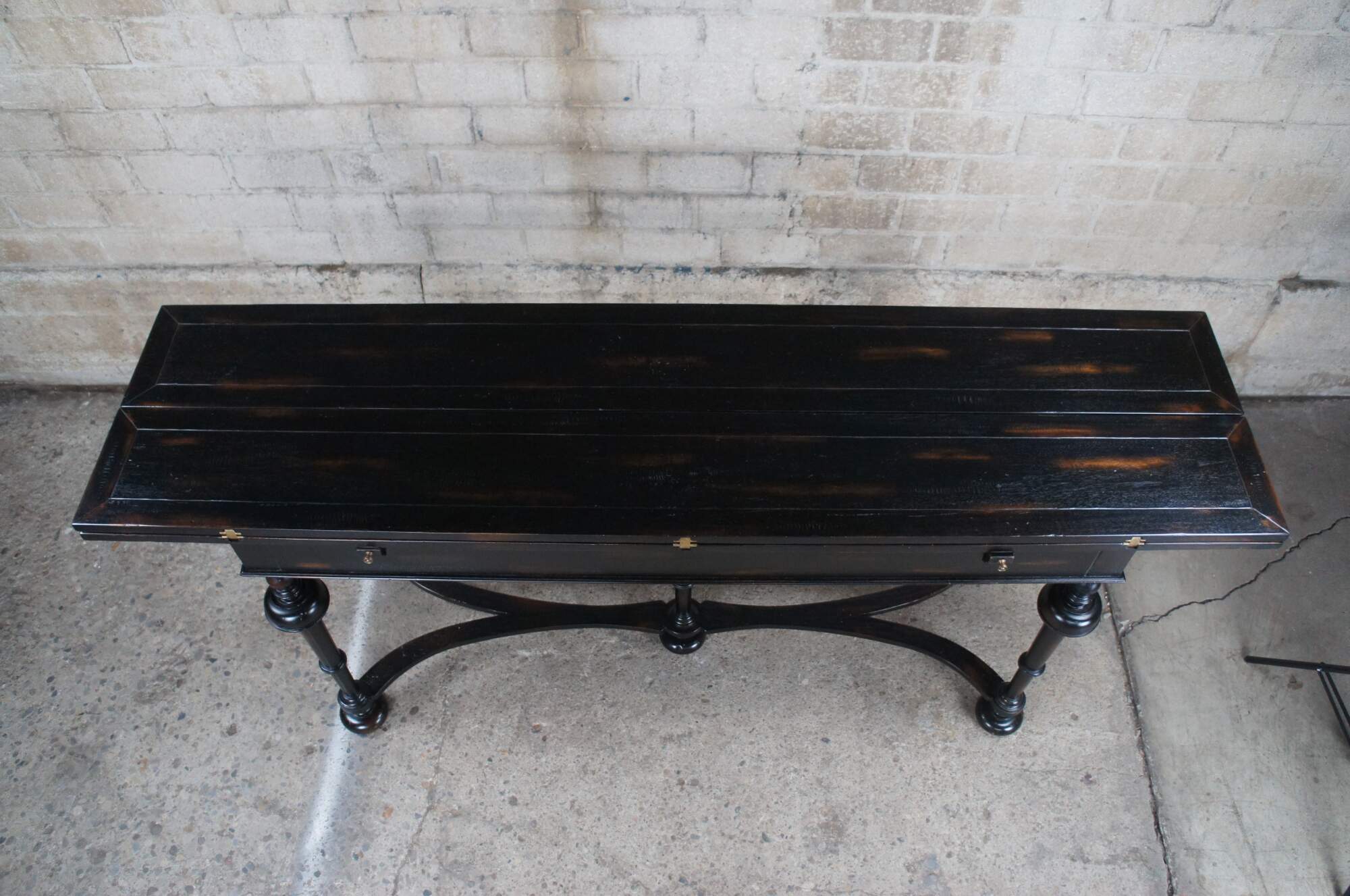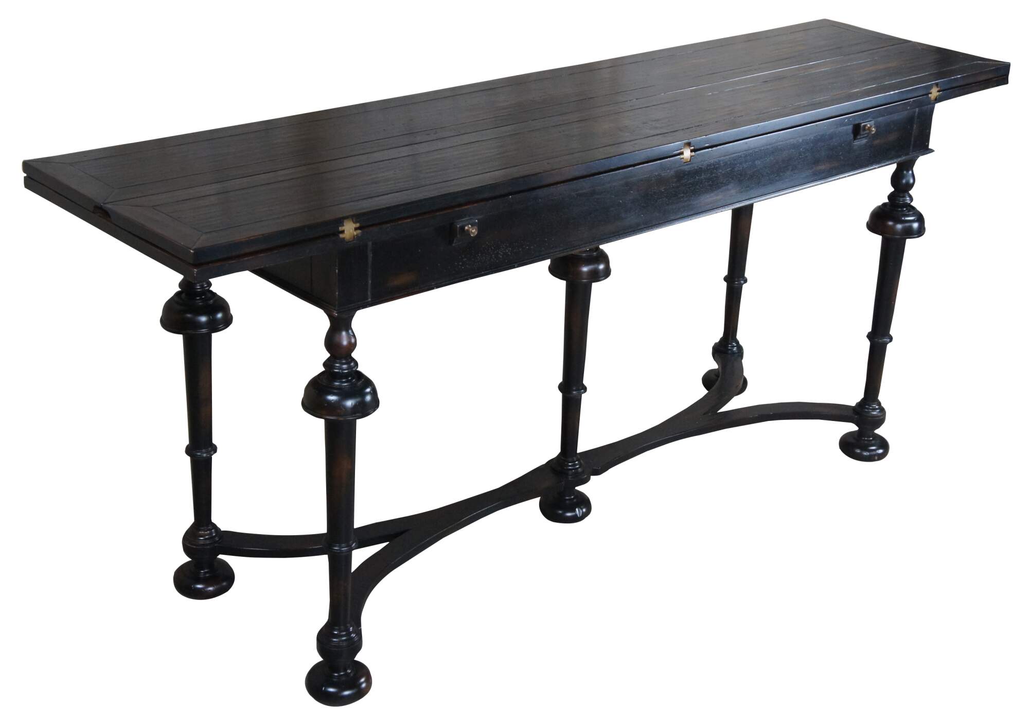 Henredon Acquisitions Townley Console Table with Fold Out Top, #3031-44-661. Inspired by classic William & Mary style cup and trumpet turned legs leading to bun feet interconnected by stretchers. Made from mahogany with an distressed and ebonized finish or rub that allows the natural woodtone to peak through. Once open the rich glow of the planked top invites you in to enjoy.