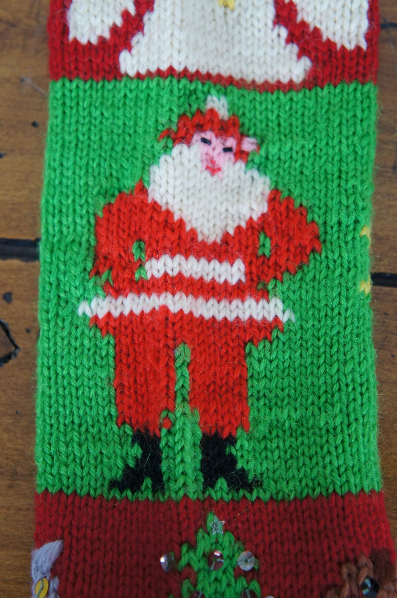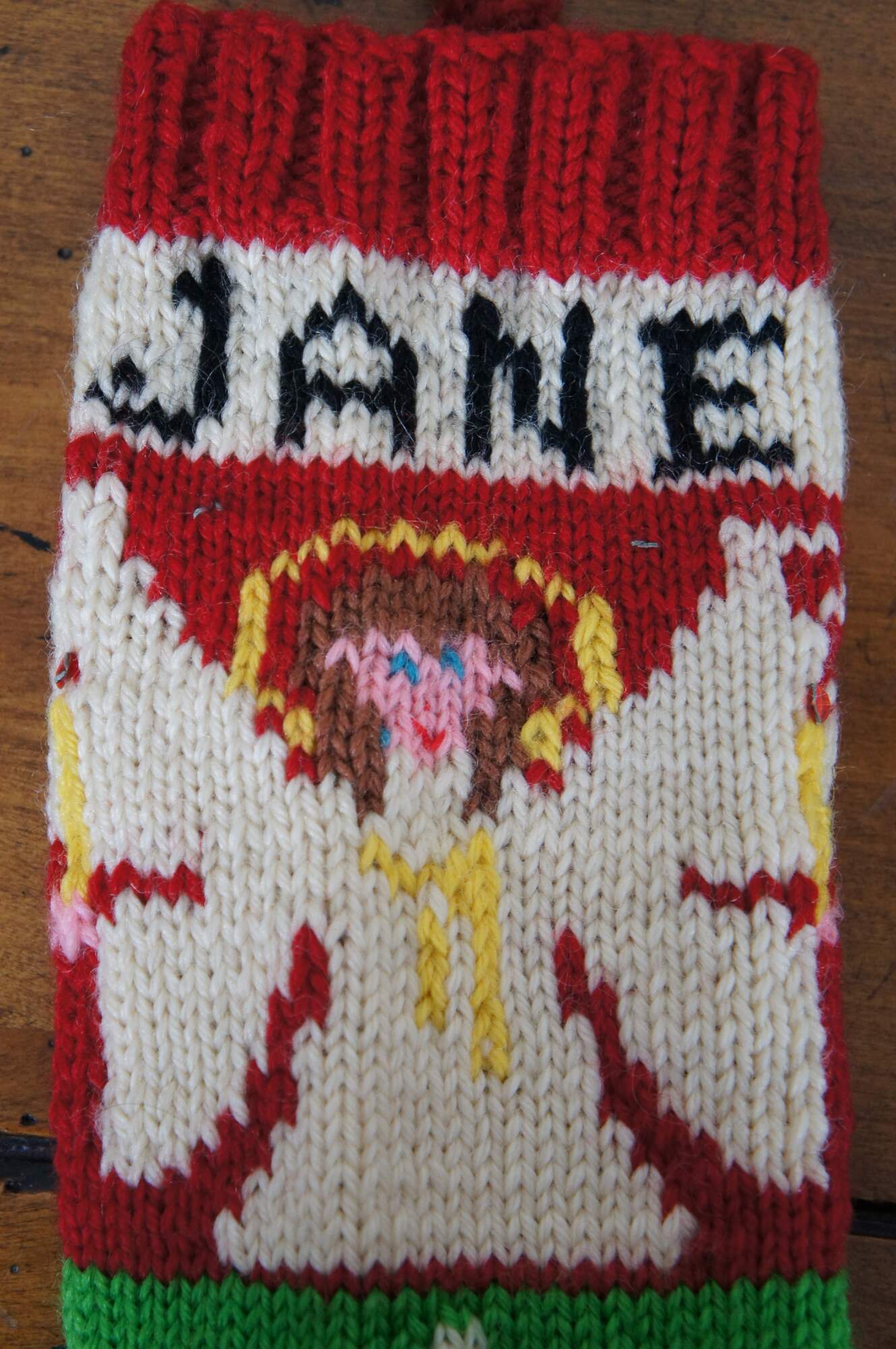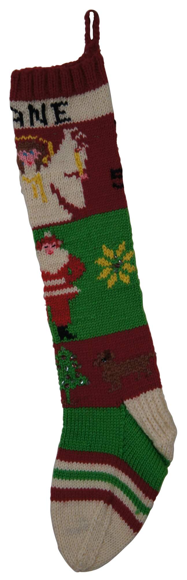 Mid century hand knit Christmas stocking featuring red, white and green stripes decorated with a Christmas angel, Santa Claus, a Christmas tree, a dog, cat, yellow poinsettia, and candle, accented with sequins. Personalized with the name Jane and the date 10-1-52.