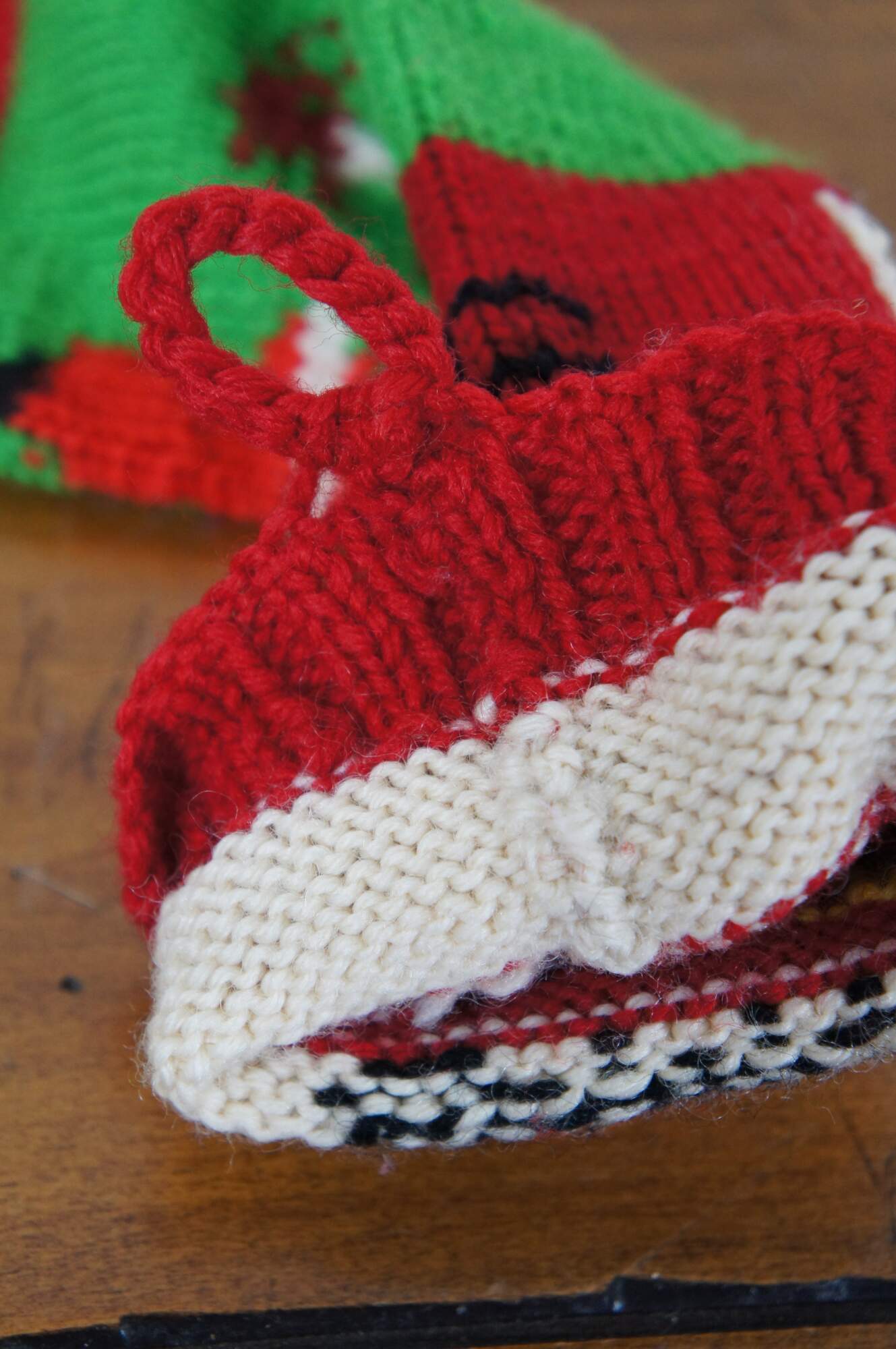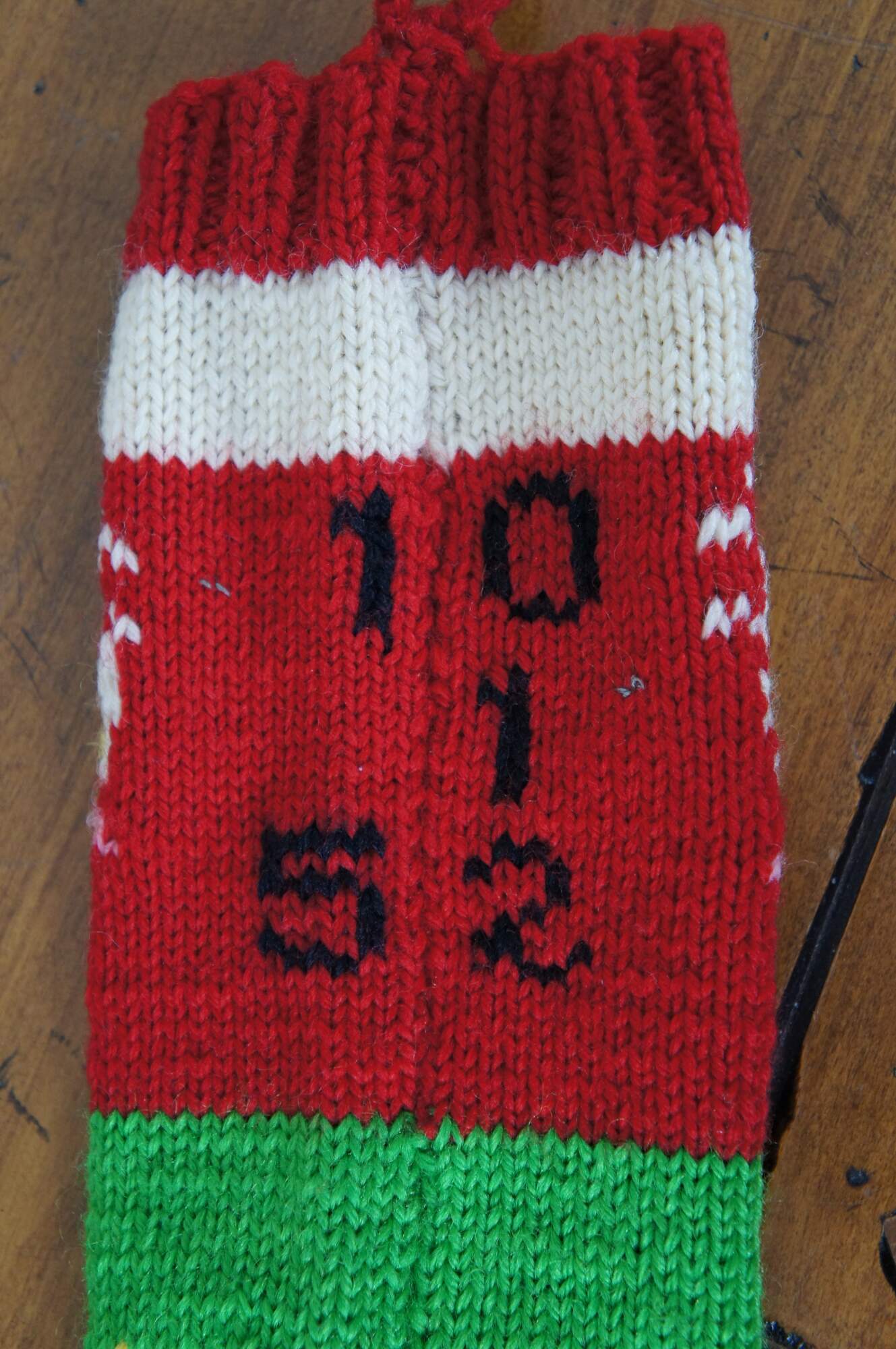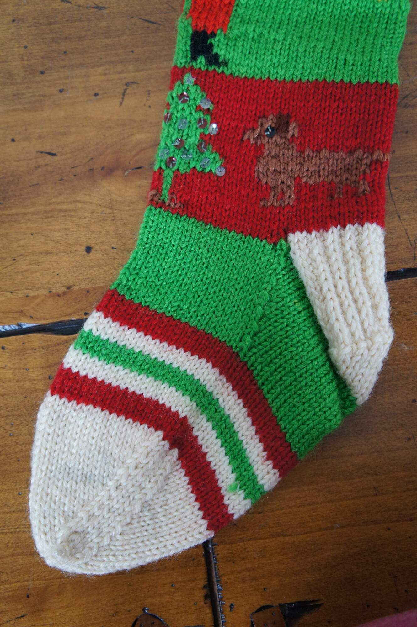 Mid century hand knit Christmas stocking featuring red, white and green stripes decorated with a Christmas angel, Santa Claus, a Christmas tree, a dog, cat, yellow poinsettia, and candle, accented with sequins. Personalized with the name Jane and the date 10-1-52.
