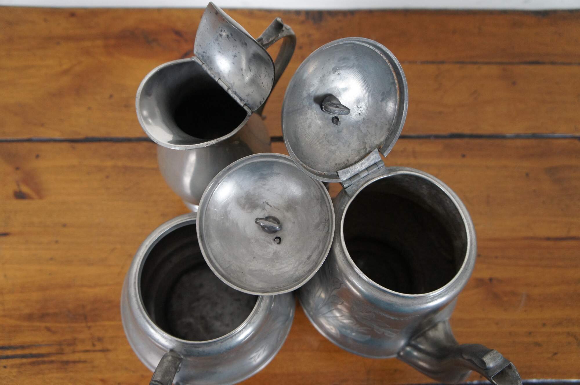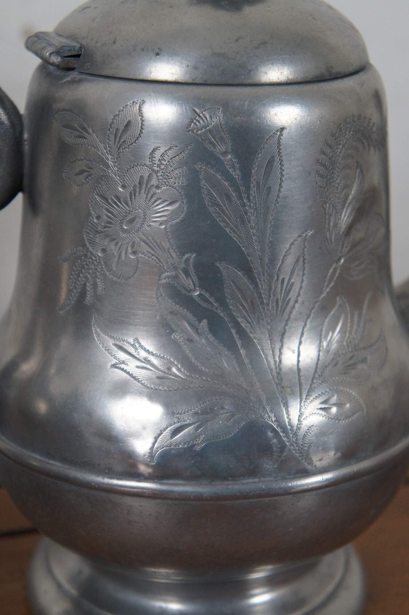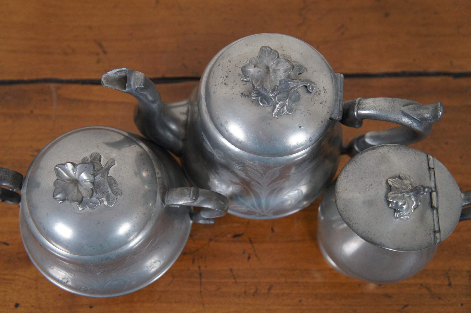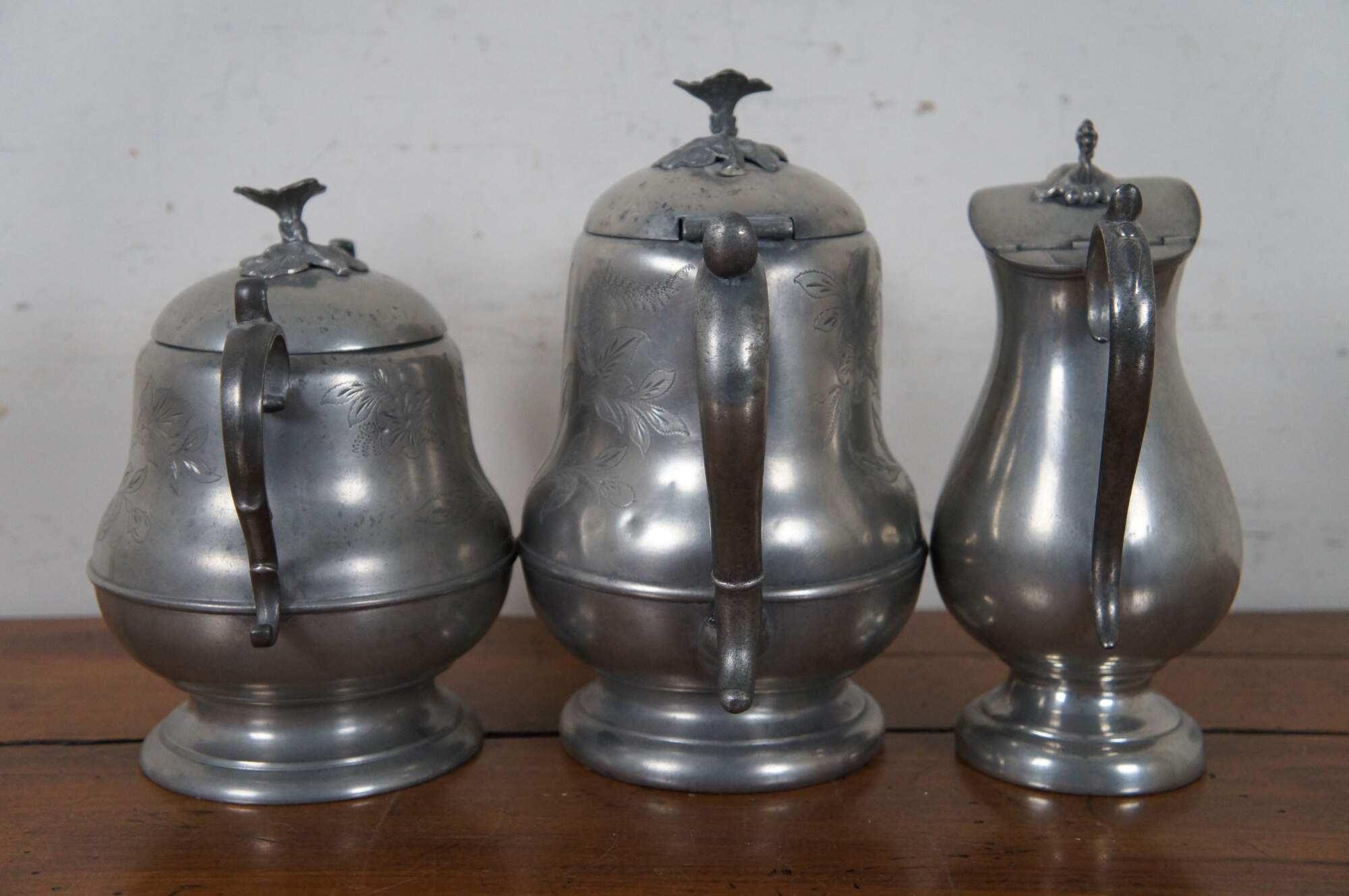 Set of three antique pewter pieces circa late 19th century - 1880’s to early 1890’s – the set includes a teapot and lidded sugar bowl with etched flowers and floral finial, and plain creamer with floral finial. Pieces are marked Homan & Co Cincinnati 3, H. Homan IX, and Homan & Co Cincinnati IX.