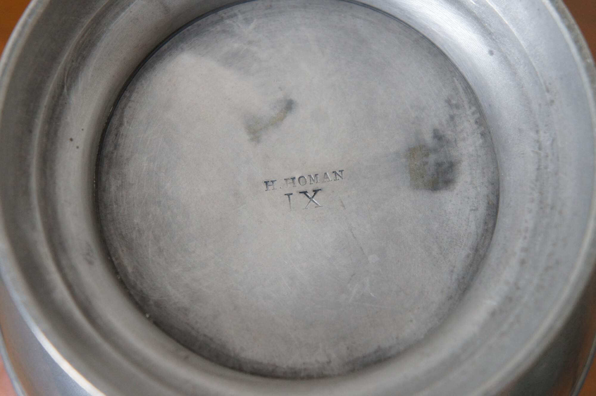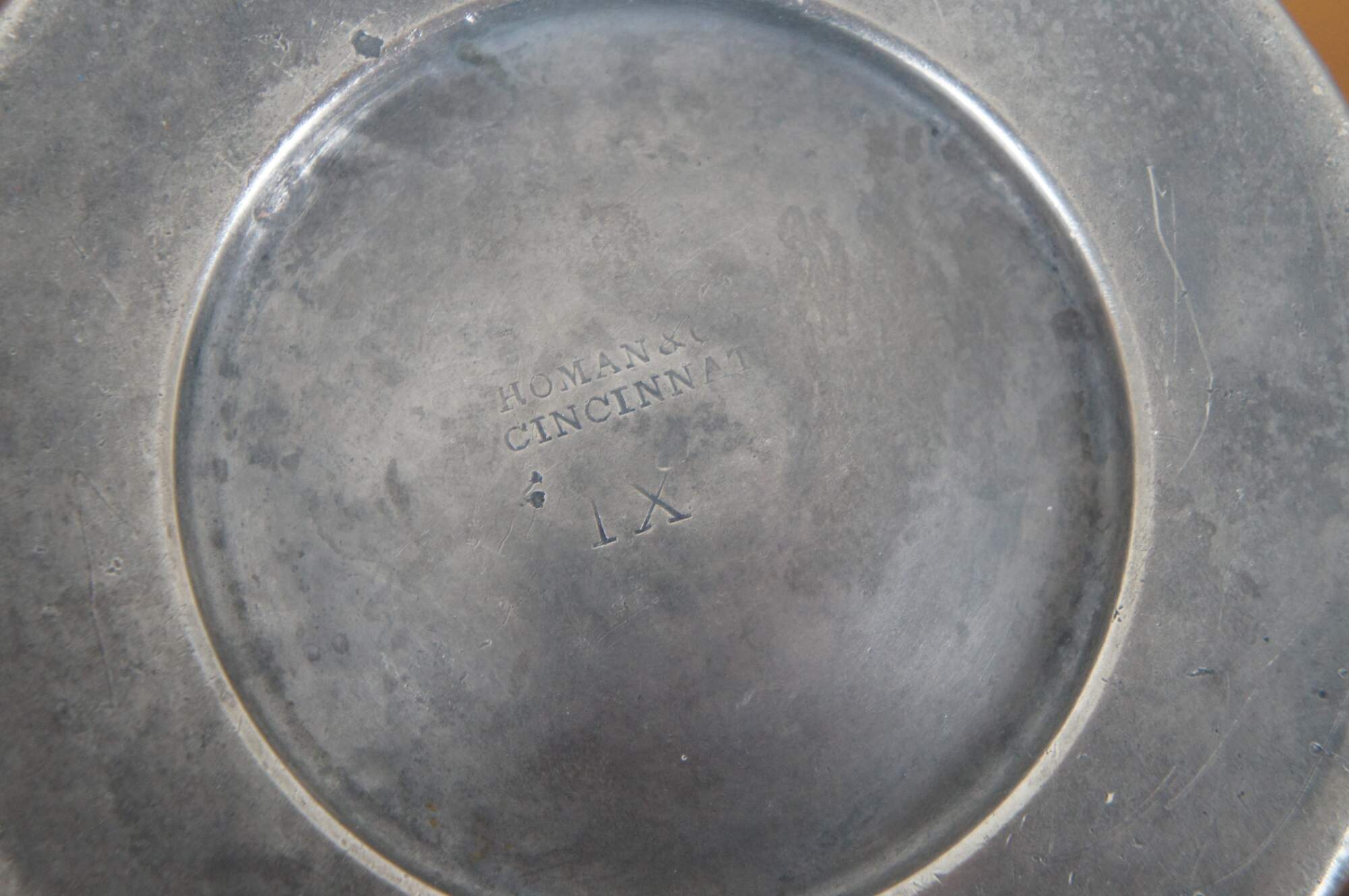 ""Homan Manufacturing Company was founded in Cincinnati Ohio in 1847 by Henry Homan and Asa F. Flagg as manufacturers of Britannia ware under the name Flagg & Homan. The Homan family managed the business as Homan & Co until 1887, gradually changing from the manufacture of pewter, Britannia metal and German silver to electroplated silverware. Around 1896 the name of the firm was Homan Silver Plate Company, which was succeeded (between 1904 and 1915) by Homan Manufacturing Company. The firm went out of business in 1941.""