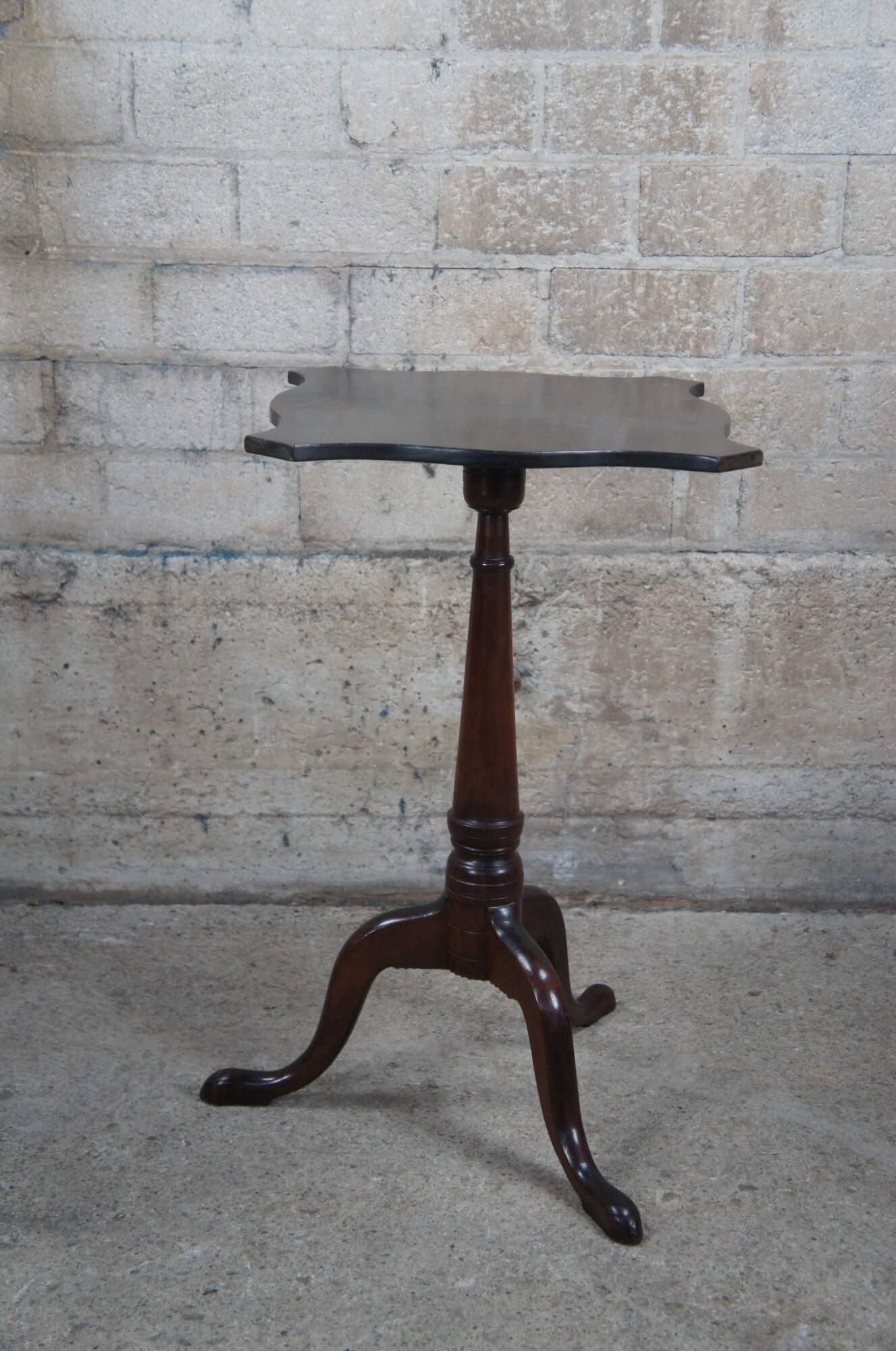 A beautiful 18th Century colonial mahogany Newport, Rhode Island candlestand. Features a serpentine turtle top over a conical shaft leading to a tripod base with notched and shaped returns on cabriole legs and slipper feet. The conical shaft relates to the nautical aspect of the area and is very popular amongst period pieces. This candlestand in particular has a very pronounced conical shaft which distinguishes it from many others.