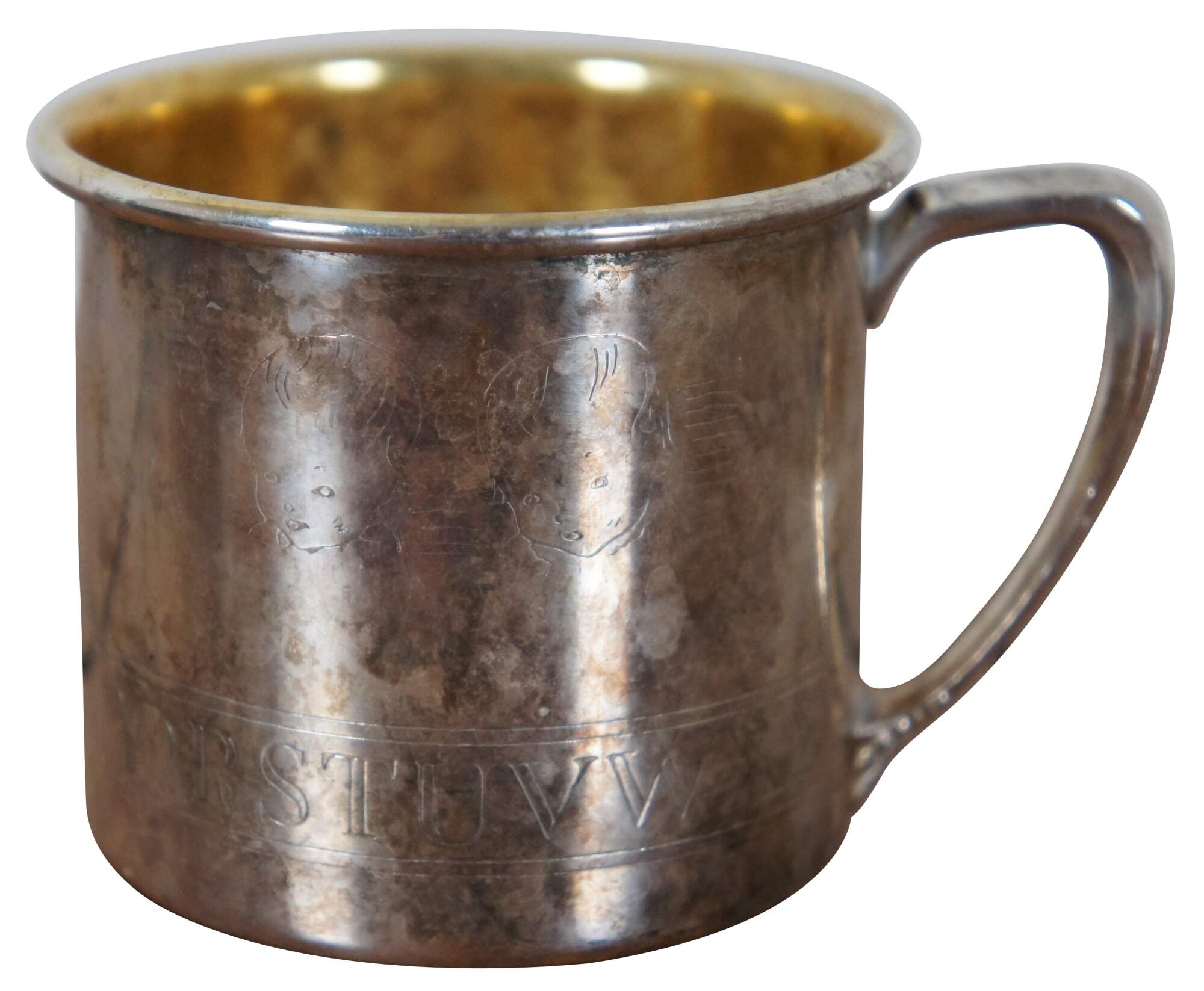 Vintage Oneida Silversmiths silver plate Alphabet Child Cup number BG-9650. Etched with the alphabet and baby faces. Includes plastic “sippy” top and original box.
