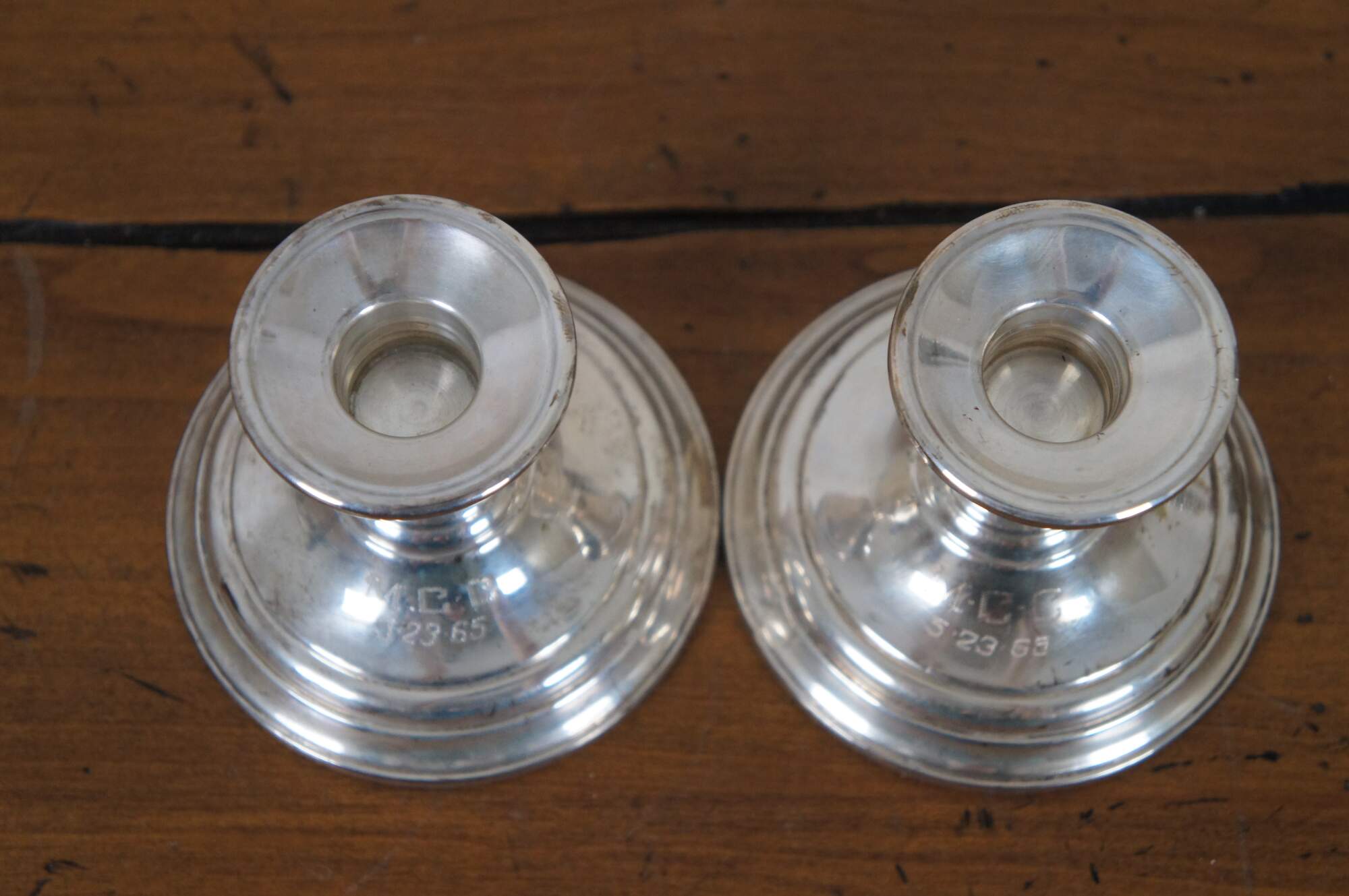 Pair of mid century Berkeley by International silver Company reinforced sterling silver candlestick holders, engraved with “MCC 5-23-65"" which stands for Moraine Country Club, a private golf course in Dayton Ohio.