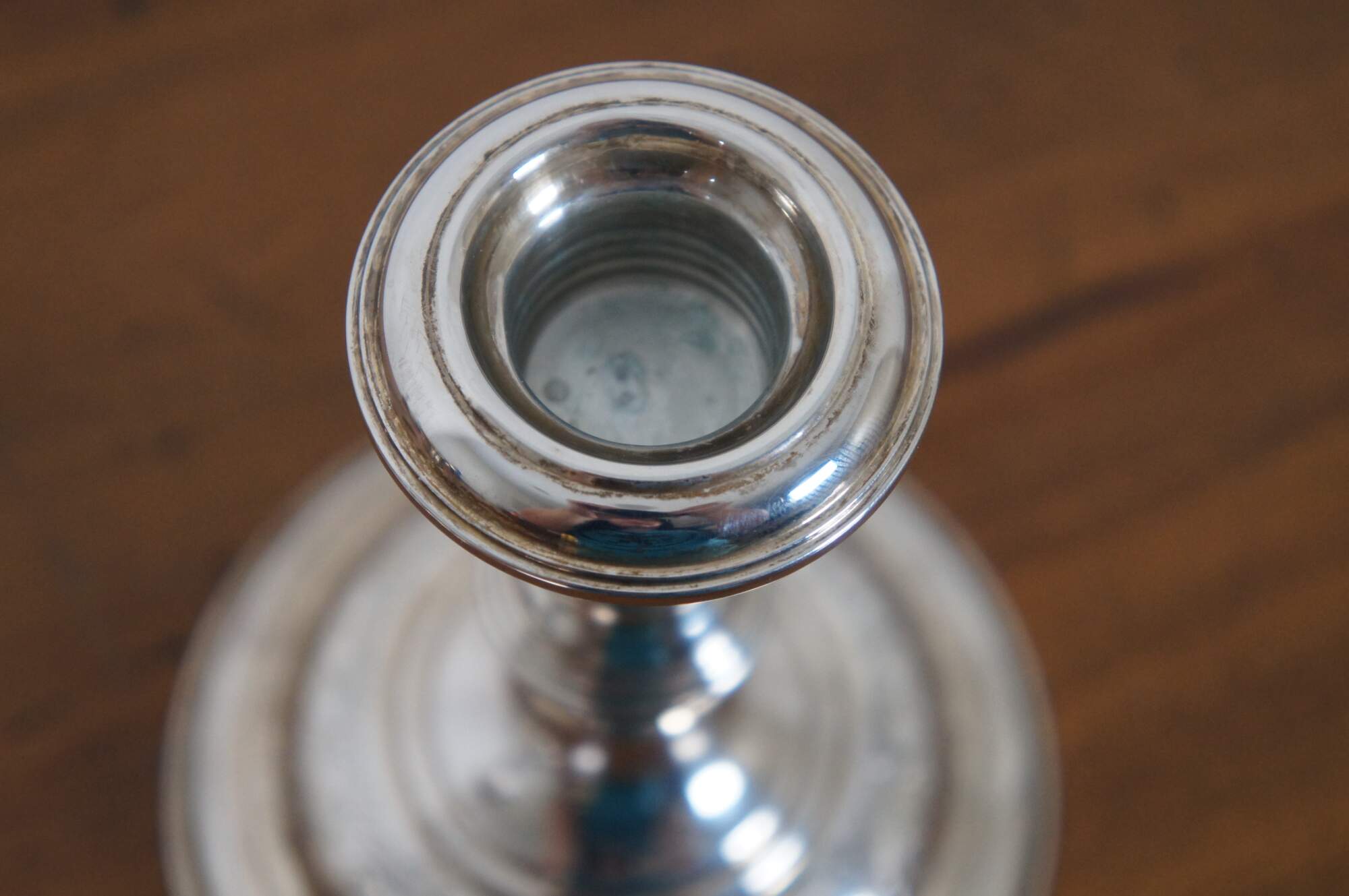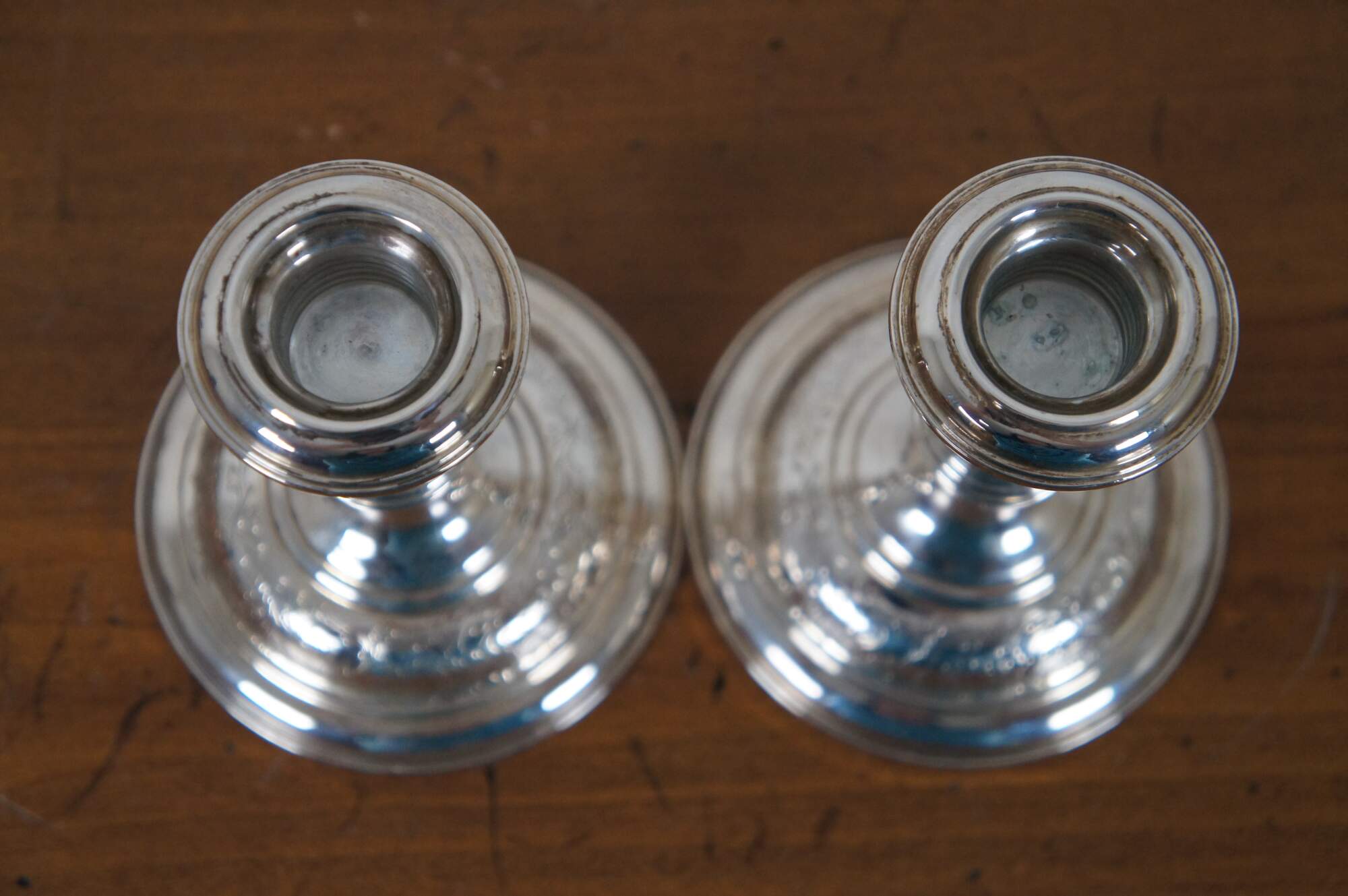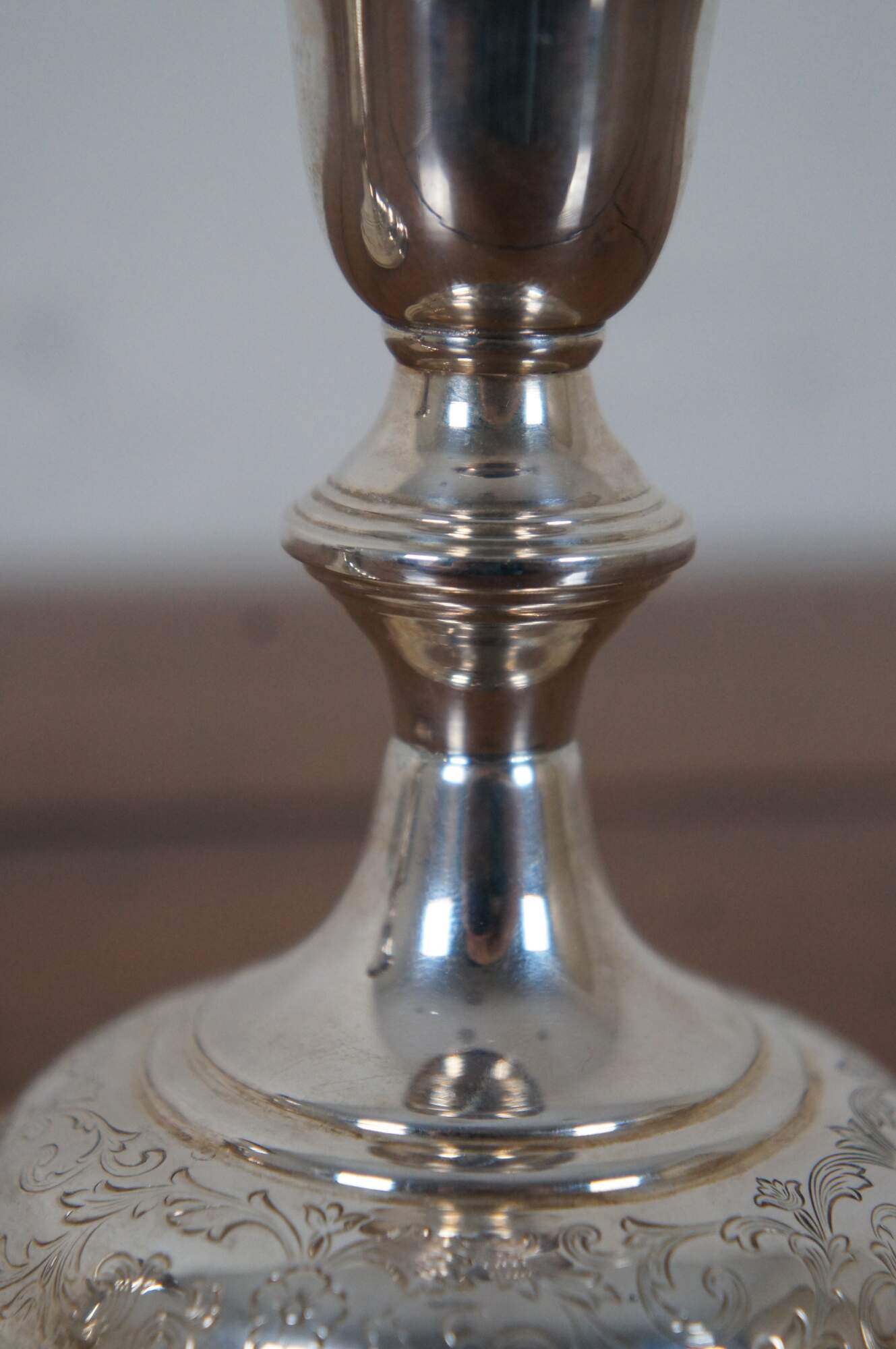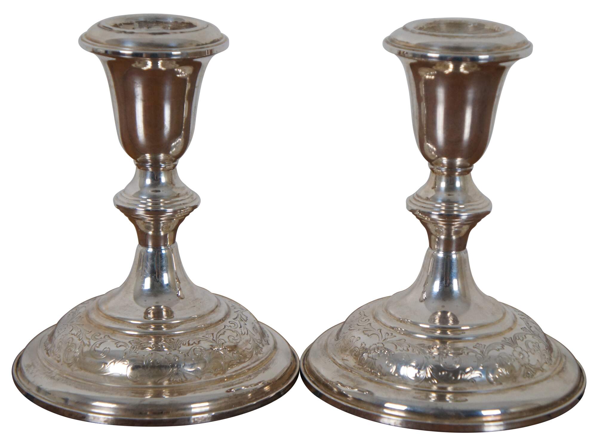 Pair of mid century S. Kirk & Son number 5012 reinforced sterling silver taper candlestick holders with etched floral pattern around the base.