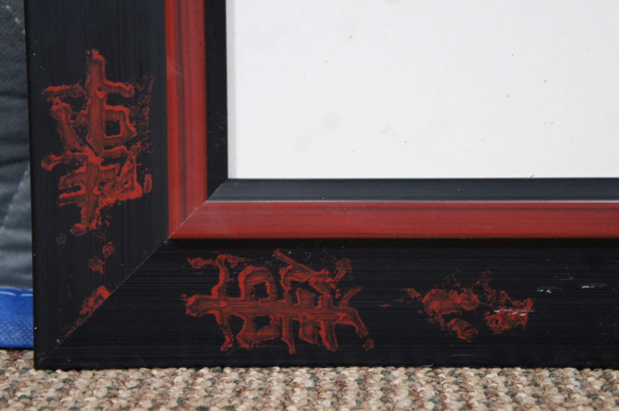 Japanese gyotaku print of a red lobster. Signed in plate by the artist. Originally produced by the FishAye Trading Company, beach theme. Re-framed in black and red with stamped Chinoiserie calligraphy.