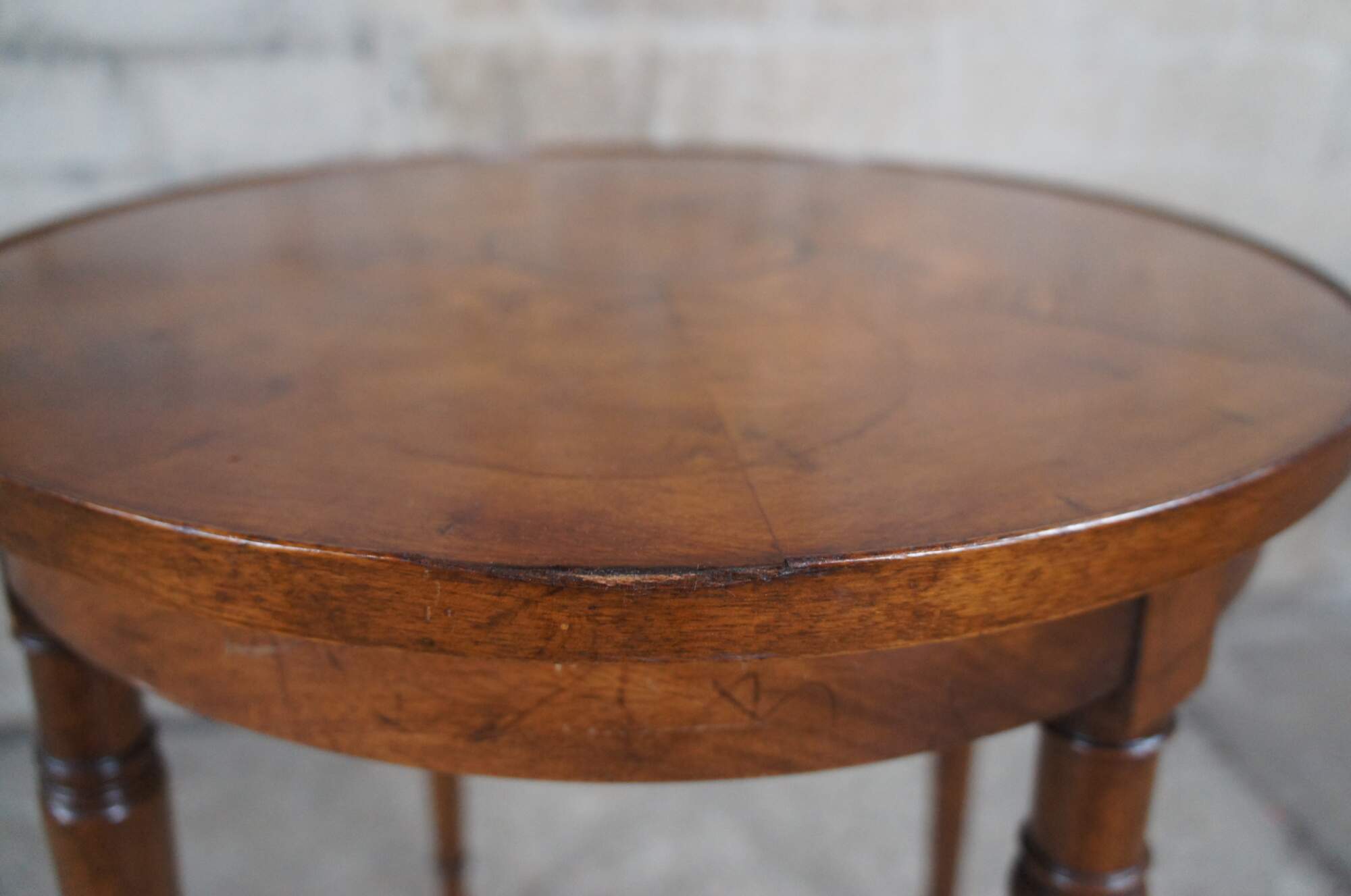 Beautiful pair of Old Colony Furniture side, end tables or nightstands. Made from walnut with a round matchbook inlaid top over flared and turned spindle legs.