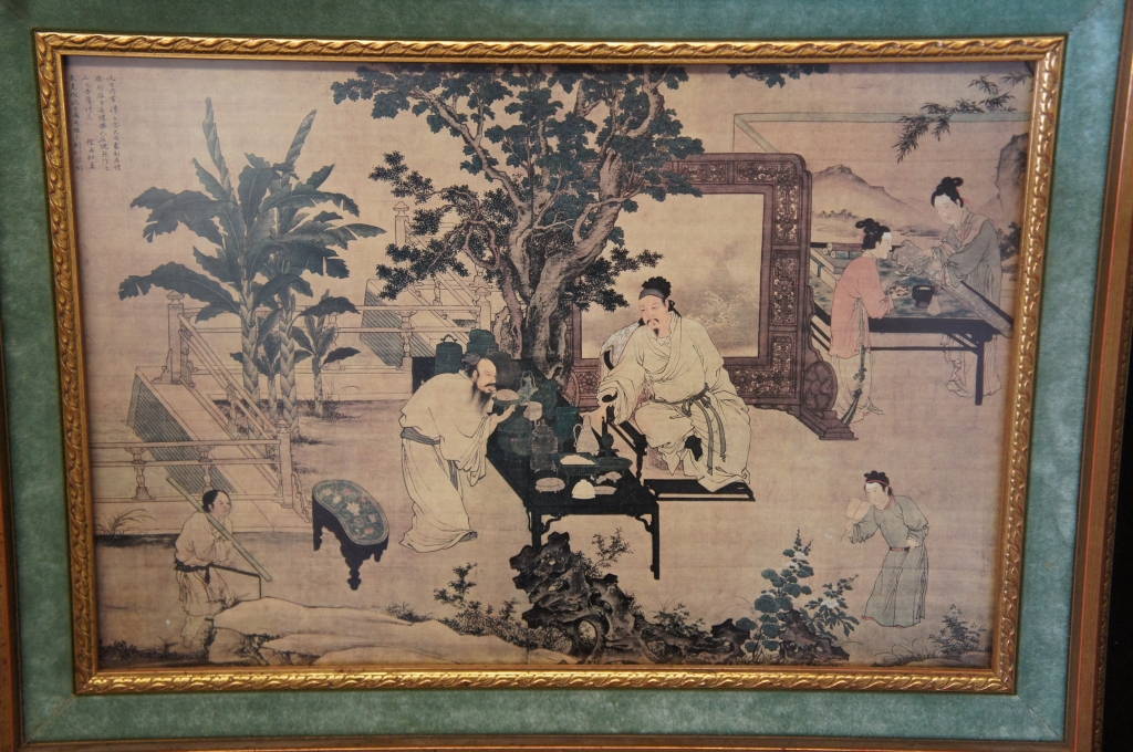 This is a gorgeous print. It is a print of a Japanese piece of art that appears to show the emperor being served by his workers. This piece is framed and matted in a gold frame with a green fabric border. This piece has fabulous color and attention to detail. A great gift or addition to your home!