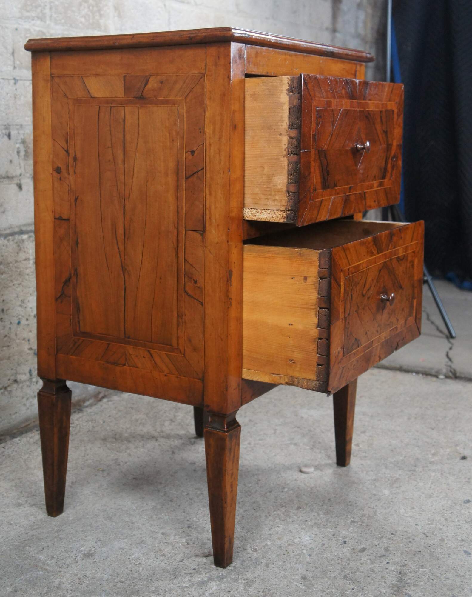 Italian Neoclassical commode or bedside chest, circa first half 19th century. Made from walnut and fruitwood with 2 hand dovetailed drawers of pine construction. The table top and drawer fronts feature a beautiful matchbook veneer with banding and inlay. The table is raised over four square tapered legs. A warming addition to any space.