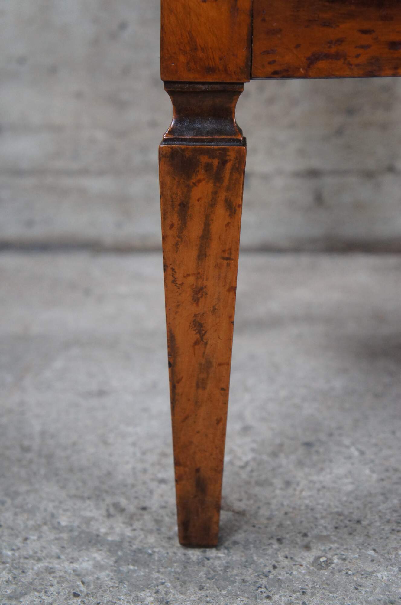Good antique condition with wear and distressing commensurate with age. Some staining/finish wear to the top. splitting the veneer as wess as a chip to the lower left edge of drawer.