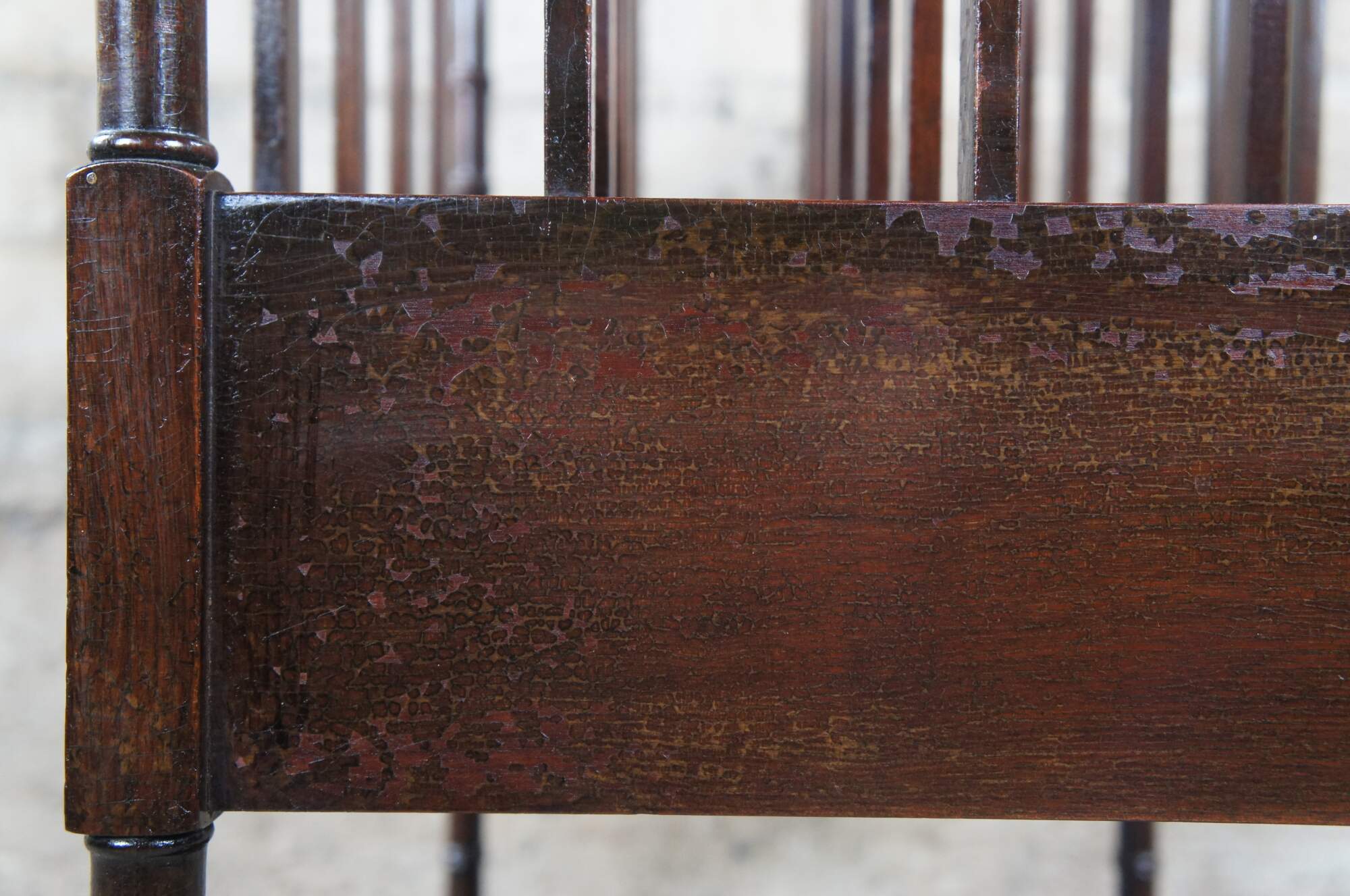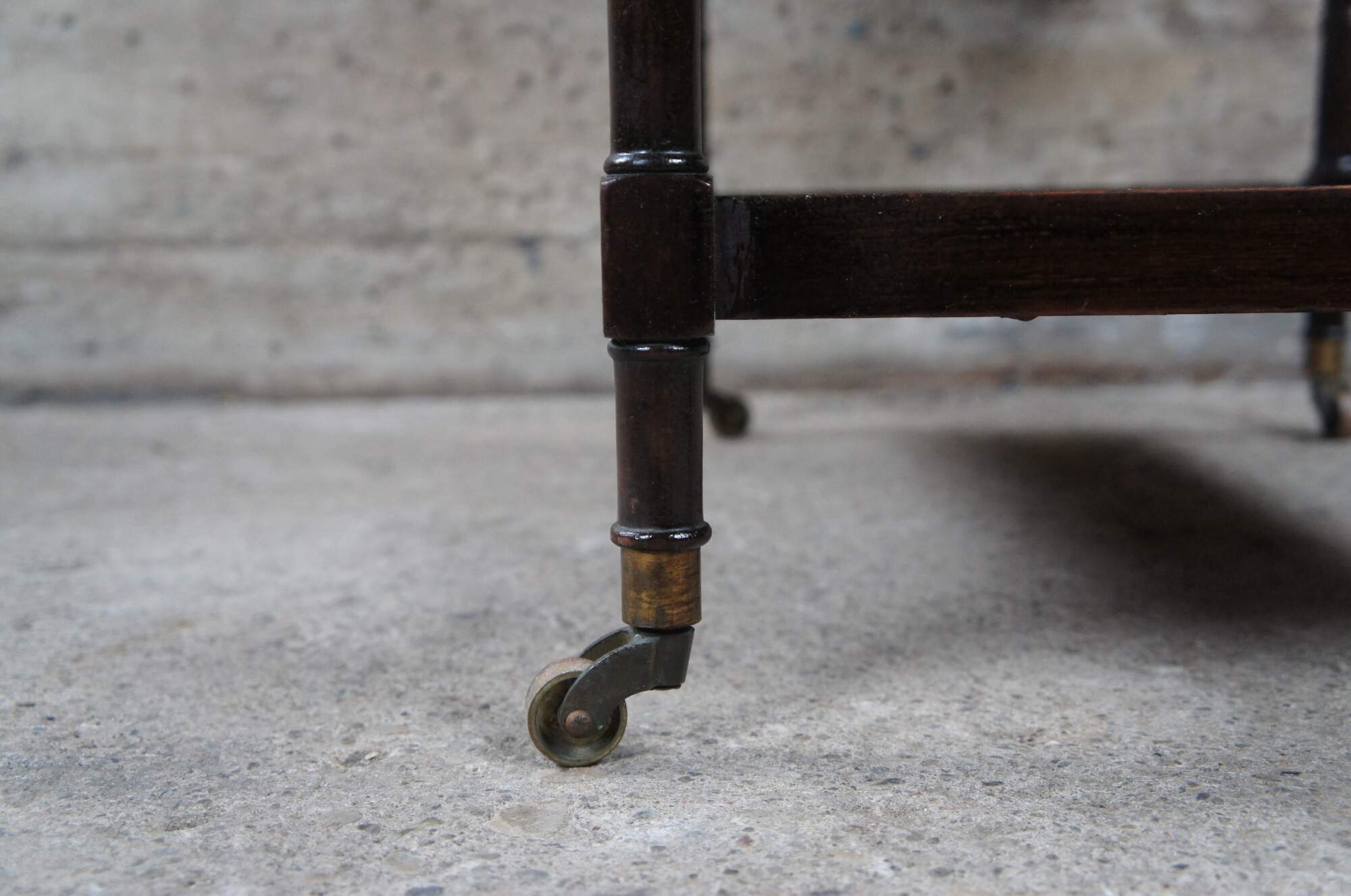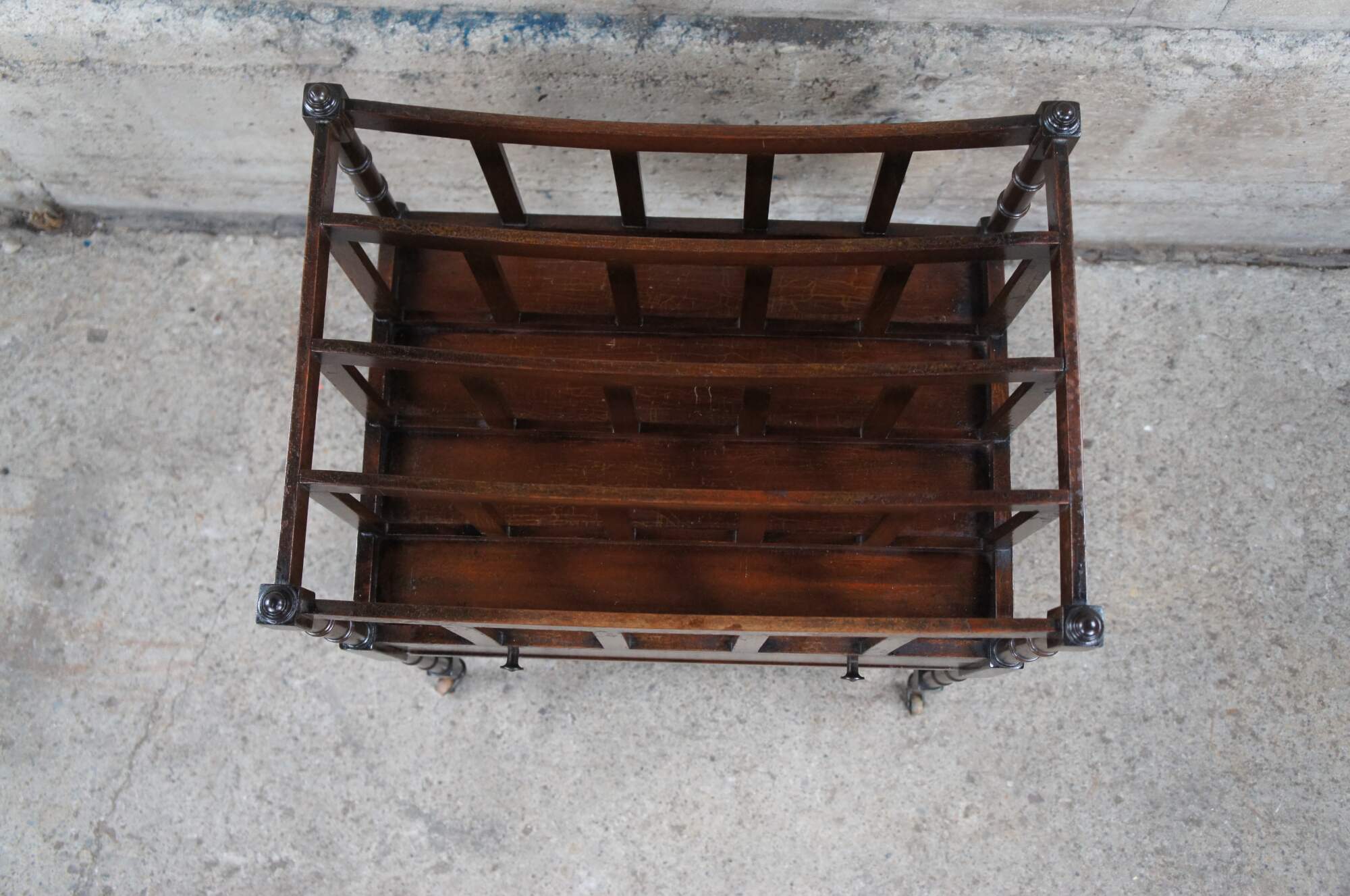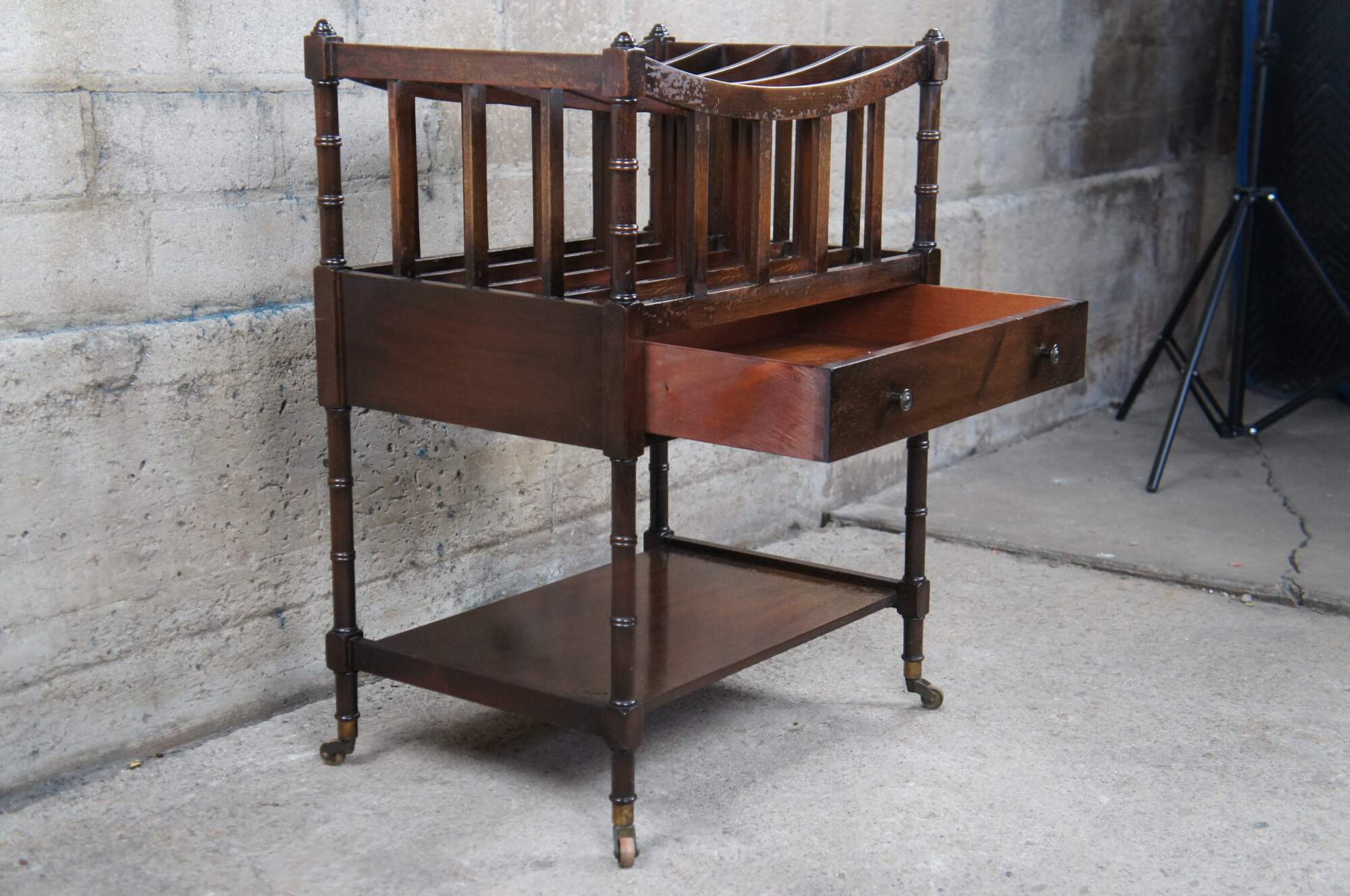 Circa 1940s English Regency/ Campaign style magazine rack. An unsual form with extended legs allowing for a more comfortable height with a lower shelf. Made from mahogany with bentwood divisions allowing for four nice sized sections. The stand is supported by bamboo shaped supports with a central dovetailed drawer and brass capped feet and casters.