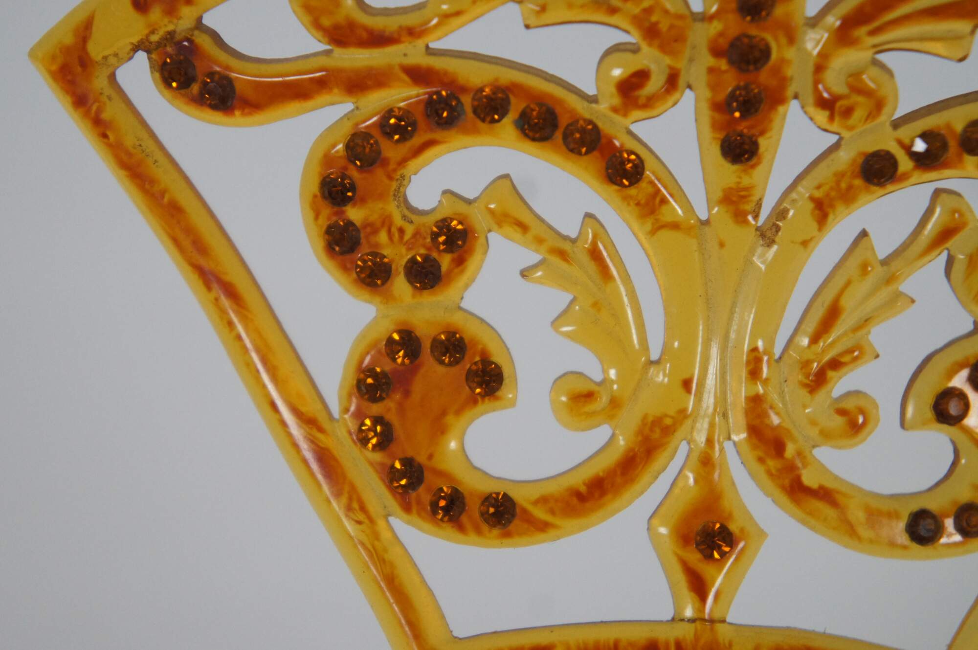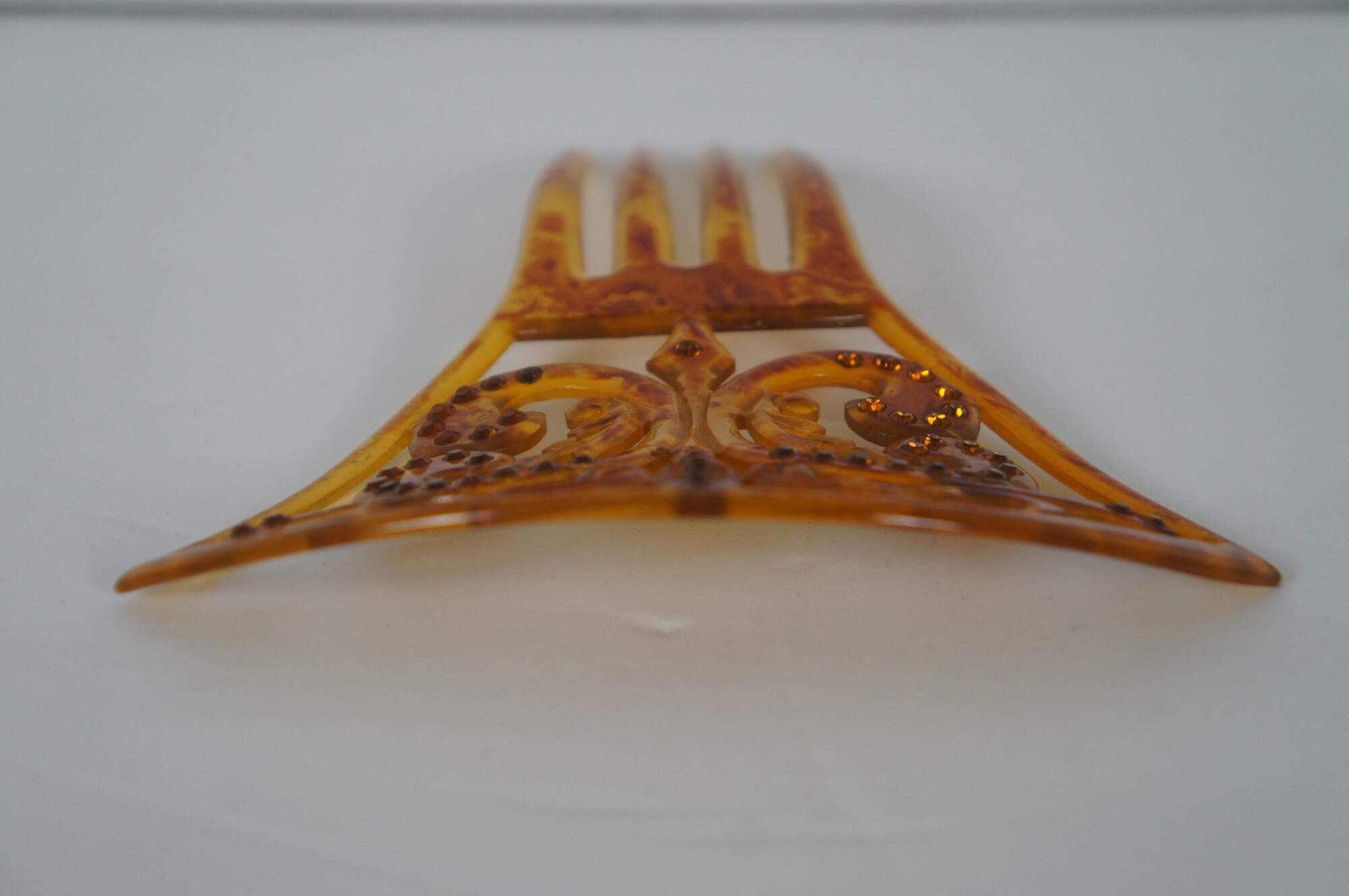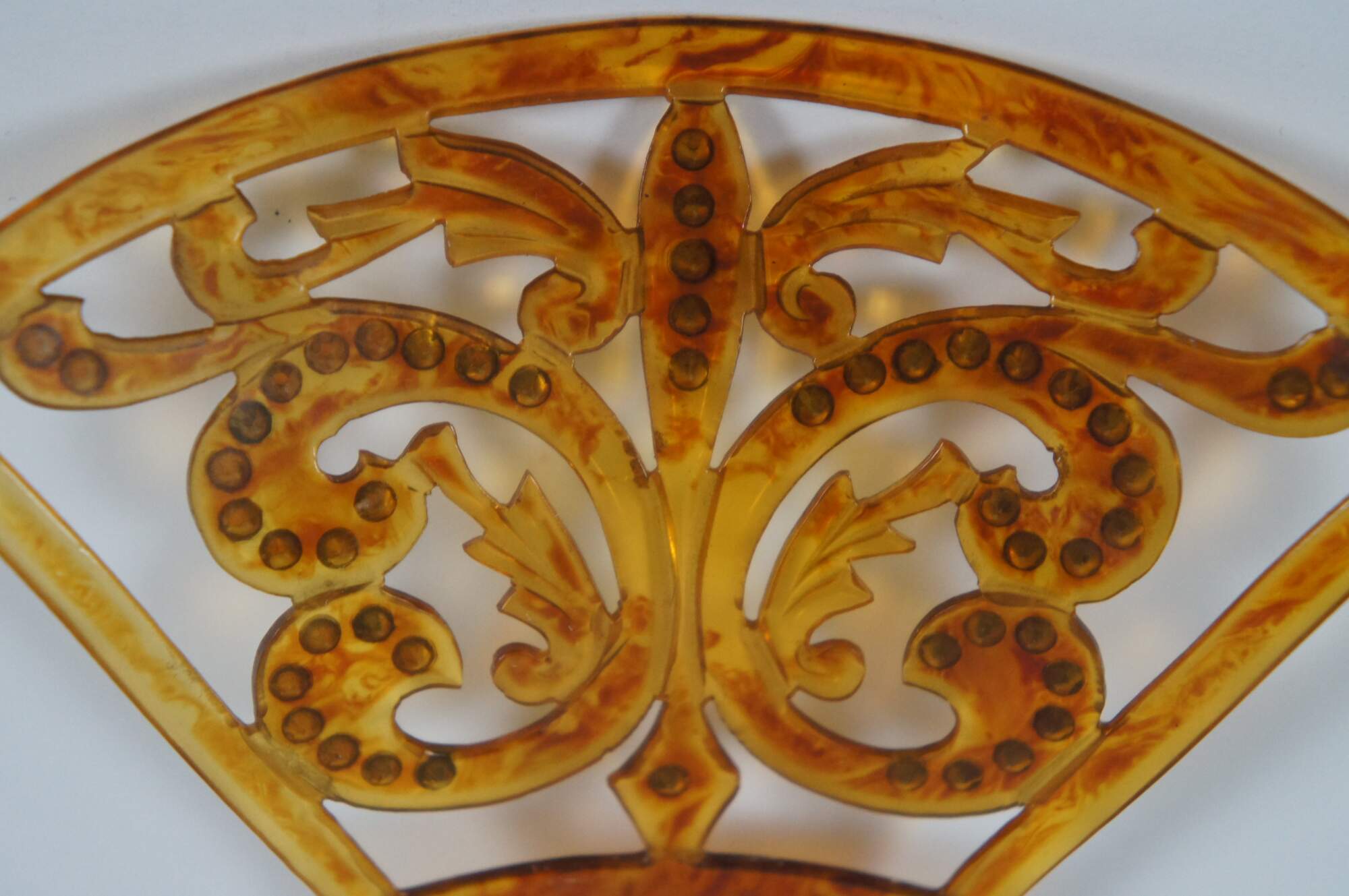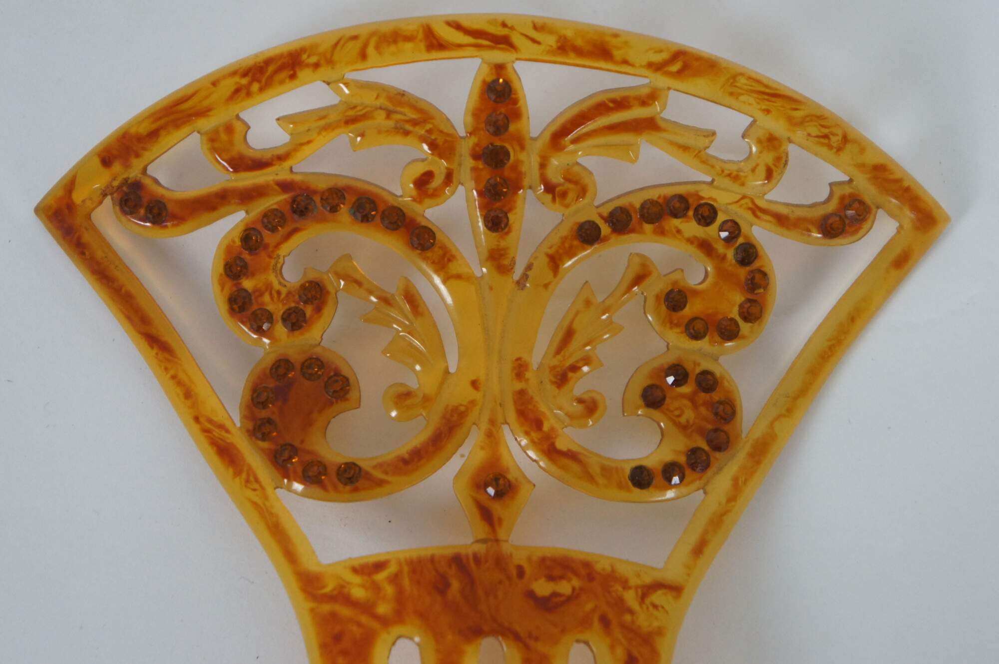 Antique faux tortoise shell celluloid hair comb / opera comb with mantilla style fan shape around a carved foliate pierced / reticulated middle resembling a fleur de lis that is decorated with amber rhinestones.