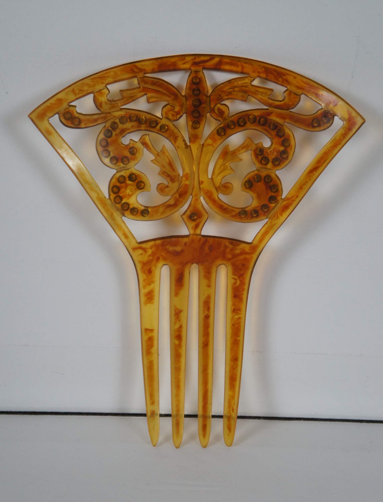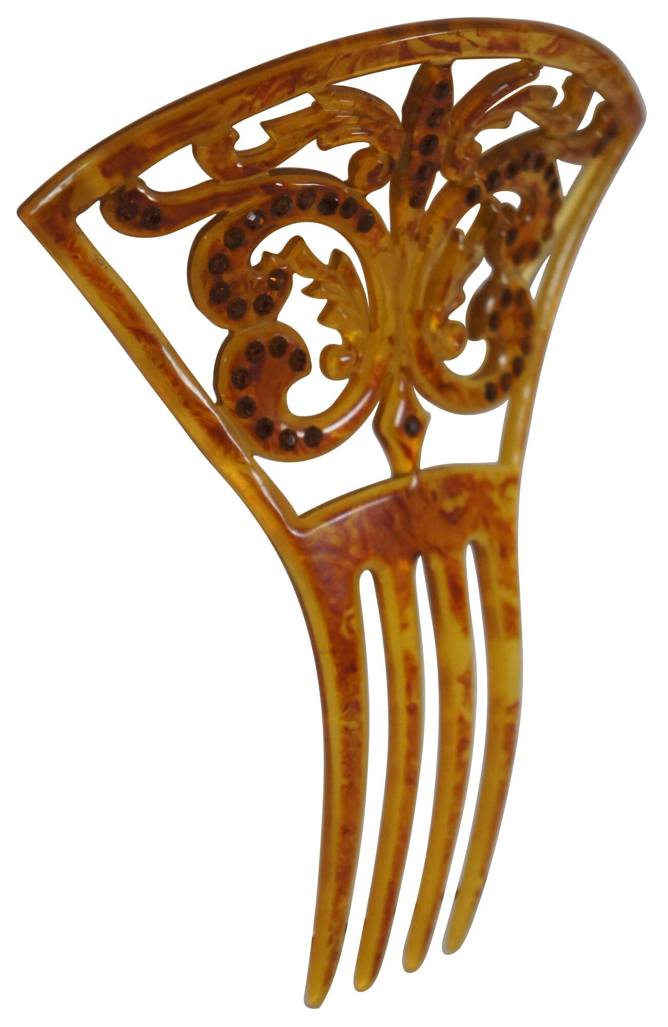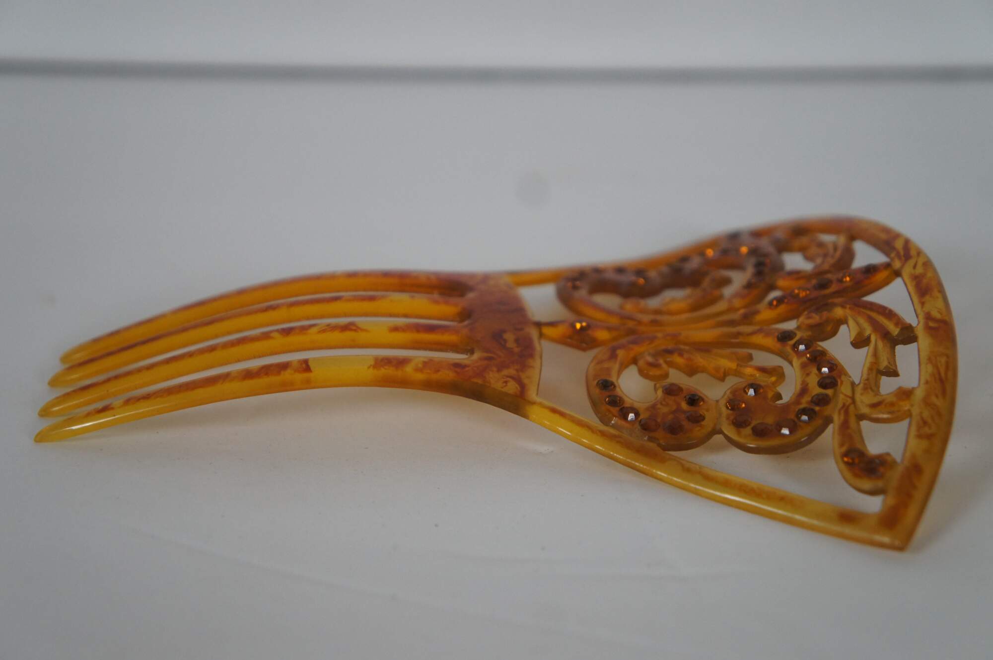 Antique faux tortoise shell celluloid hair comb / opera comb with mantilla style fan shape around a carved foliate pierced / reticulated middle resembling a fleur de lis that is decorated with amber rhinestones.