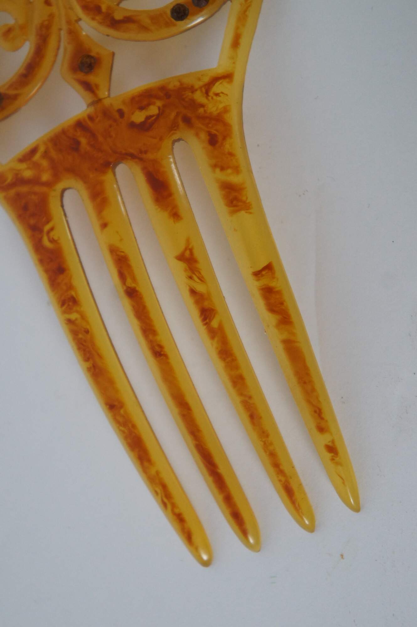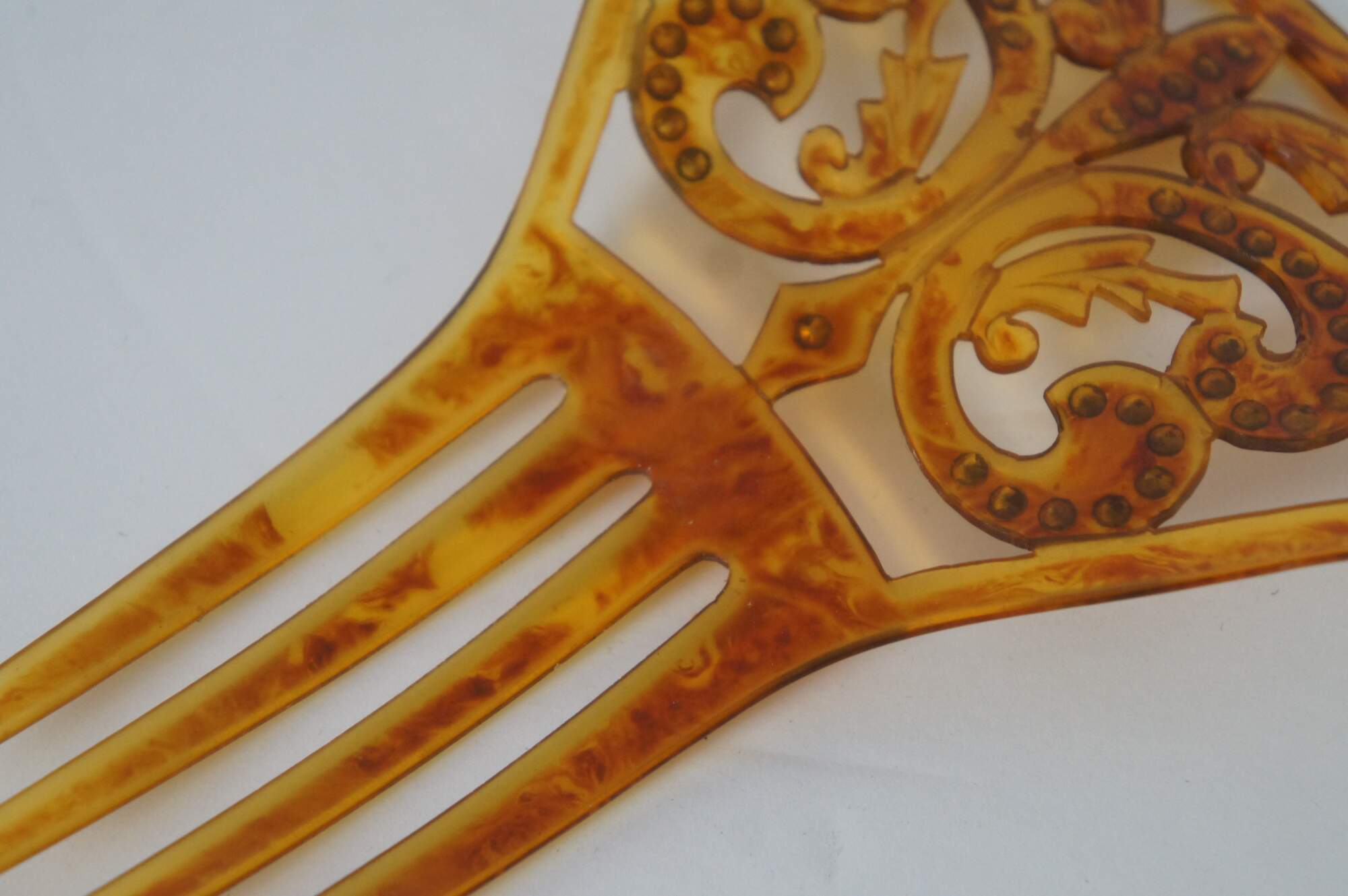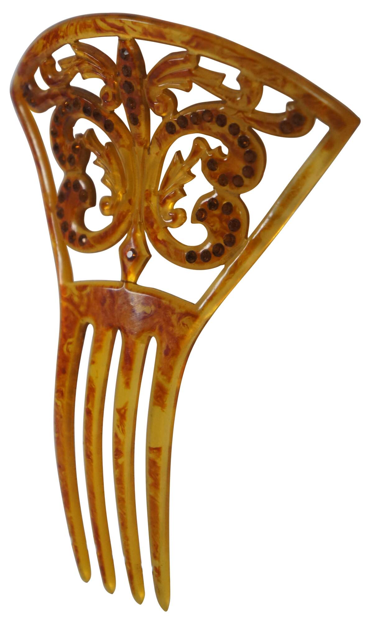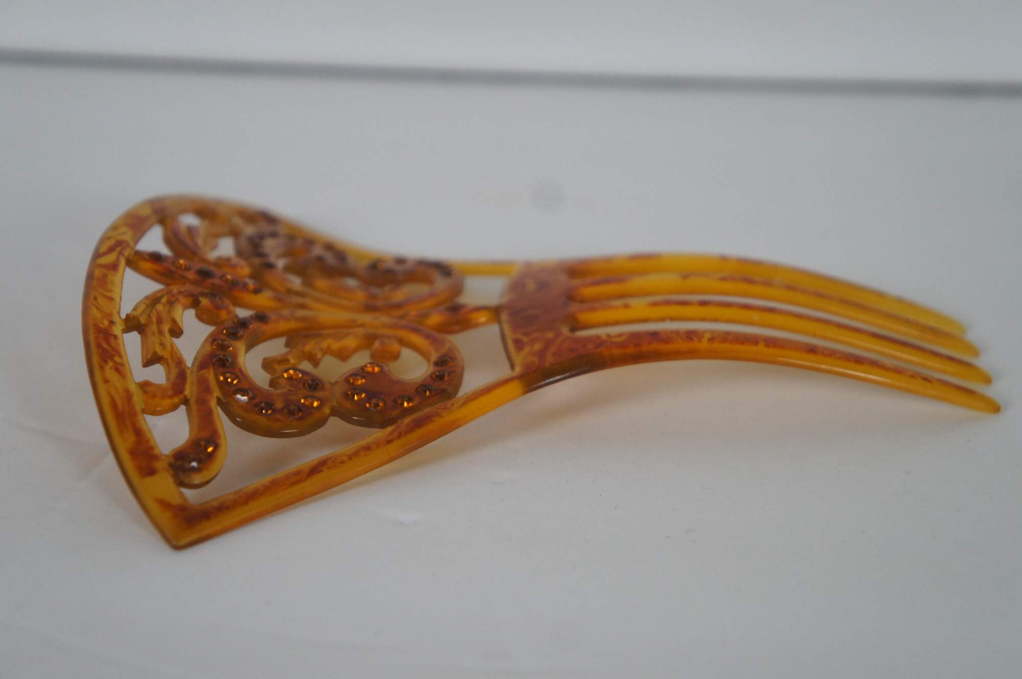 Antique faux tortoise shell celluloid hair comb / opera comb with mantilla style fan shape around a carved foliate pierced / reticulated middle resembling a fleur de lis that is decorated with amber rhinestones.