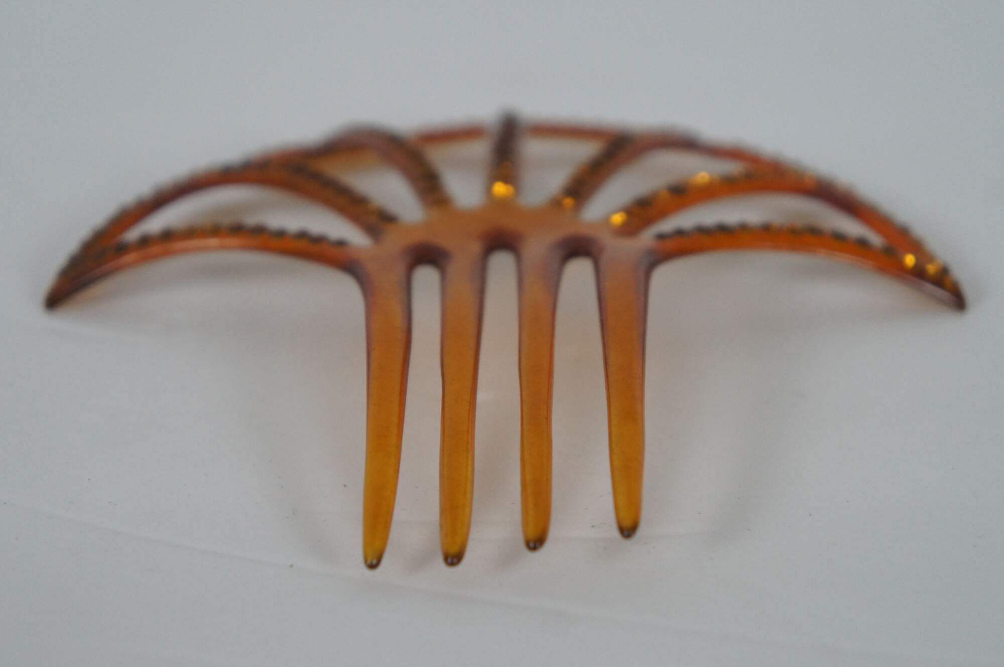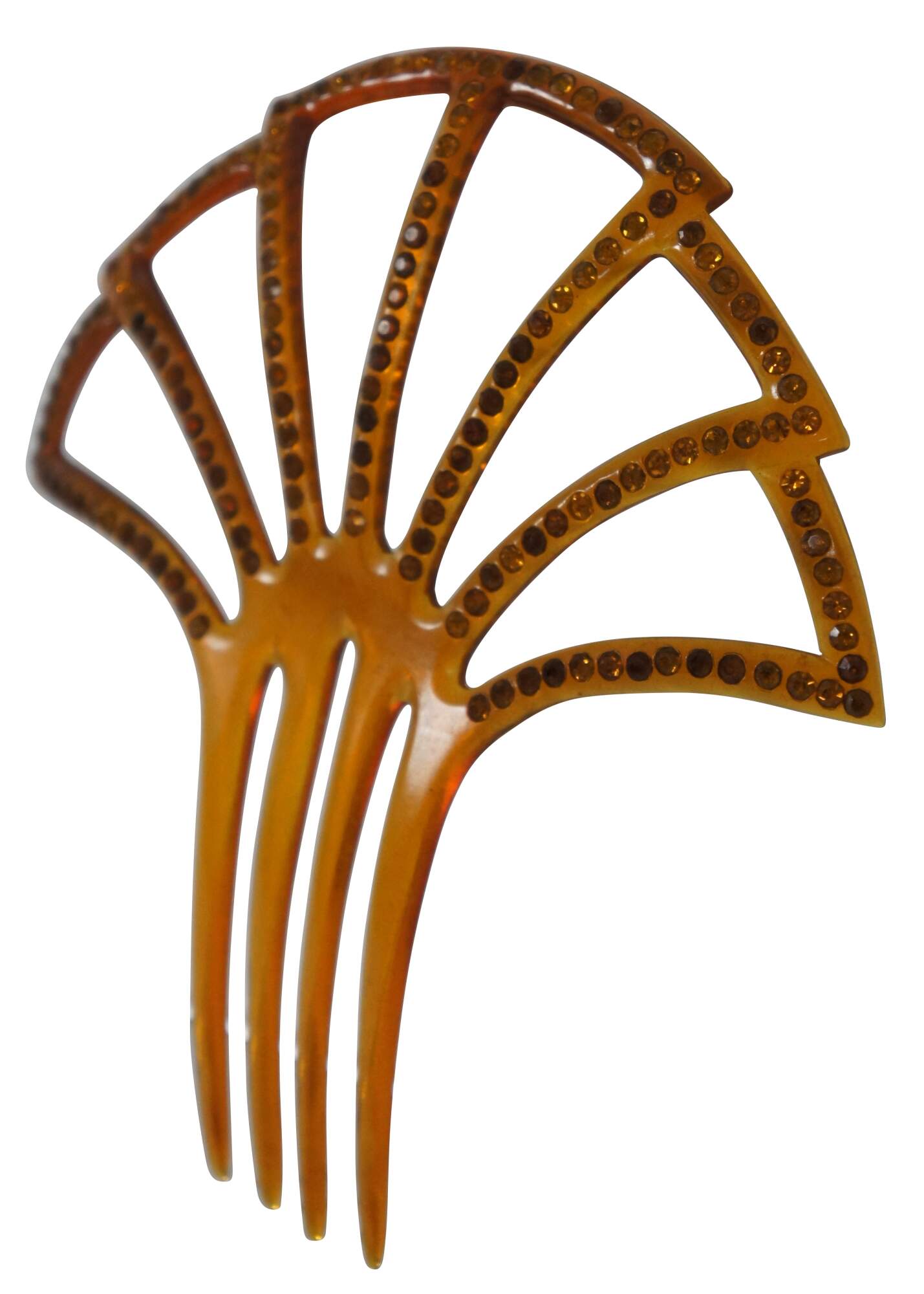 Antique art deco amber celluloid decorative hair comb with pierced fan shape decorated with amber rhinestones.