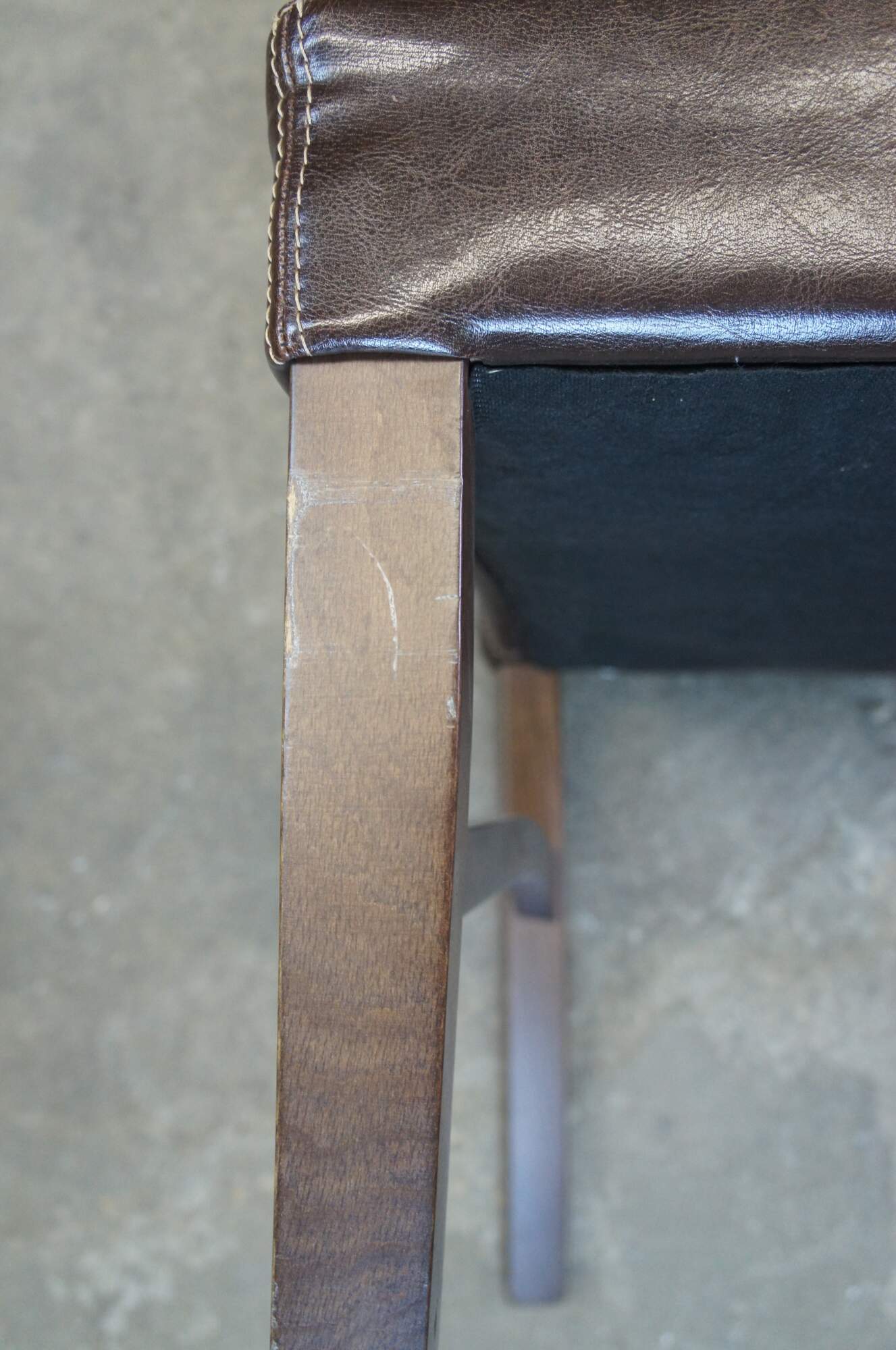 6 Arhaus Capri Dining Chairs. Each stool features a bowed crest rail with padded backrest and seat upholstered in a brown faux leather. They stand on brown stained tapered legs with shaped box-stretchers.