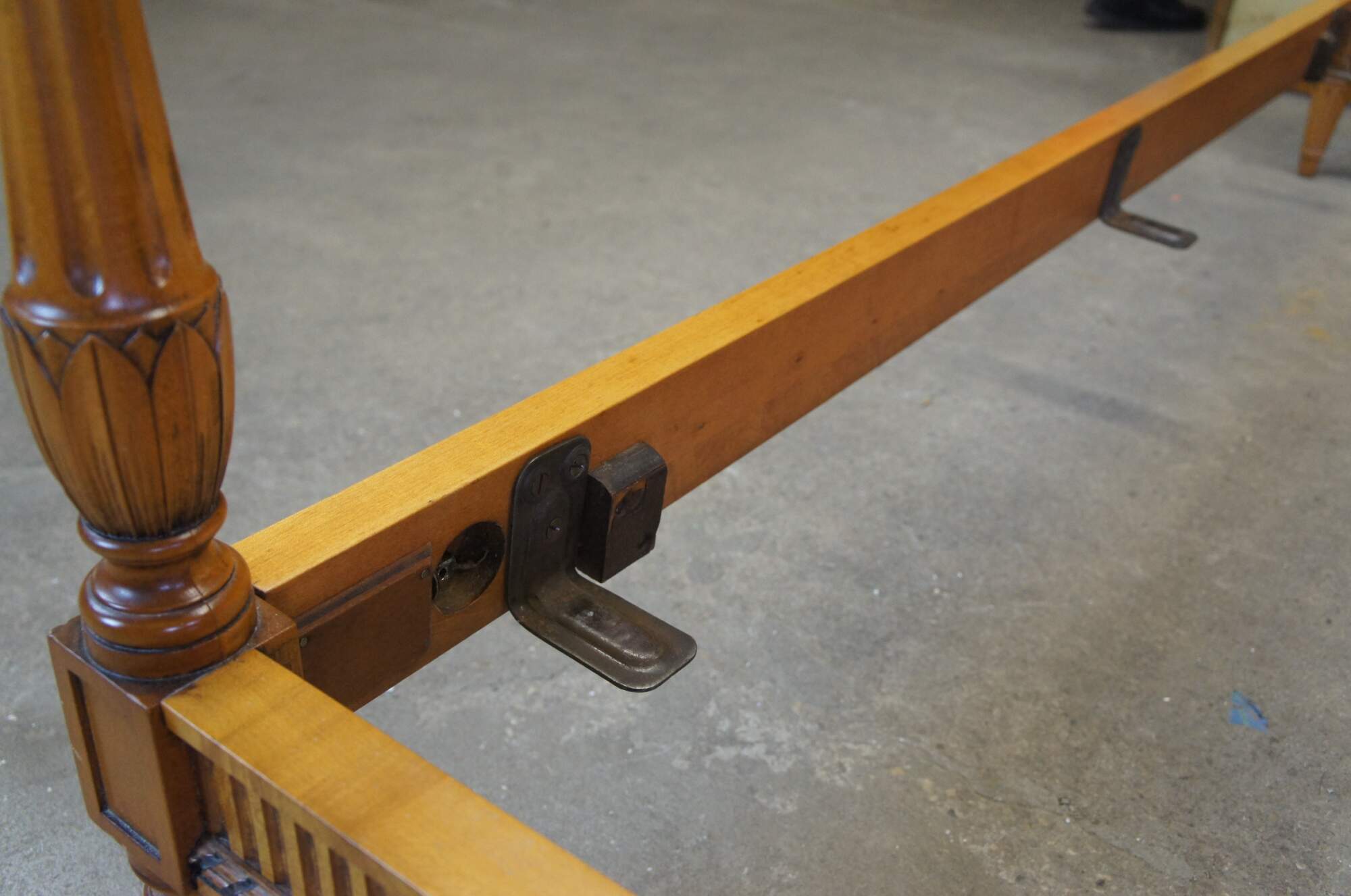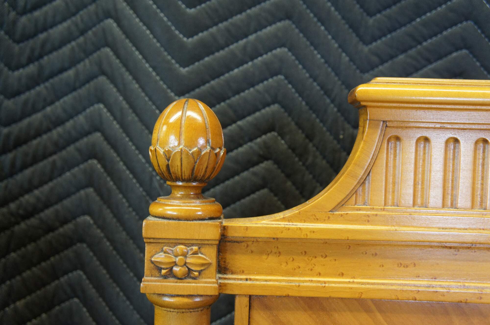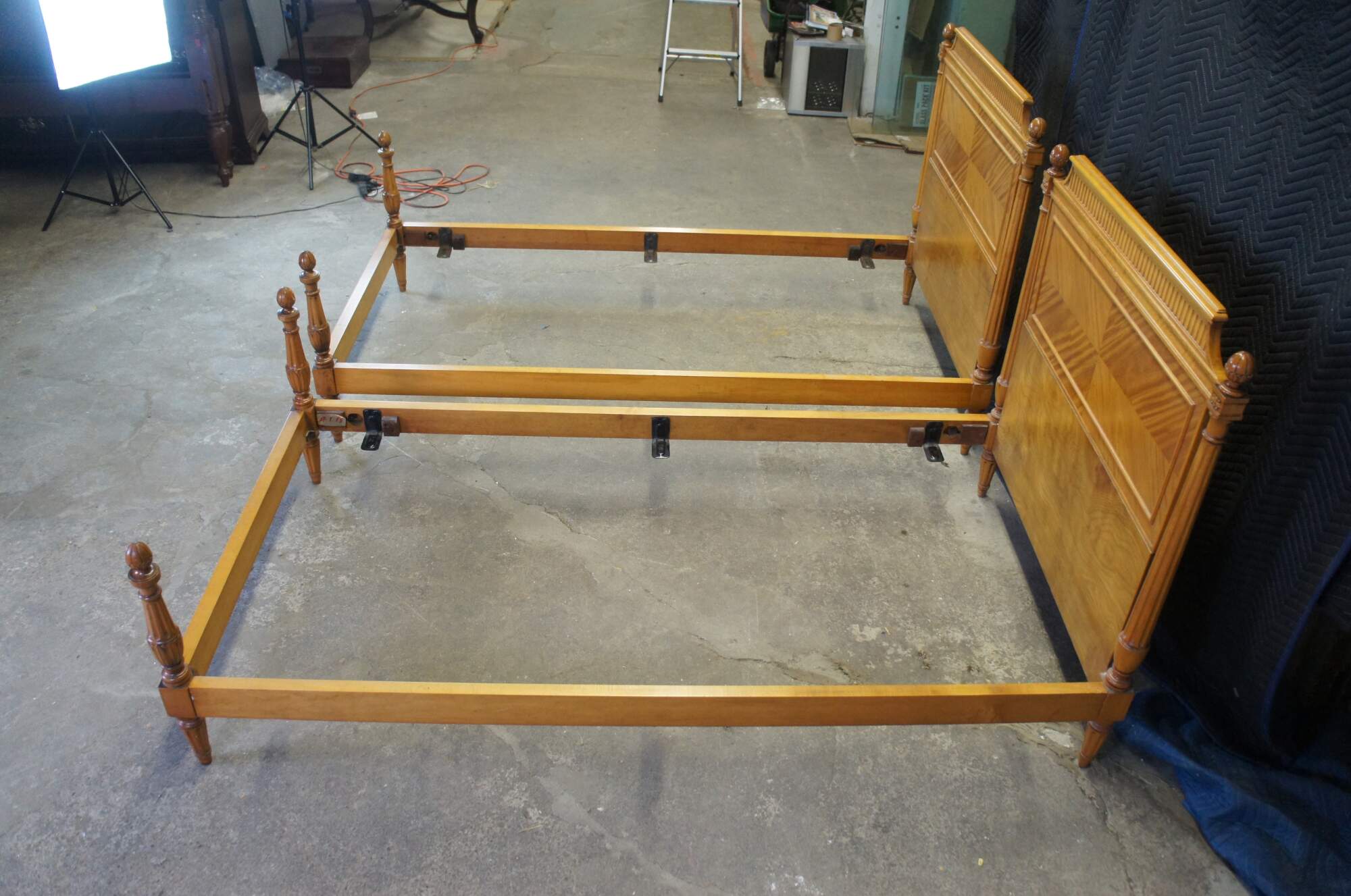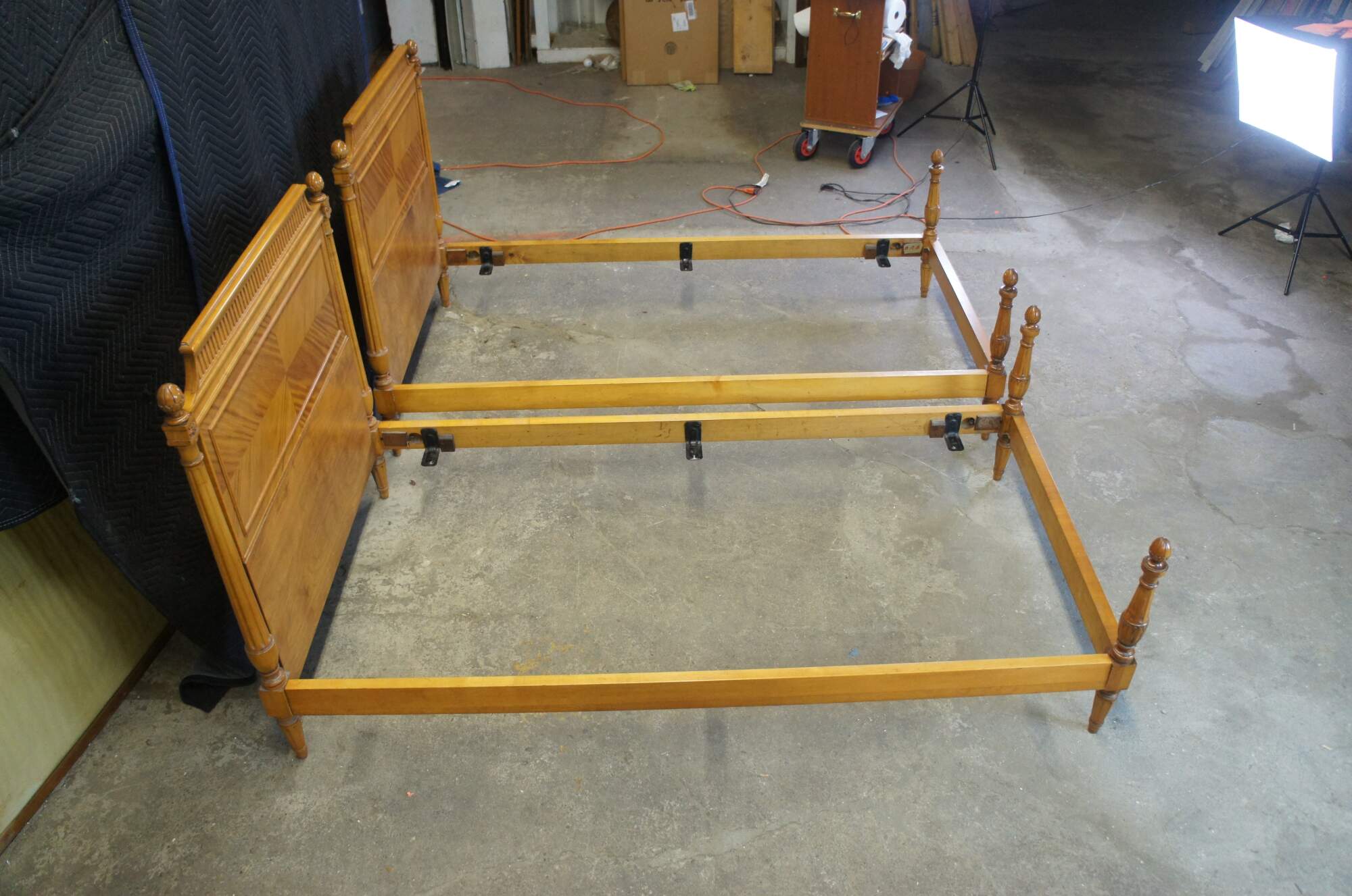 An exquisite pair of antique French Louis XVI Neoclassical bed frames by Robert W. Irwin Furniture Company, Circa 1928-1940. Crafted from satinwood featuring turned and fluted columns, artichoke finials, fluted head and footboard and turned tapered feet. The headboards have an eye catching matchbook veneer design fitted with a rectangular molding.