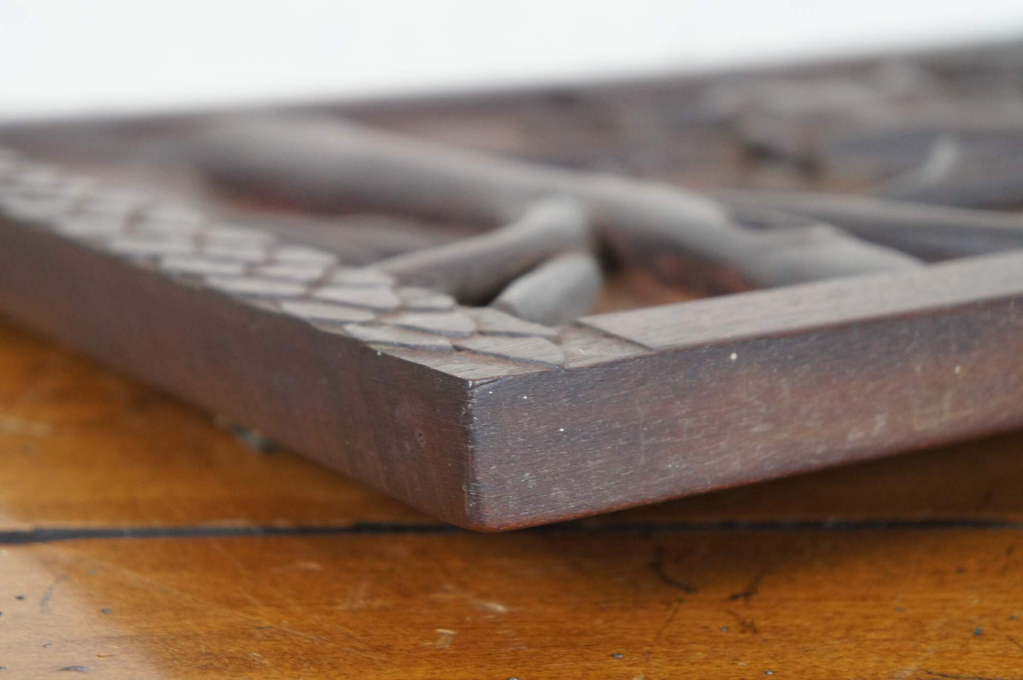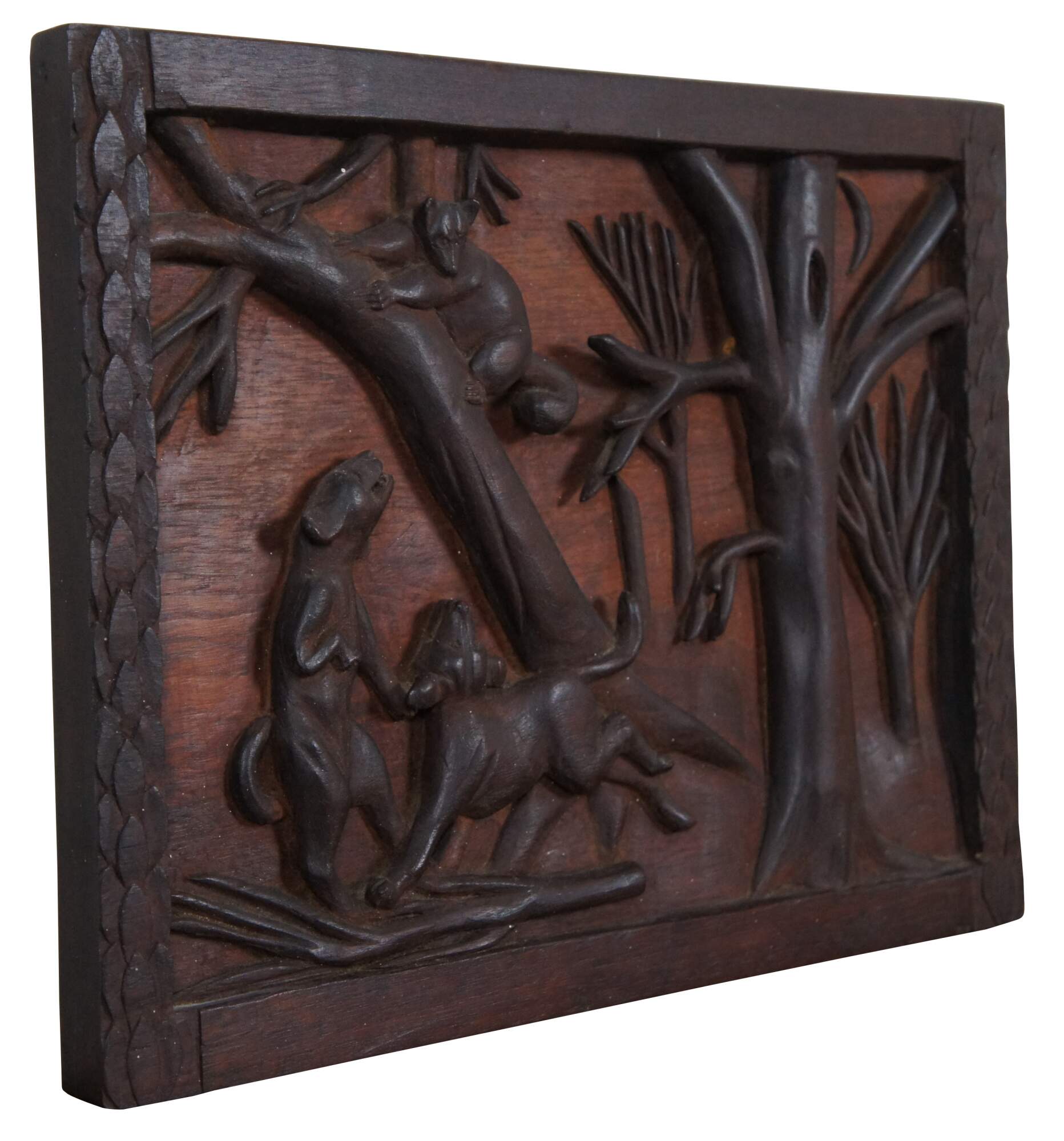 Vintage carved wood high relief hunt plaque showing a moon lit forest landscape with two dogs chasing an animal (red panda, badger, lemur, raccoon?) up a tree.
