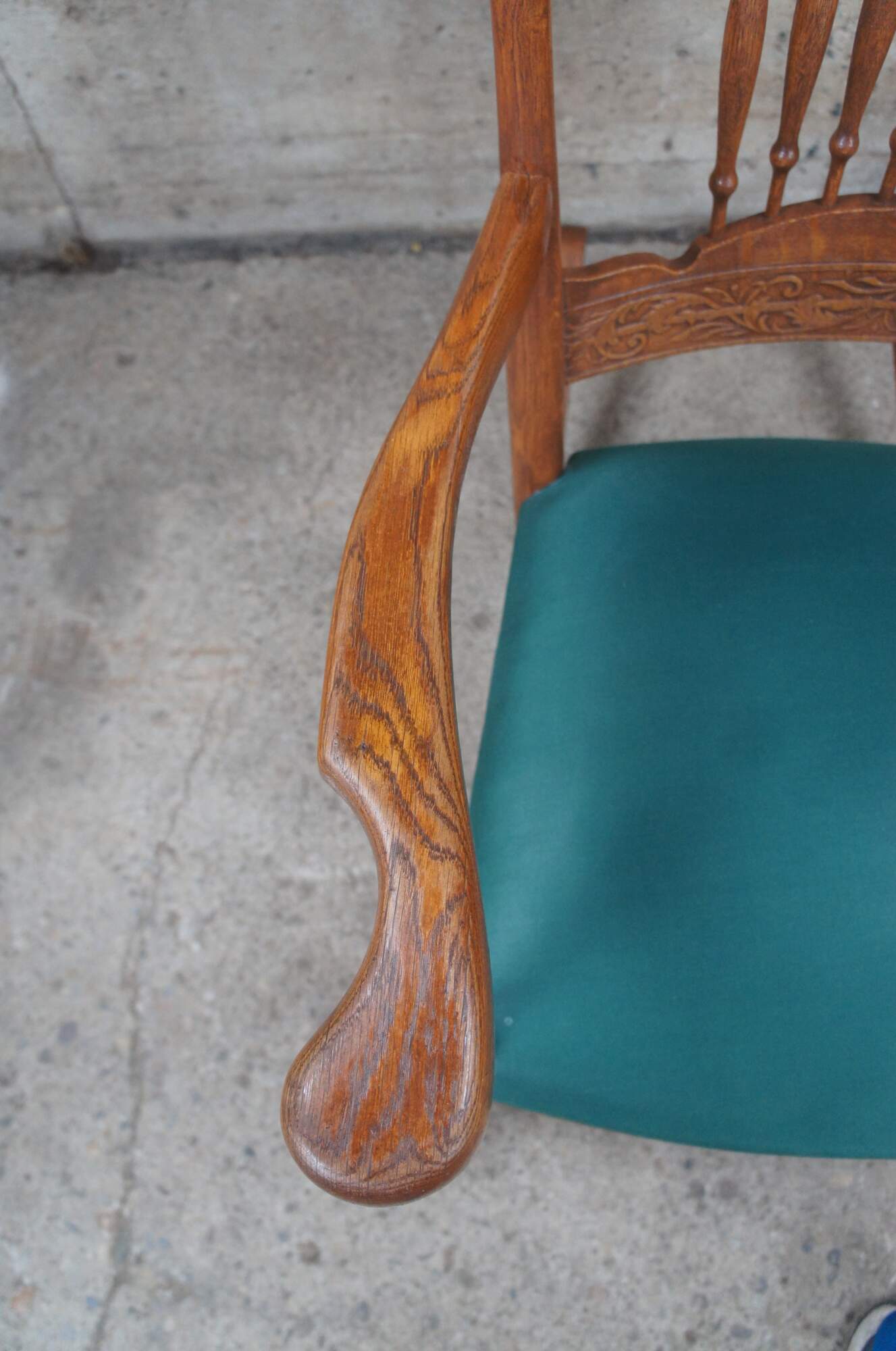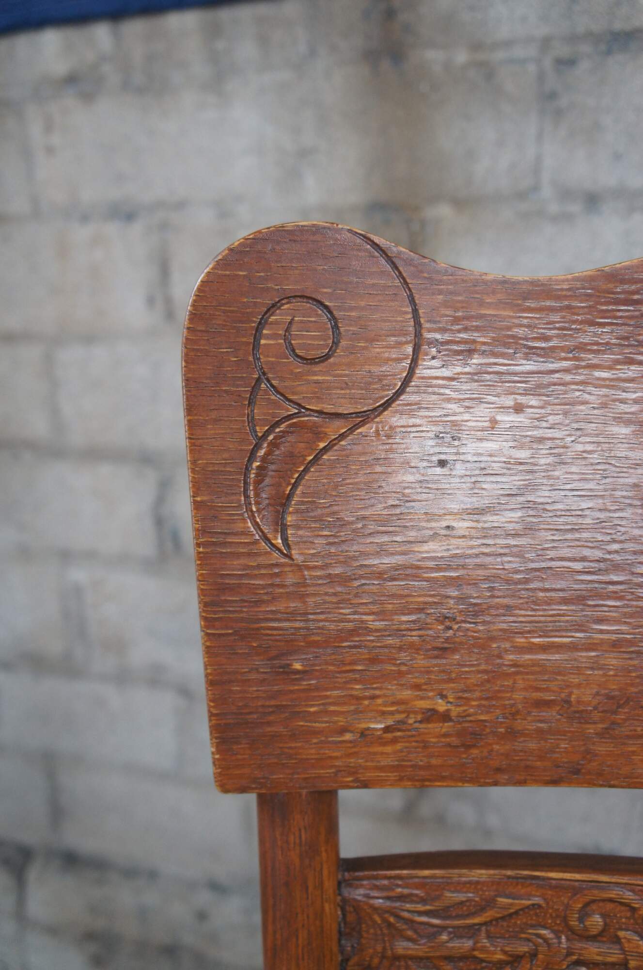 Antique late Victorian pressback rocking chair. A beautiful design featuring a serpentine crest rail with a laurel wreath wrapped cameo at the center featuring a distinguished gentleman. The cameo is flanked by decorative engravings along the shoulders of the back and perfectly placed over an elegant serpentine cut stretcher of filigree foliate. The back of the chair is centered by seven turned spindles leading to a matched stretcher towards the lumbar area of the back. The chair features contoured arms and an upholstered seat. The front apron shows a matched design to the back and is placed between turned posts leading down to a long rocker base.