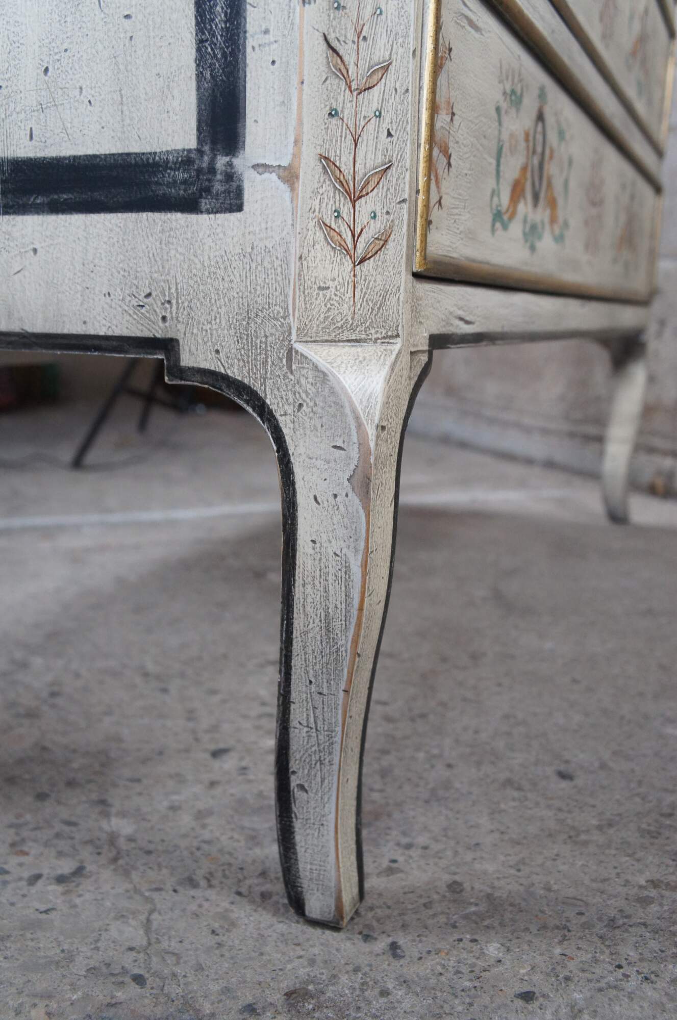 The feeling and beauty of Tuscany is slowly and faithfully reproduced by Grand Rapids hand decorators. This transitional chest is made from Cherry and finished in a rustic white with antique Gold Leaf trim, faux marble top and Tuscan Decoration. Features a rectangular frame of three dovetailed drawers with chamfered corners raised over four cabriole legs. Each drawer opens and locks via key. A versatile furnishing great for use as an entryway chest, console, tv/ media stand or dresser. Circa late 20th century.
