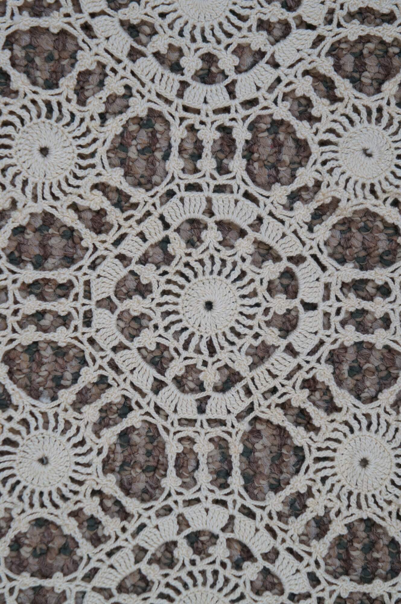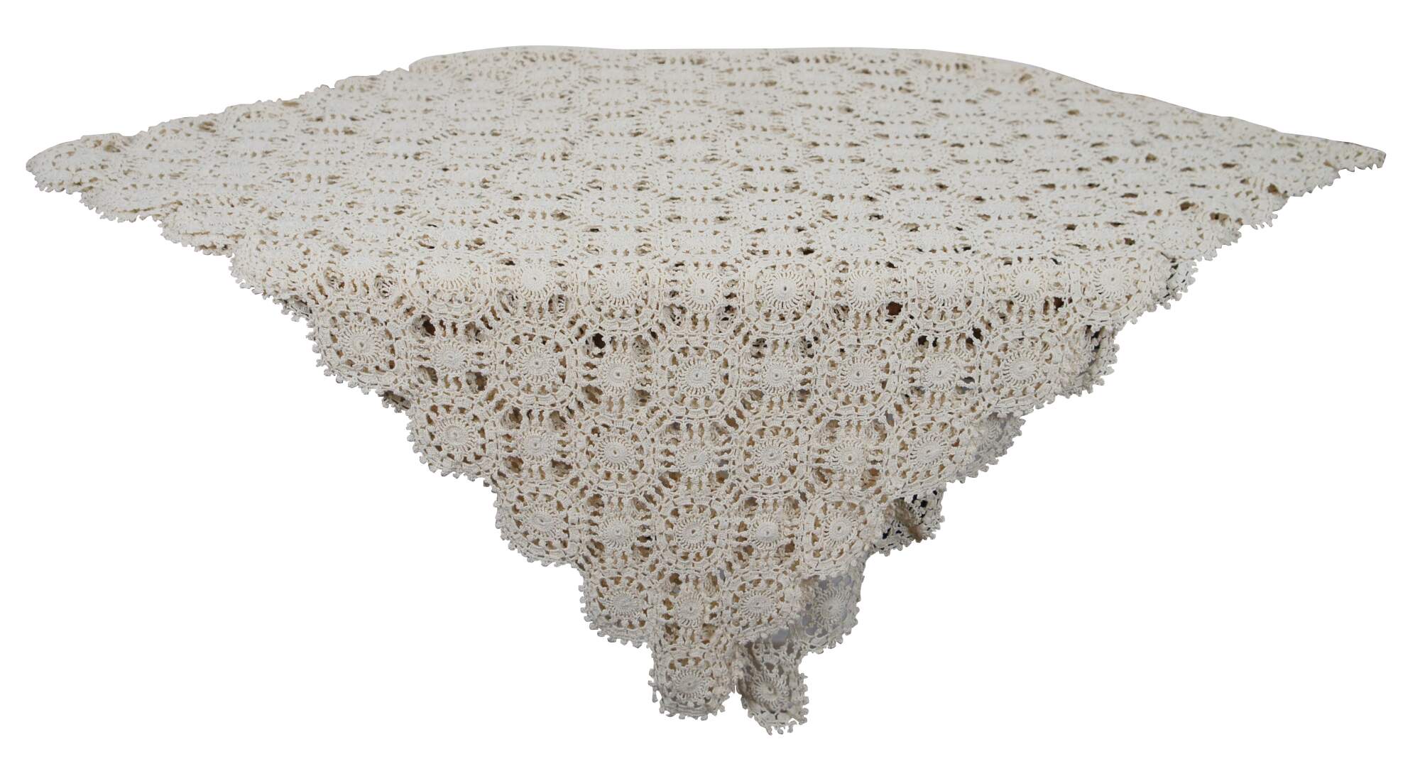 Vintage off-white handmade crochet tablecloth or coverlet, 72” square with scalloped edges featuring a pattern of geometric floral medallions.