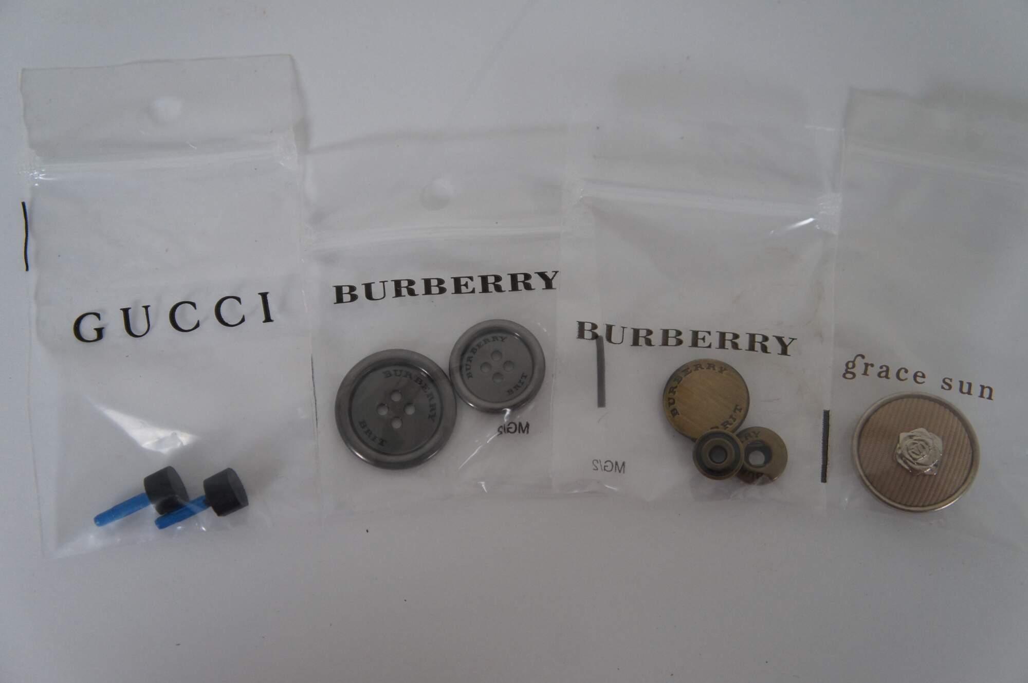 Lot of 33 set of assorted 100% Authentic packs of spare buttons, fabric swatches / patches, thread and shoe heels from a variety of designer clothing items. 4 Prada, 14 Chanel, 1 un-marked, 1 Zara, 1 Dolce & Gabbana, 1 See by Chloe, 1 Gucci, 2 Burberry, 1 Grace Sun, 7 Marc Jacobs.